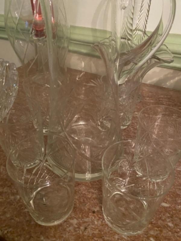 Collection of anti-glassware with pitcher and glass at, glass flower basket, cut glass bowl, hurricane globes with candle sticks, punch bowl in candlewick style, large serving plate with oval matching silver inlay