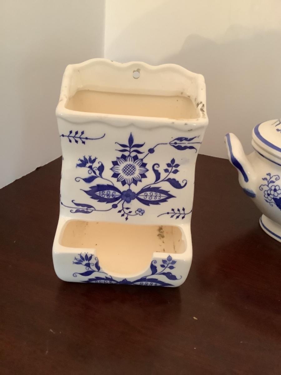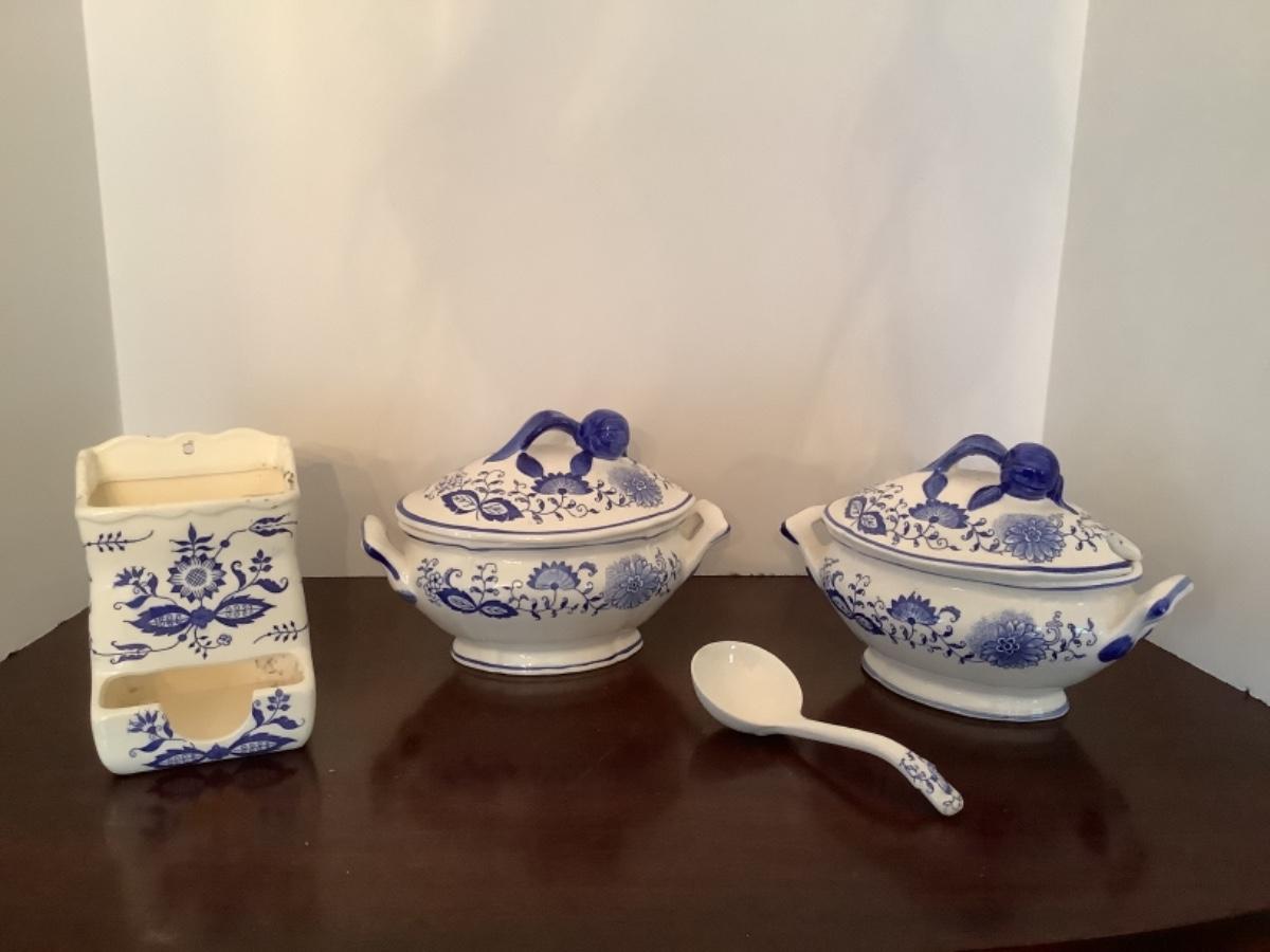 D596 Pair of Blue Onion Small Tureens & Match Holder