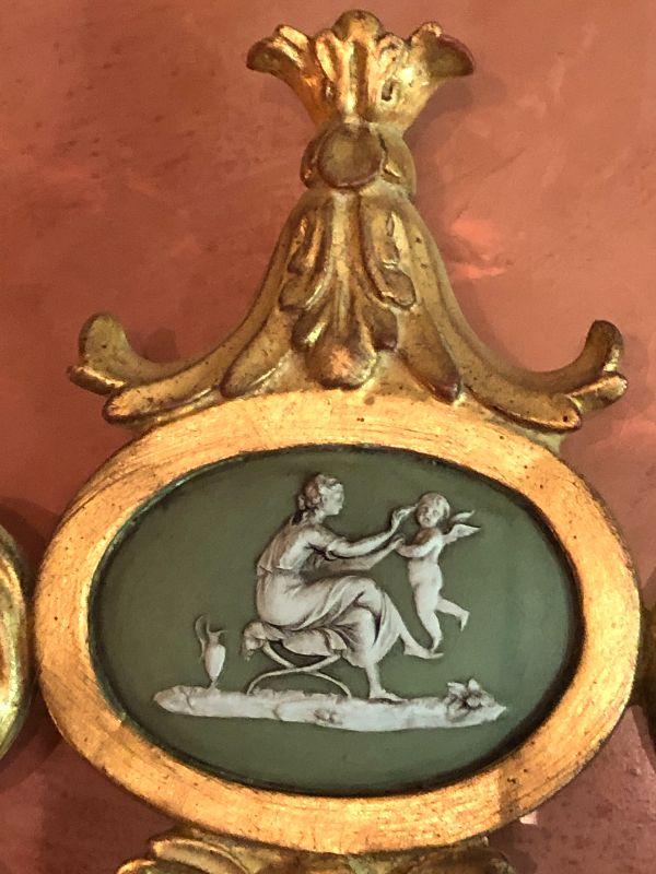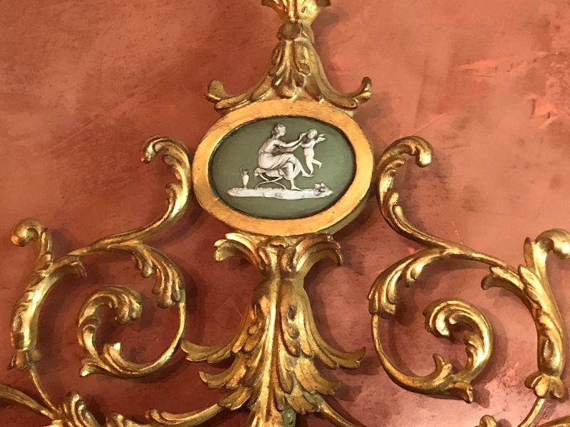 Stunning 3 feet tall gold gilt mirror adorned with a cherub painting and scrolled carved accents! Please see the pictures of this beautiful piece that hung over the antique sideboard in dining room!