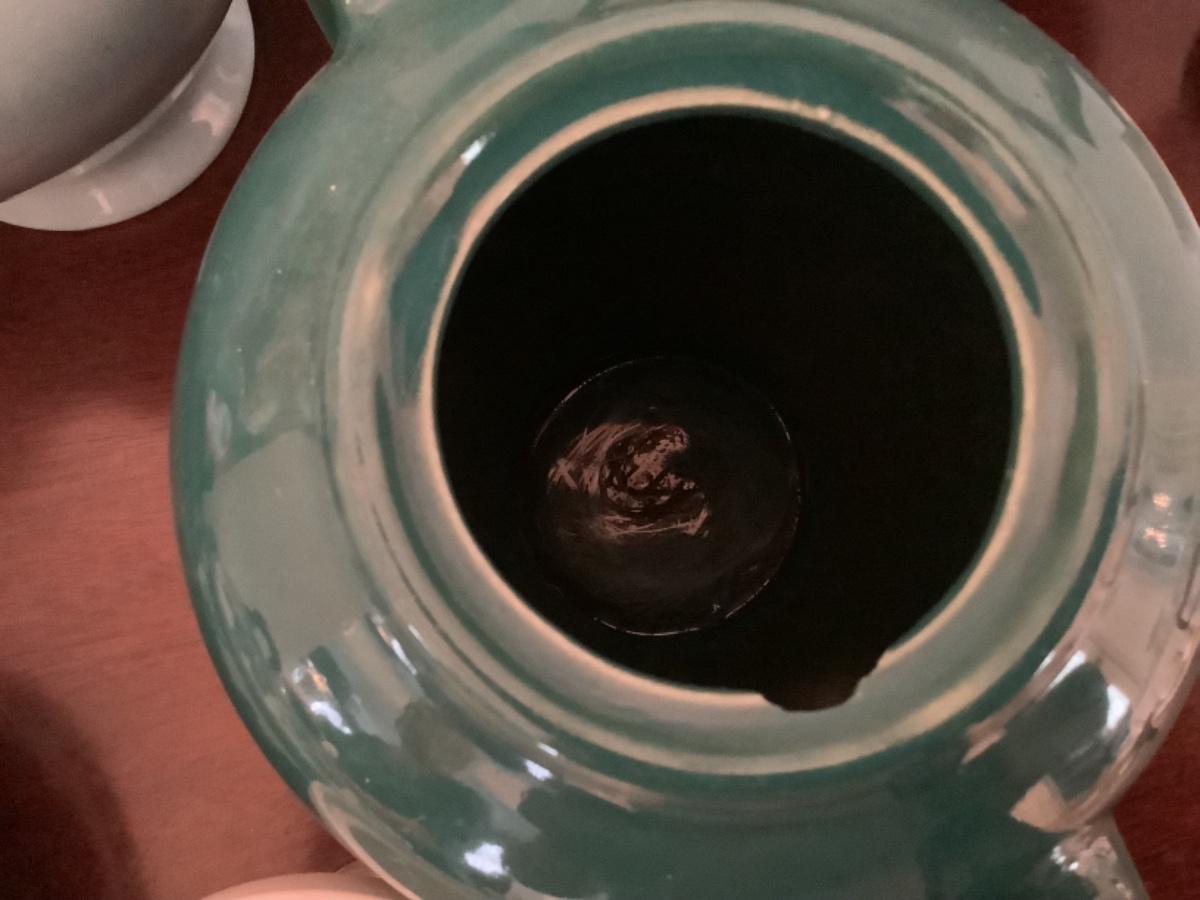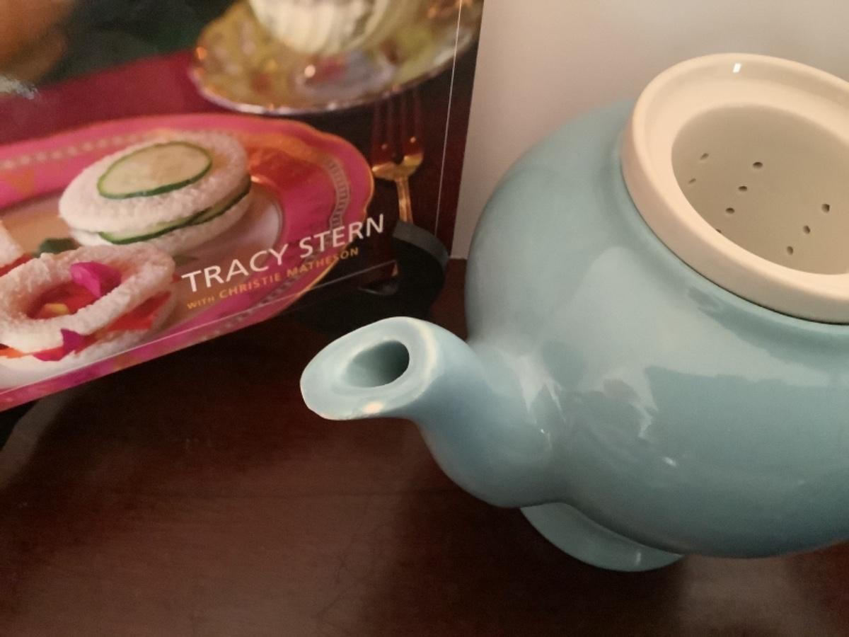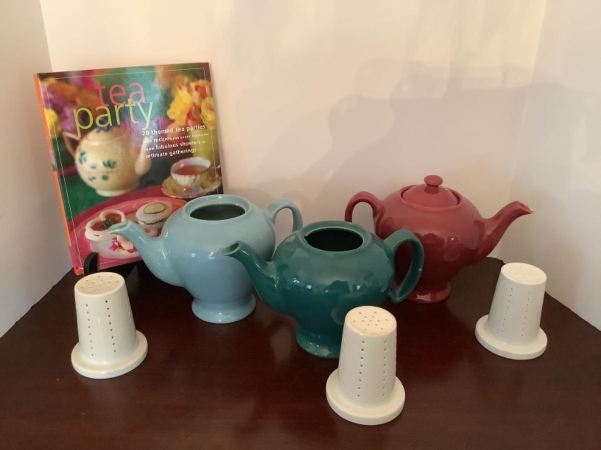 2 pots do not have a lid , all three have a diffuser, burgundy pot has a chip on spout, green pot has a chip on inside rim, aqua blue has a chip on spout, with tea party book
