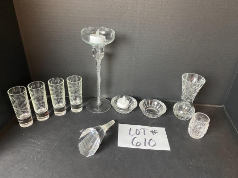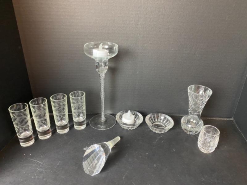 Etched Glass Lot with a Waterford shot glass and two Val st. Lambert votives, Oleg Cassini stopper
