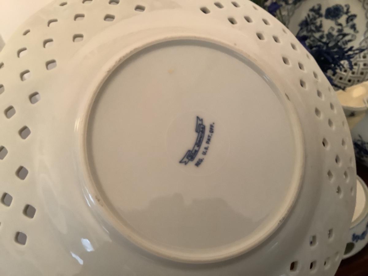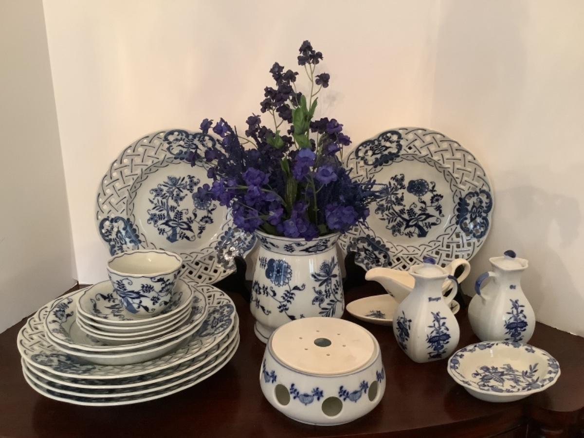 Oil / Vinegar, soap dish, 6 dinner, 1- teacup, 4-fruit bowls, 2 soupbowls, 1 jardinere, 1 German gravy boat with windmills, blue onion teapot stand