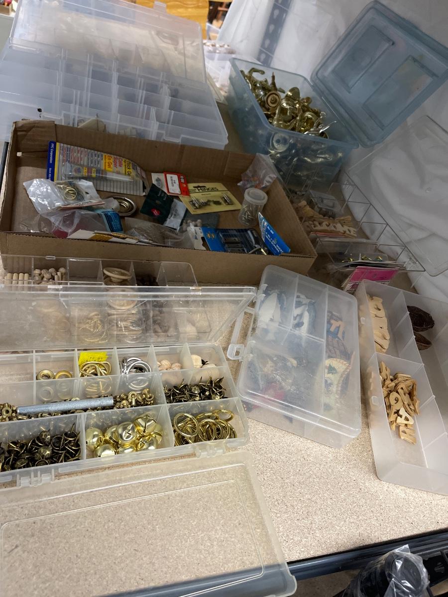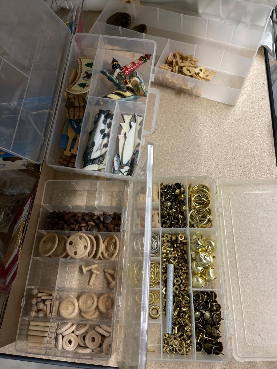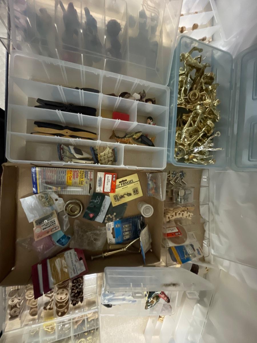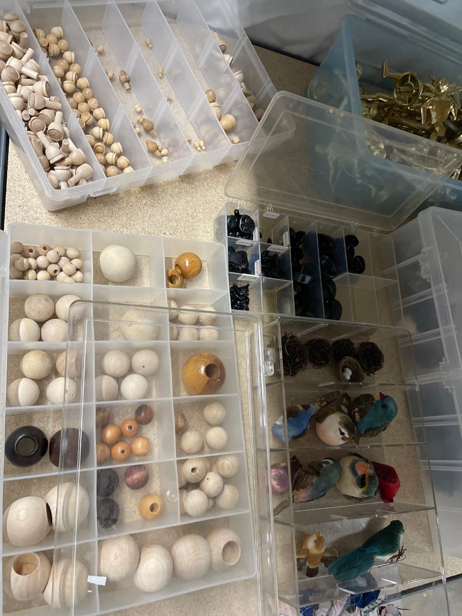 Miniature birds, butterflies, nests, wooden beads/stoppers. Plastic noses, trophy toppers, miscellaneous hardware, propellers, sailboats fish and other minis