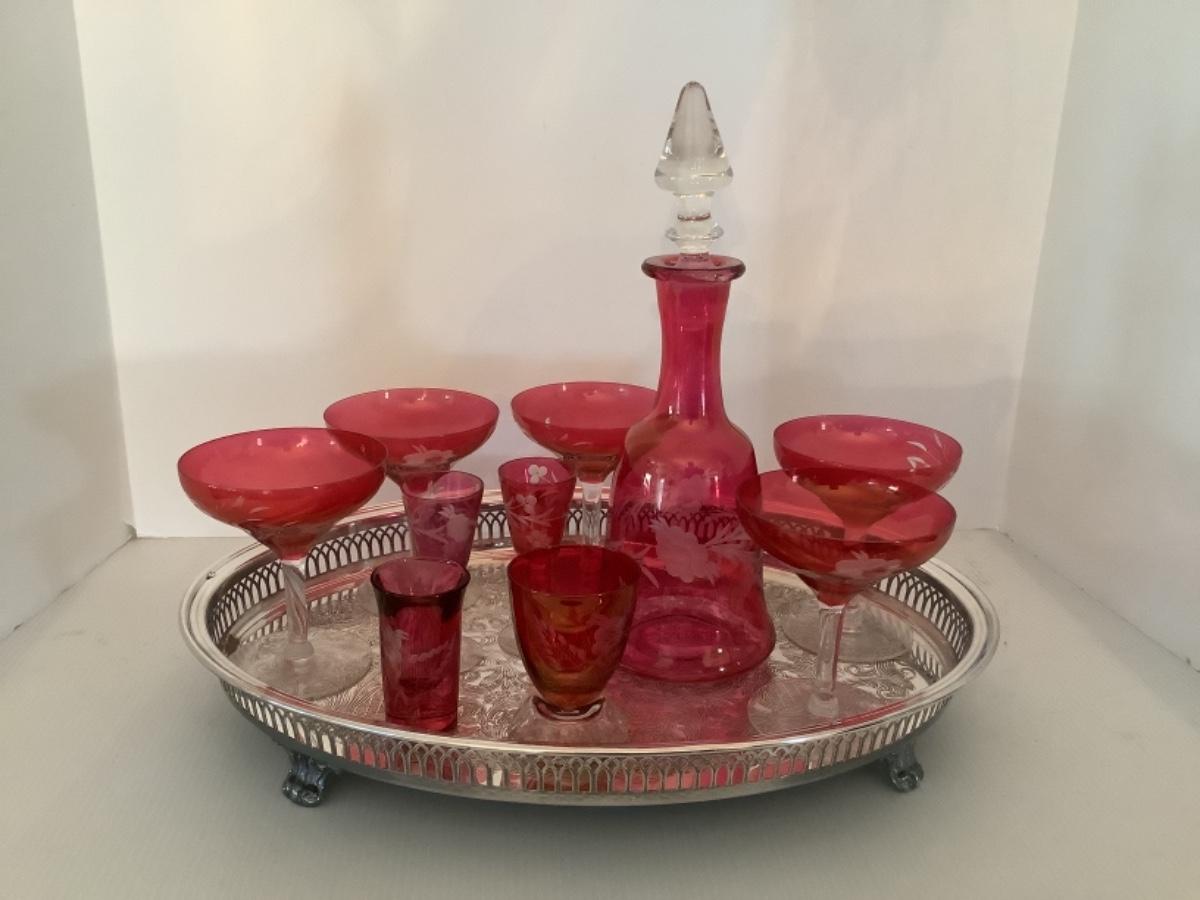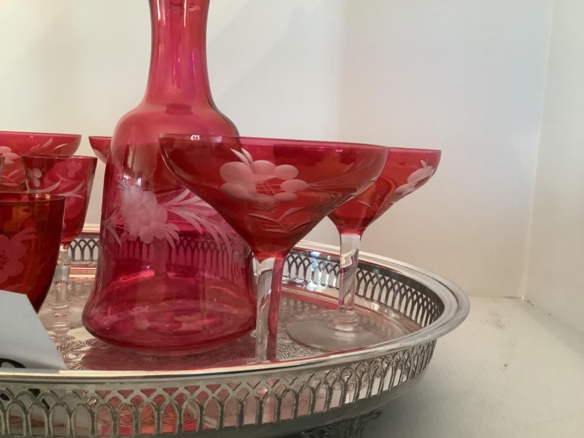 Ruby Flash Decanter with 5 goblets on silver plated footed oval tray , with 2 cordials