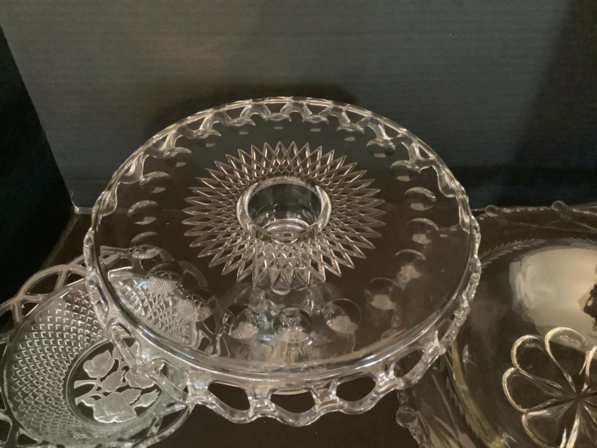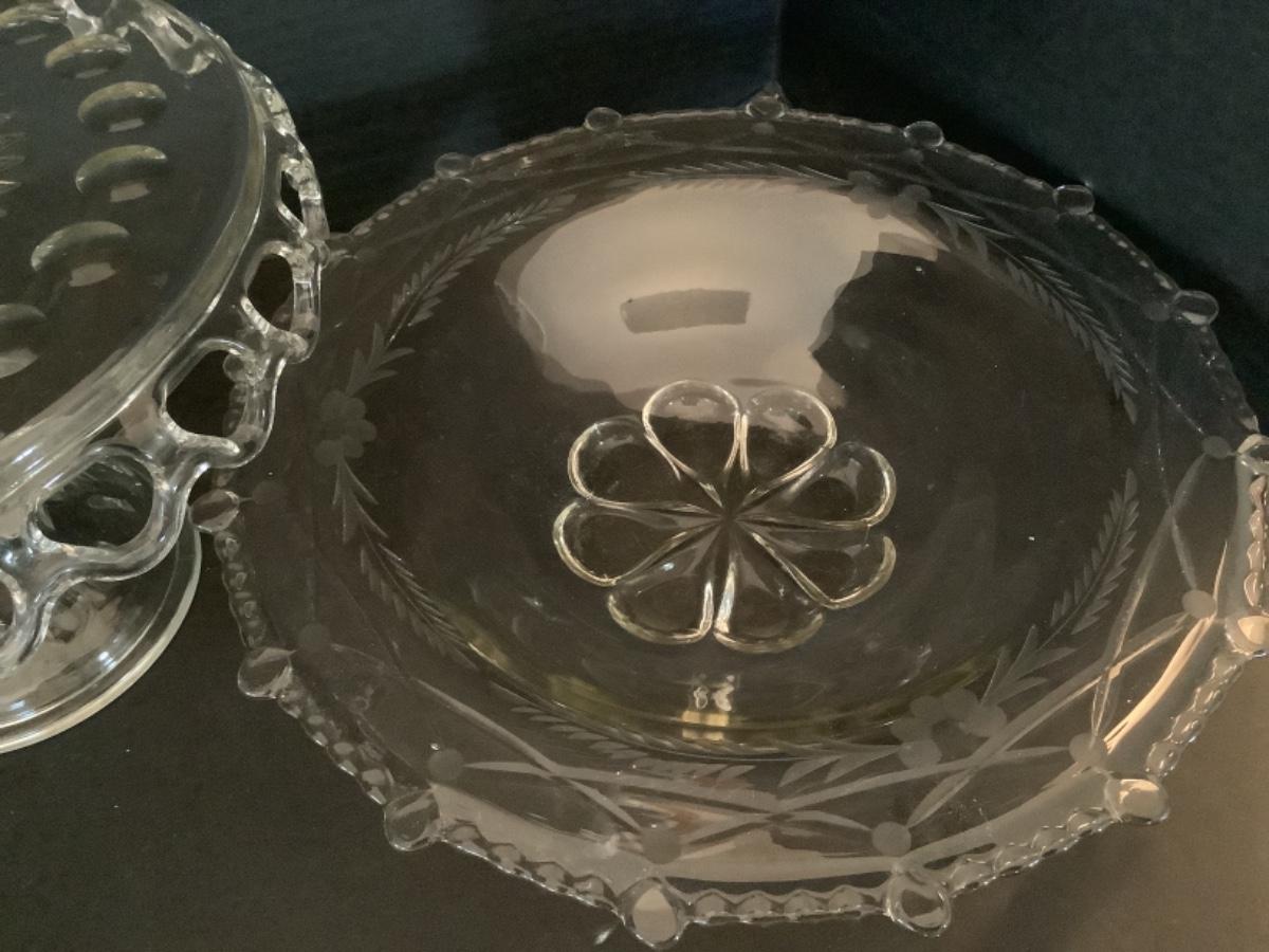 Measures 10” round x 7” high with sm bowl, covered square dish and large etched bowl, with large bowl approx 13.5” round