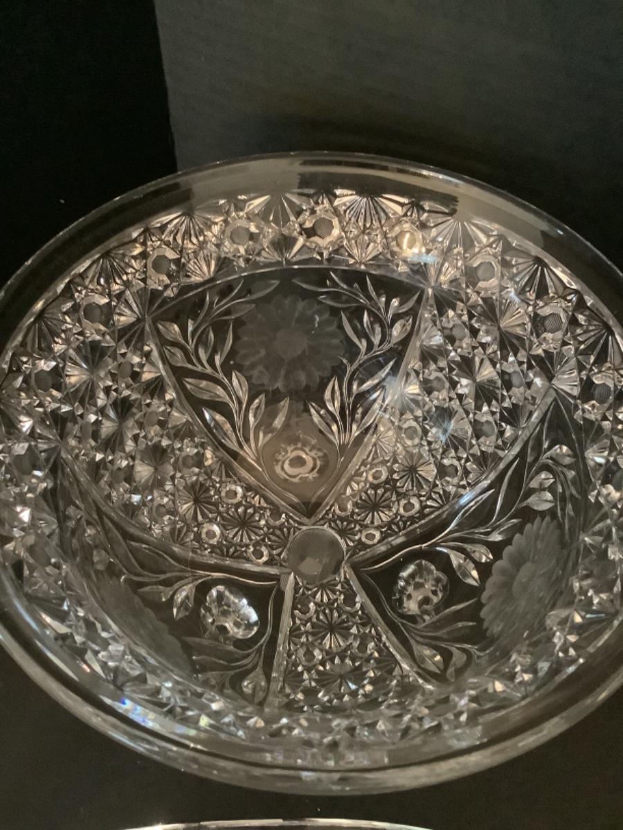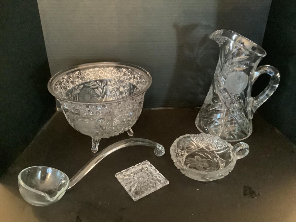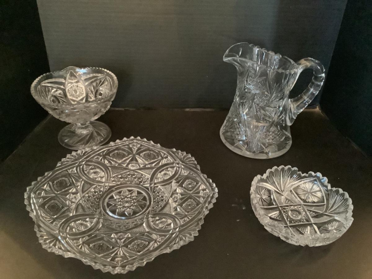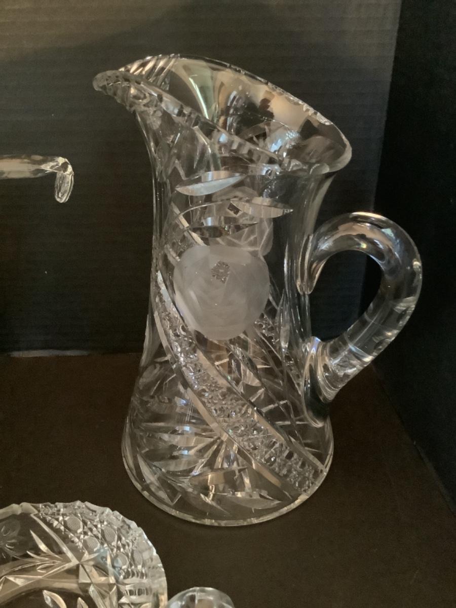 Water pitcher is 7” high, pedestal plate 11” round , small dish 6 “ round , compote 4.5”