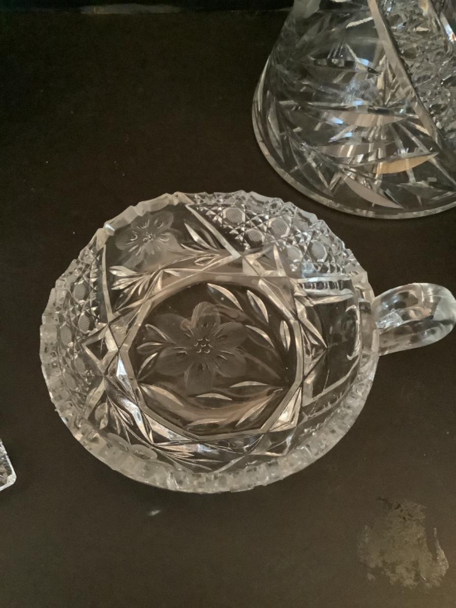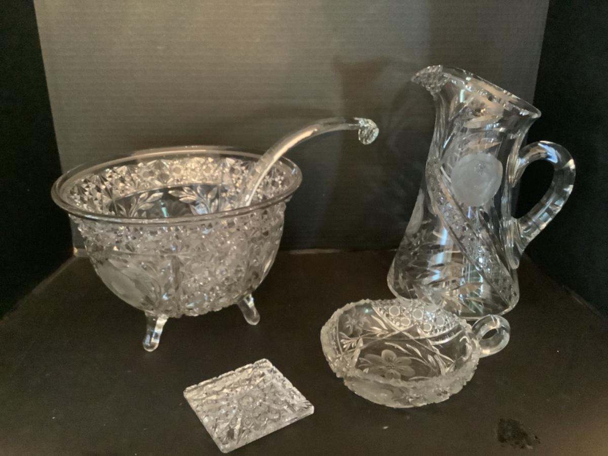 Nappy , footed bowl 7” h x 9” r , pitcher, 10” high , misc. lid, and glass ladle