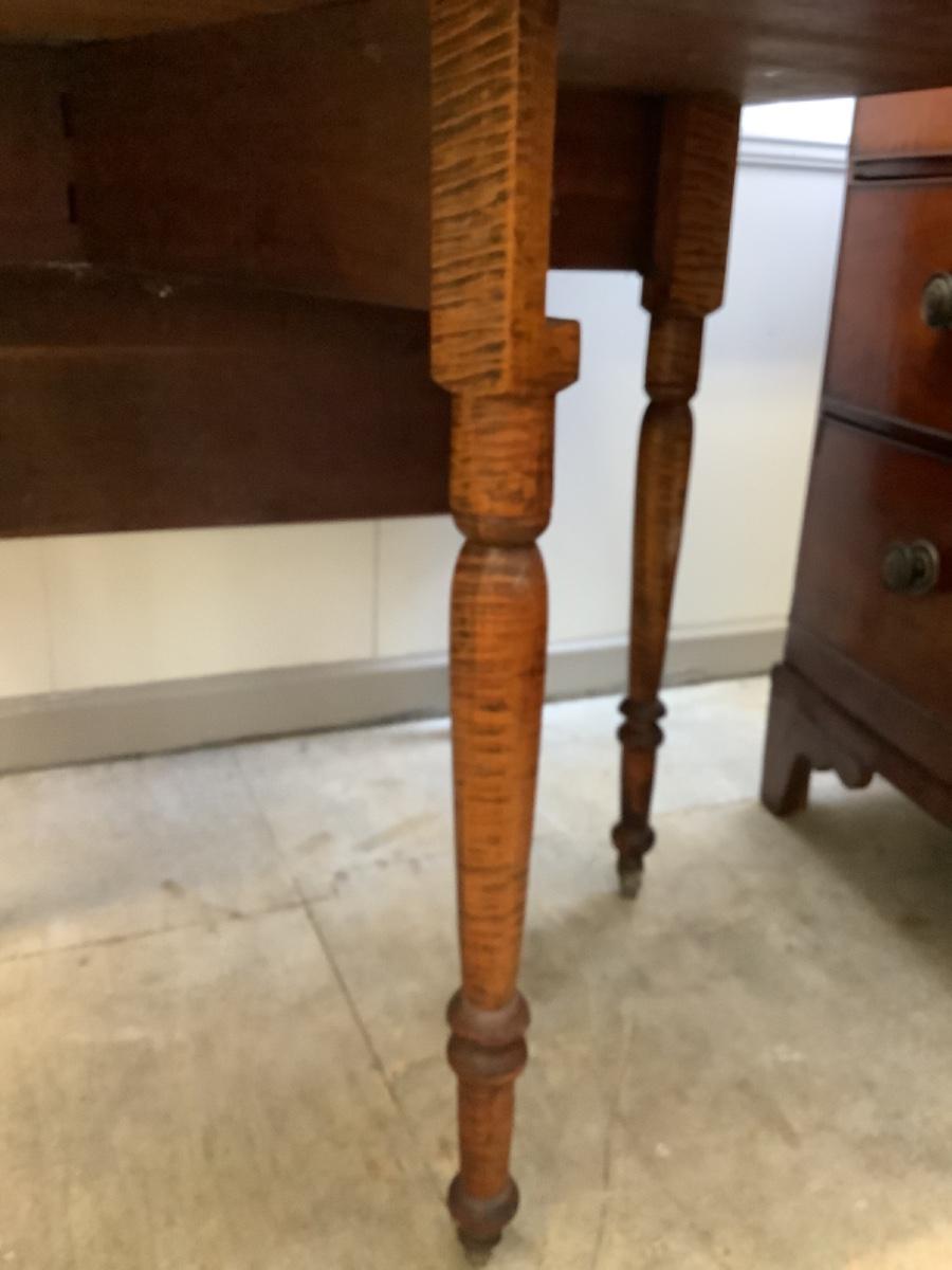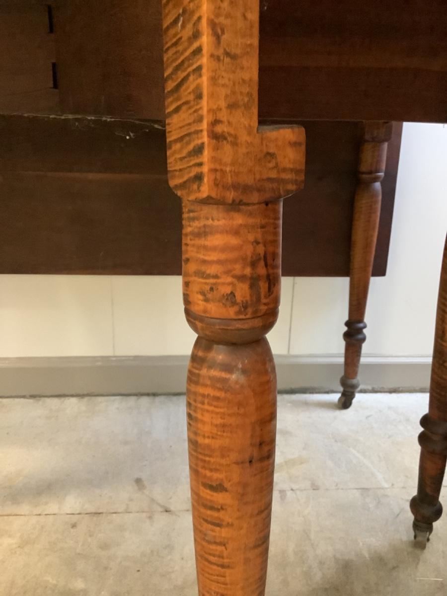 Antique drop leaf cherry top table with hand turned tiger maple legs.