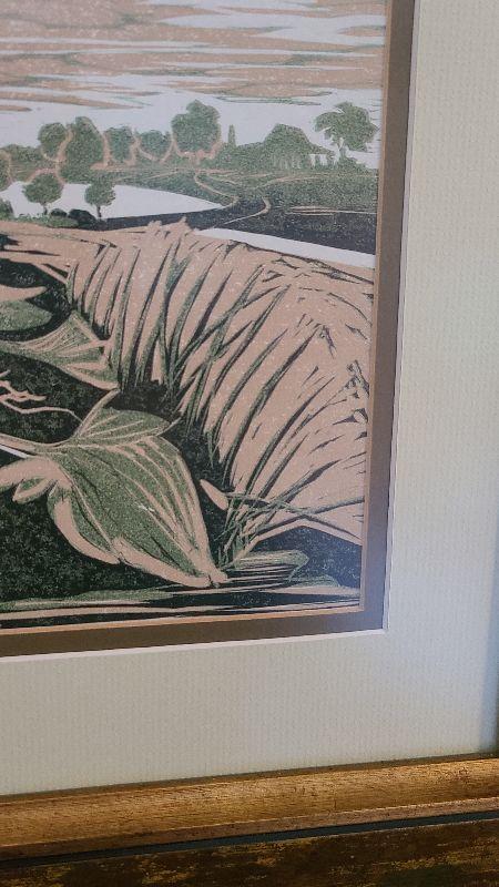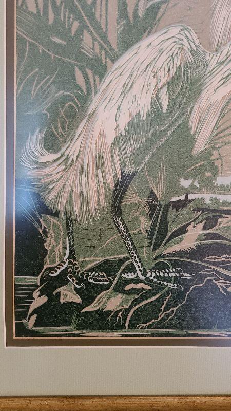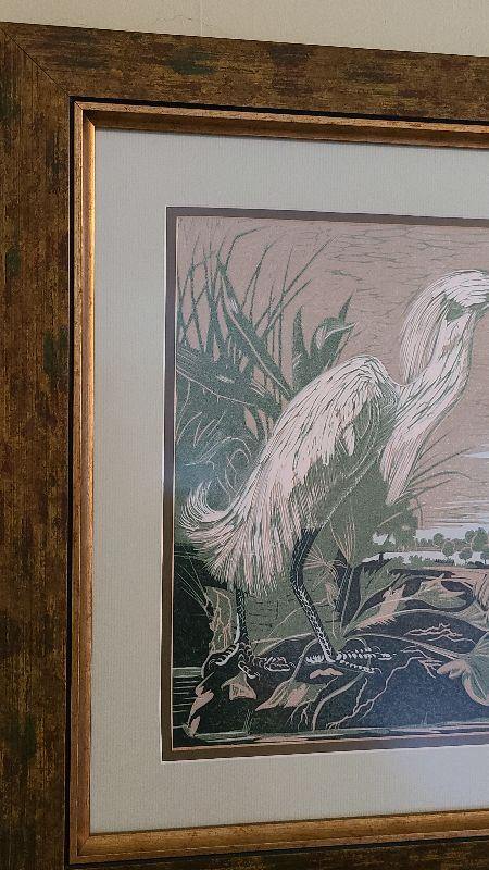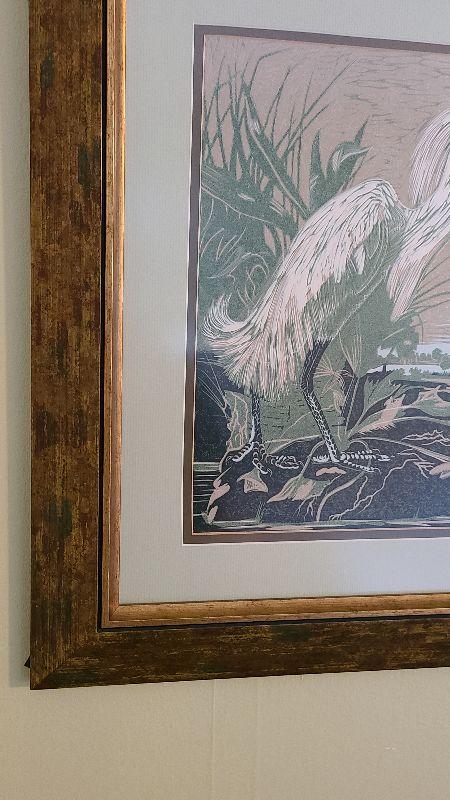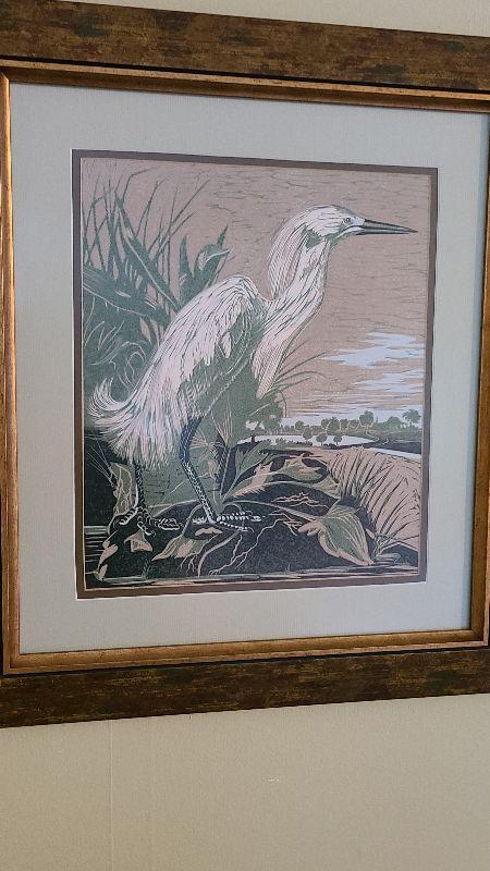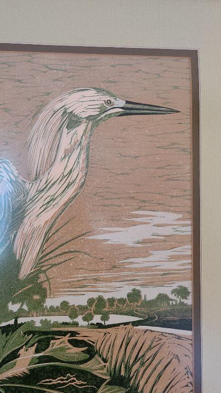 American Egret Woodcut Print 19 x 21. Please review all photos. First photo shows all that is in the lot, unless otherwhise noted. All items sold AS IS-WHERE IS. Please bring help for larger lots, and boxes or bags to remove your lots.