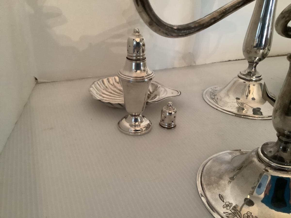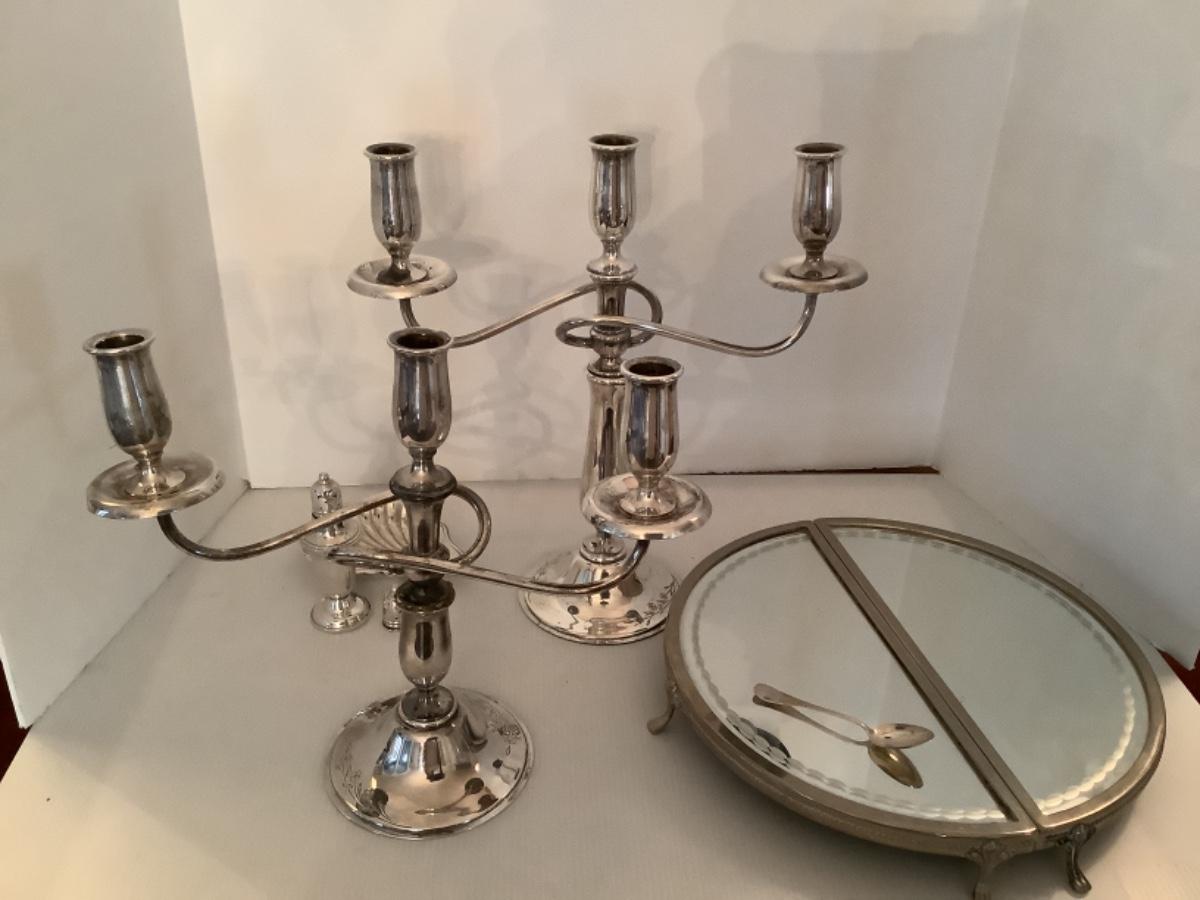 3 section candelabra , 2pc mirrored pedestal tray, 1 sterling shaker, 1 sterling top, and 1 demitasse spoon
