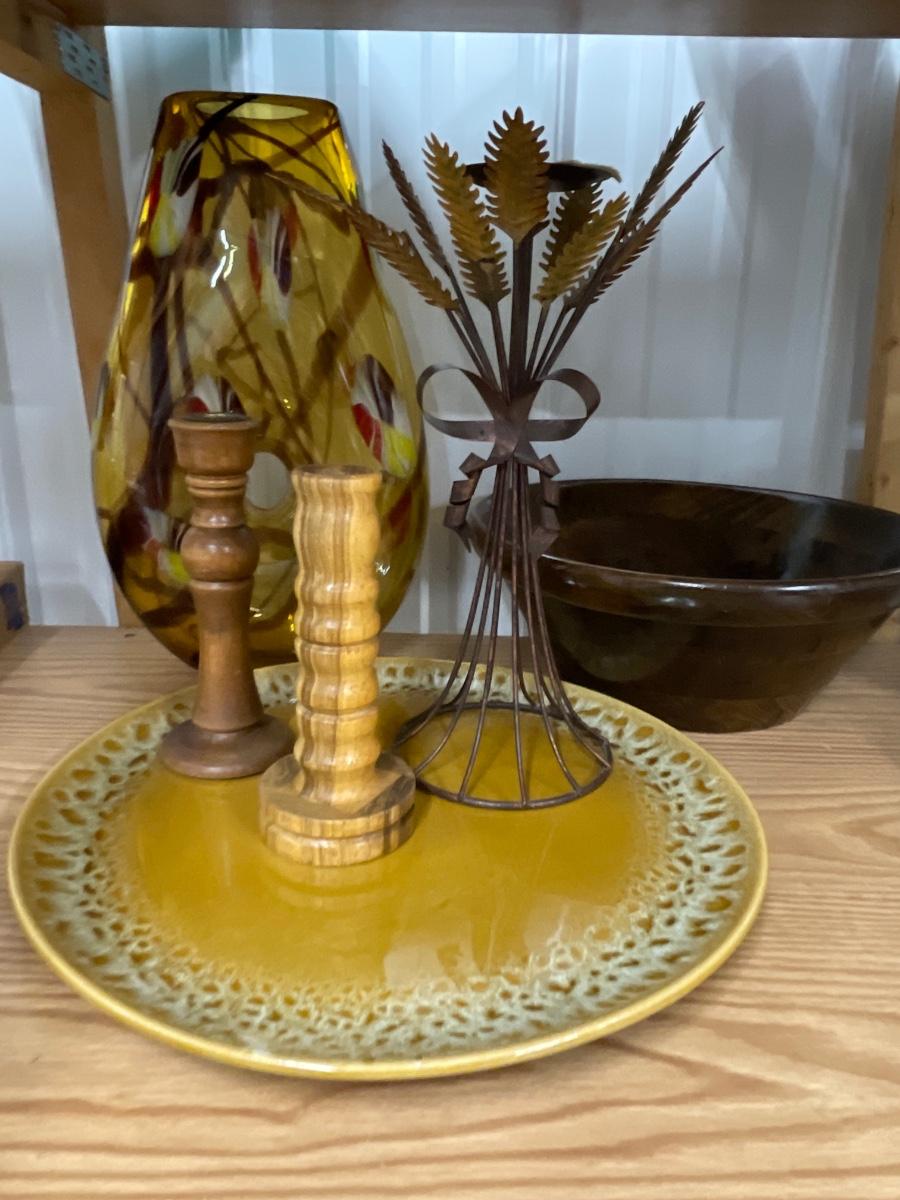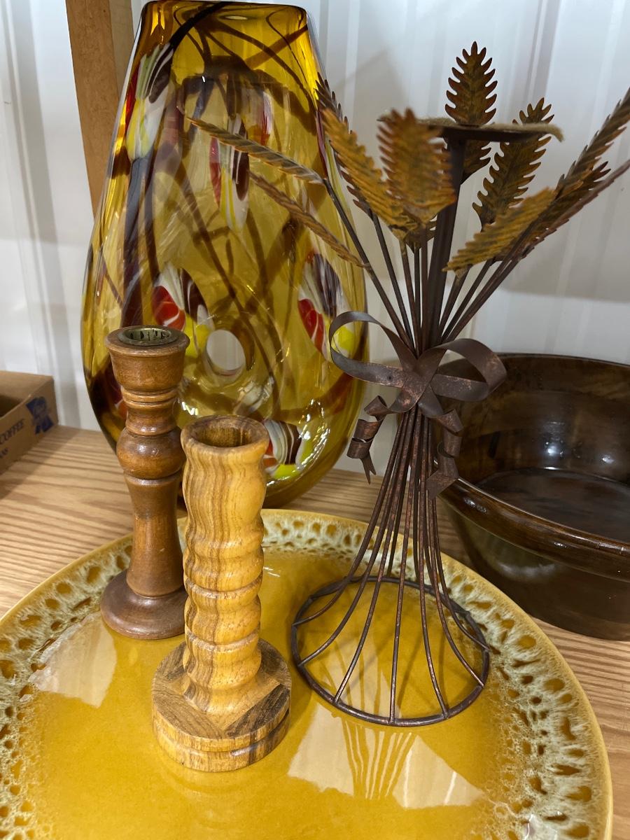 Vase, candle holders, Amber platter, wooden bowl