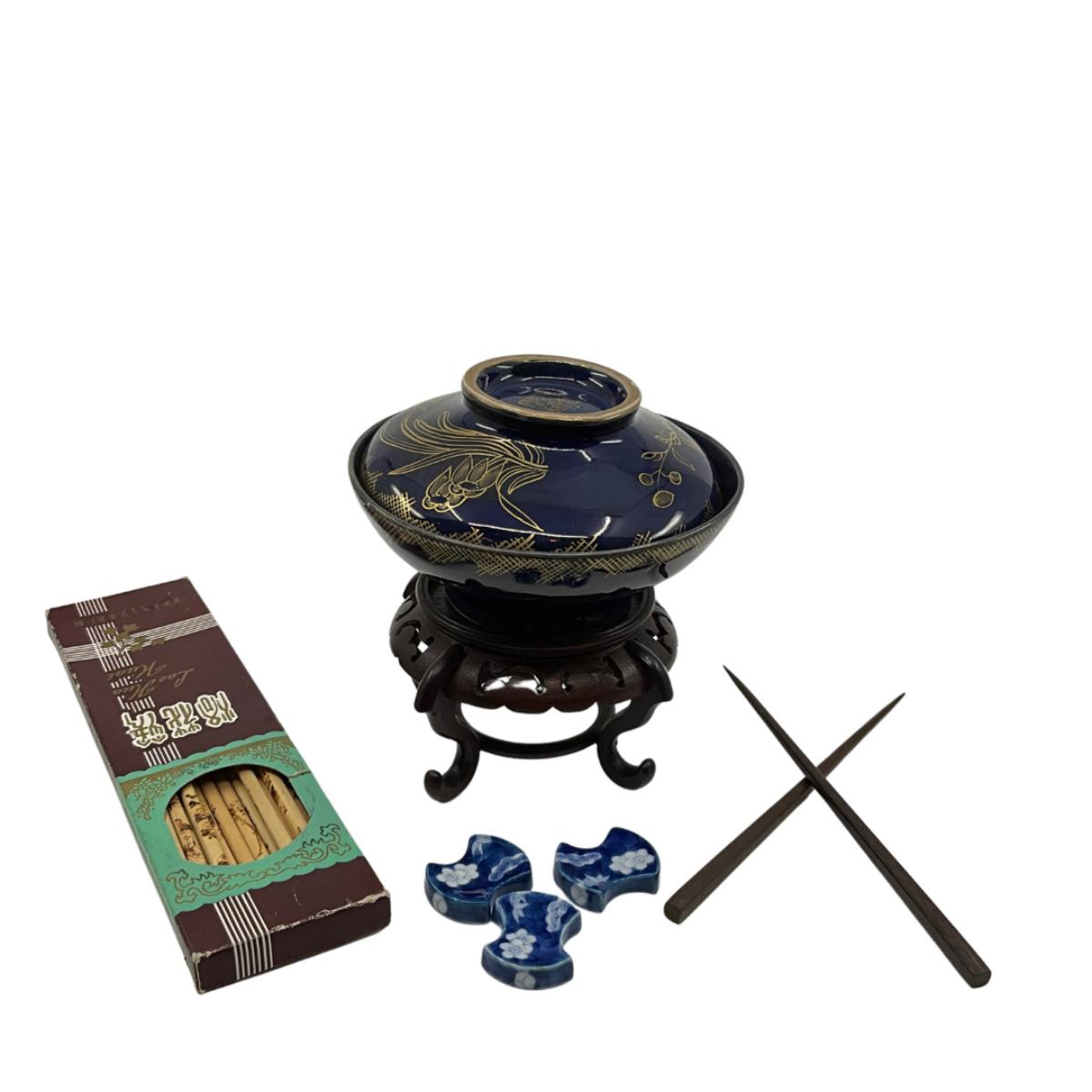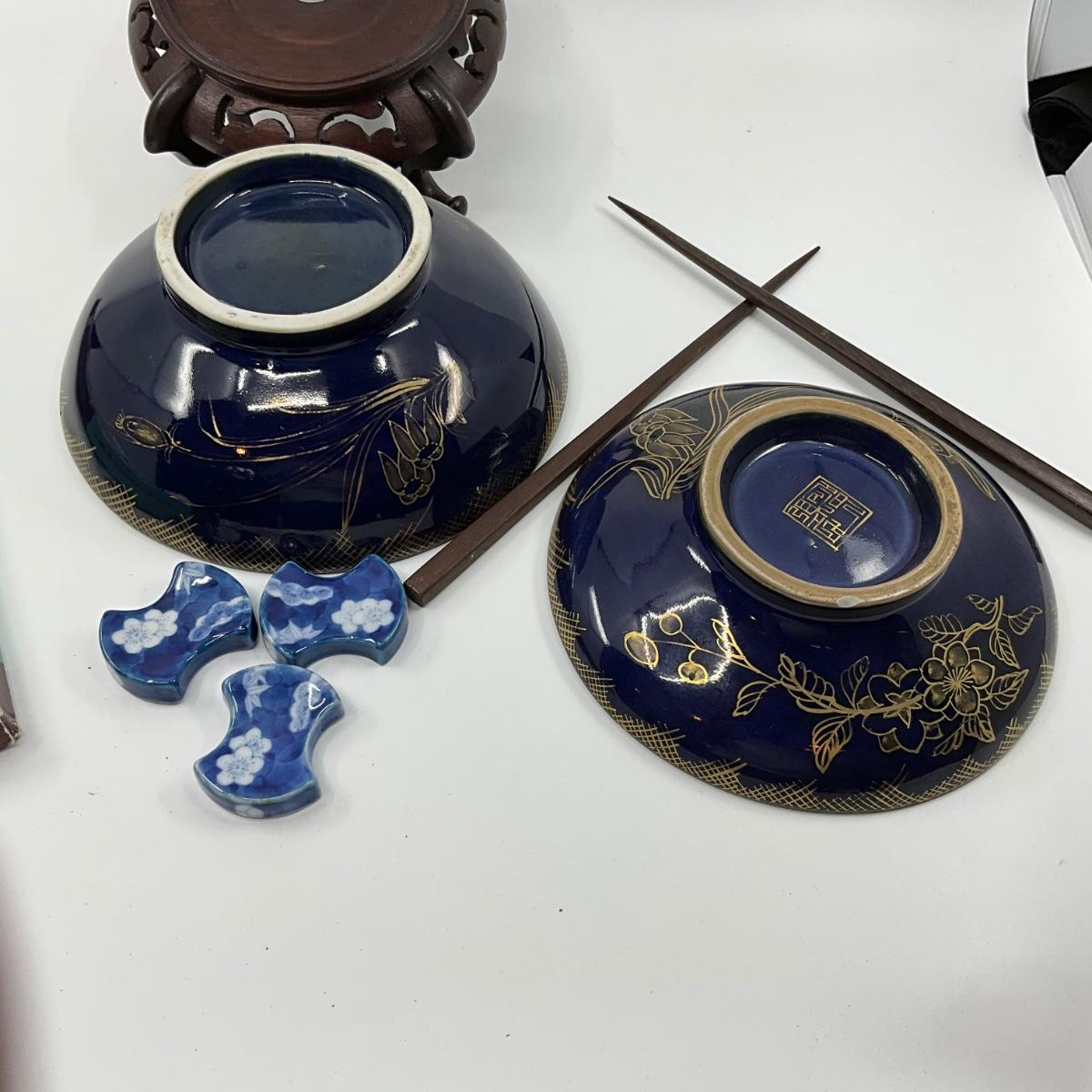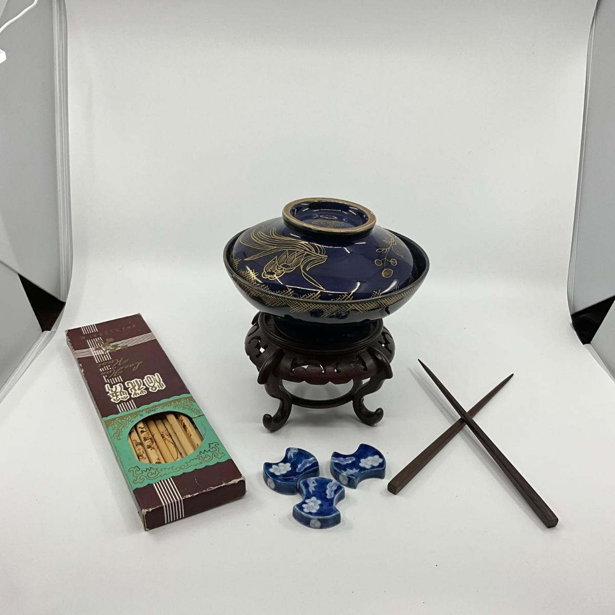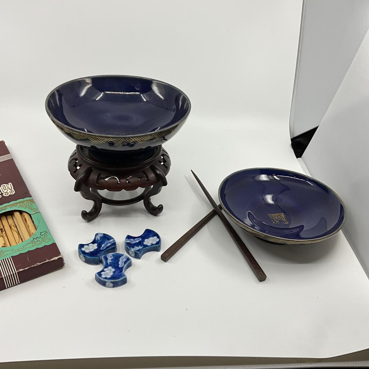D692 Blue and Gold Chinese Bowl with Stand and Chopsticks