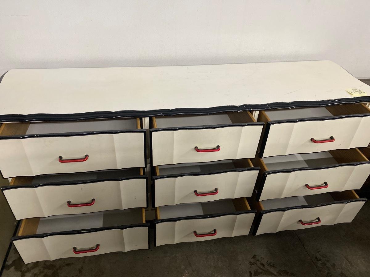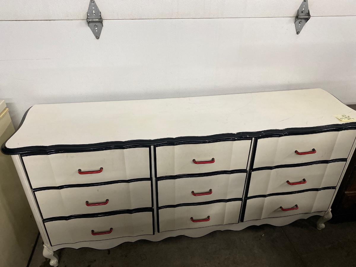 D7  dresser with 9 drawers, has wear and needs repainting. 18” d, 69 1/4 w, 32.5 tall