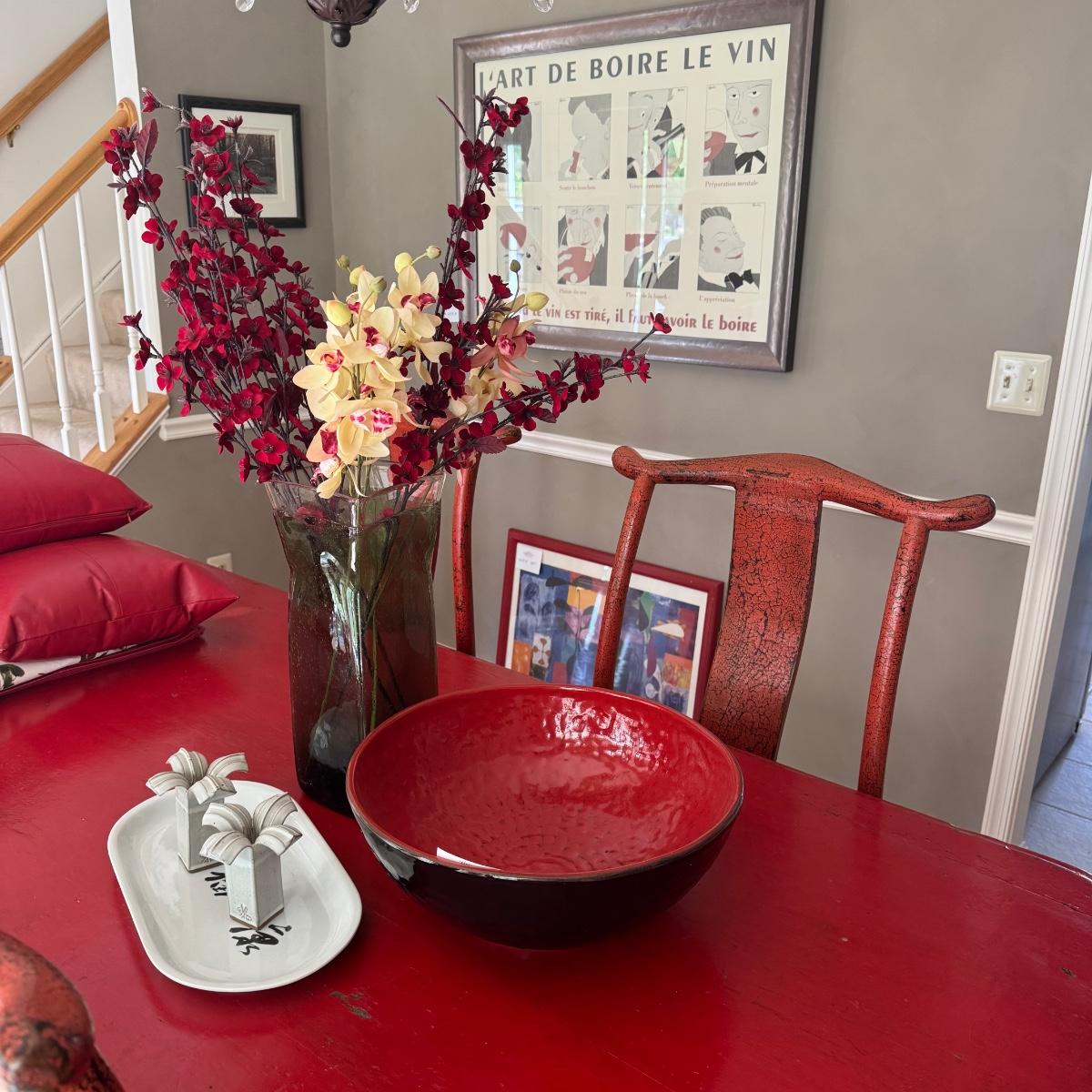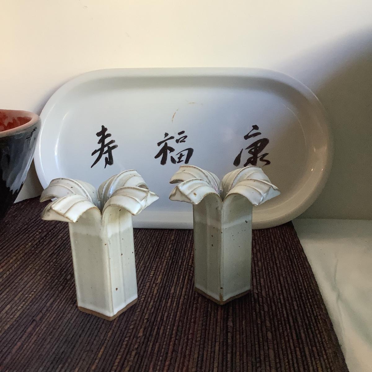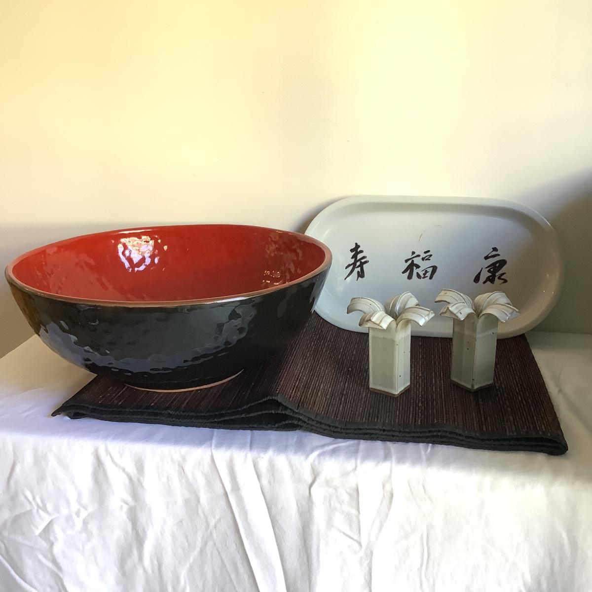 Includes B.L.A oval tray, Paul Anthony candlesticks, red and black bowl, and a dining table center Matt.