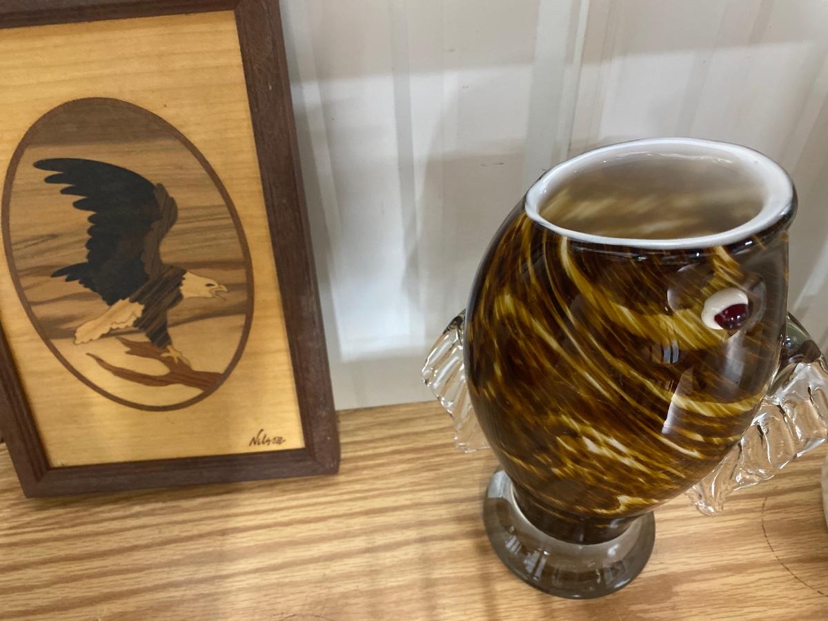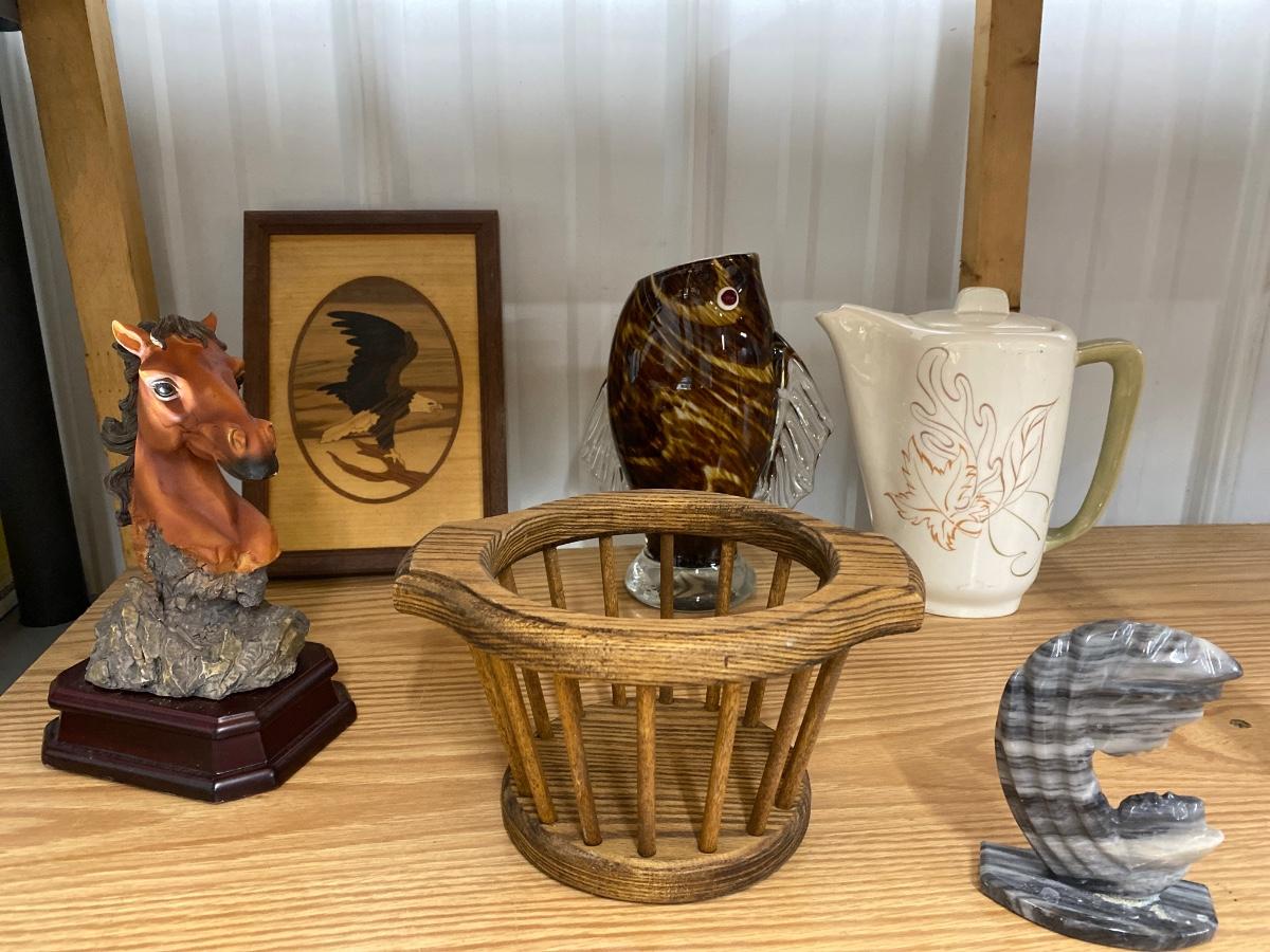 D81 mother looking at child stone art, glass fish art, ceramic horse, eagle wood decor, ceramic teapot.