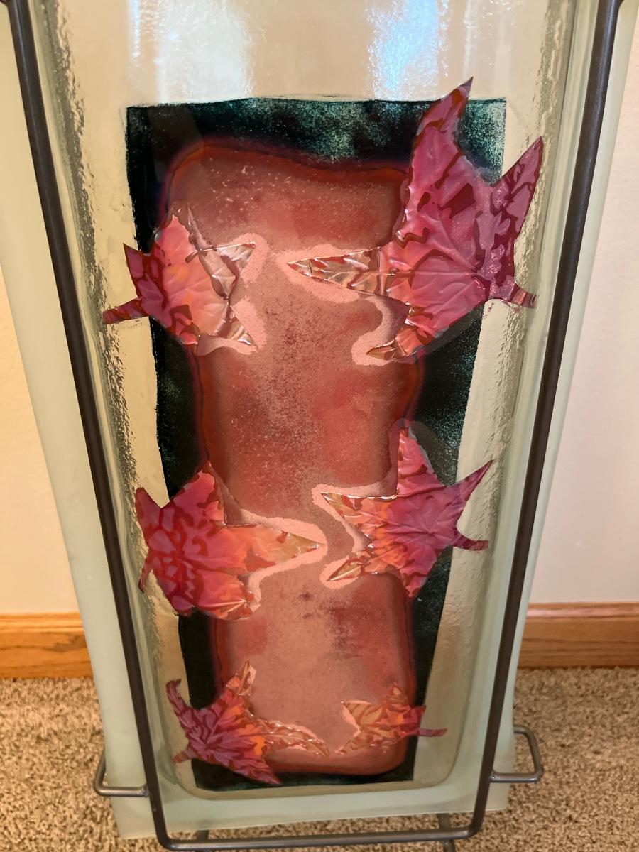 Beautiful vase with autumn leaves. 28” h x 13” wide. By Round the House.