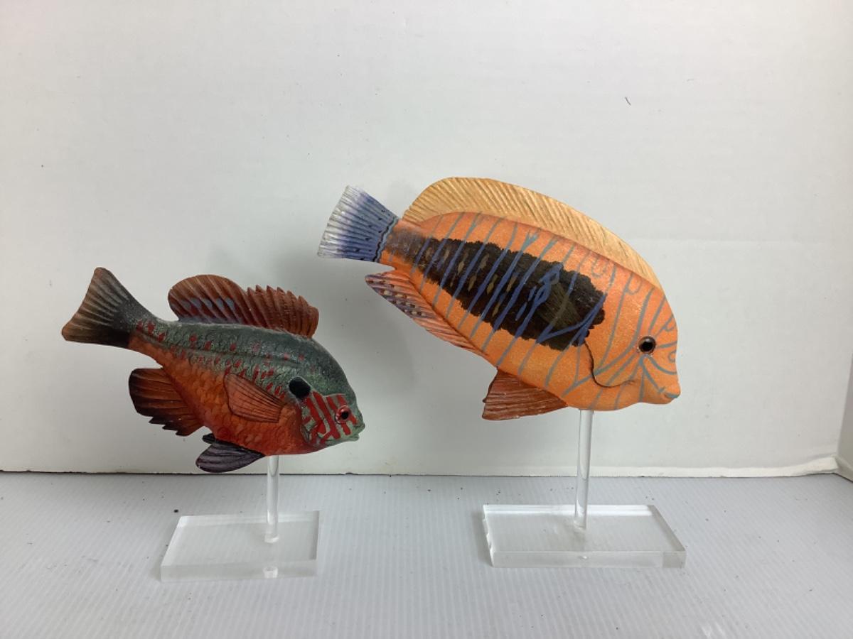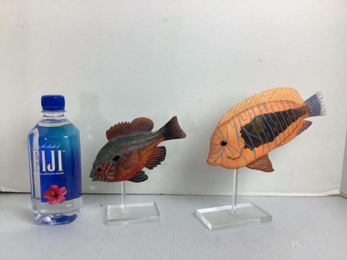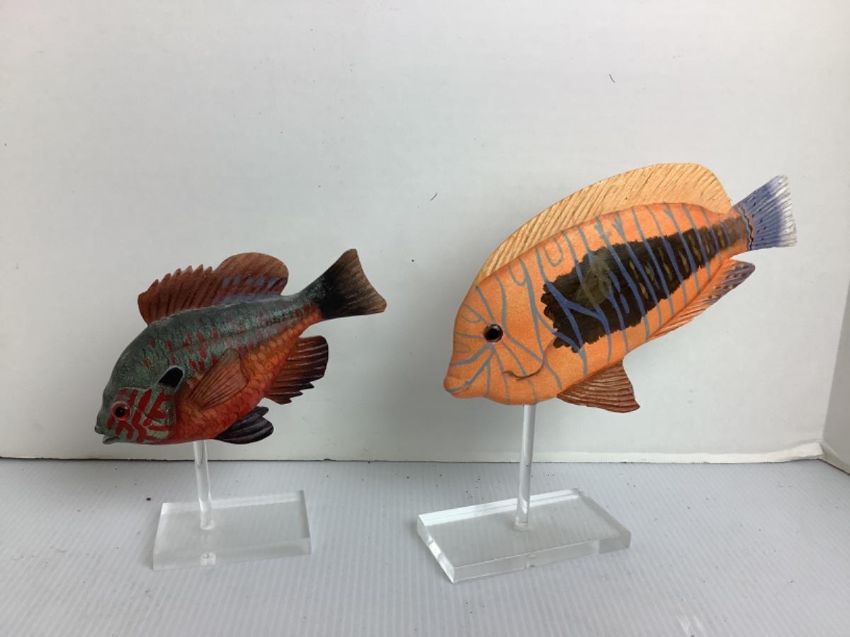D901 Two Handpainted Wooden Carved Fish on Pedestal