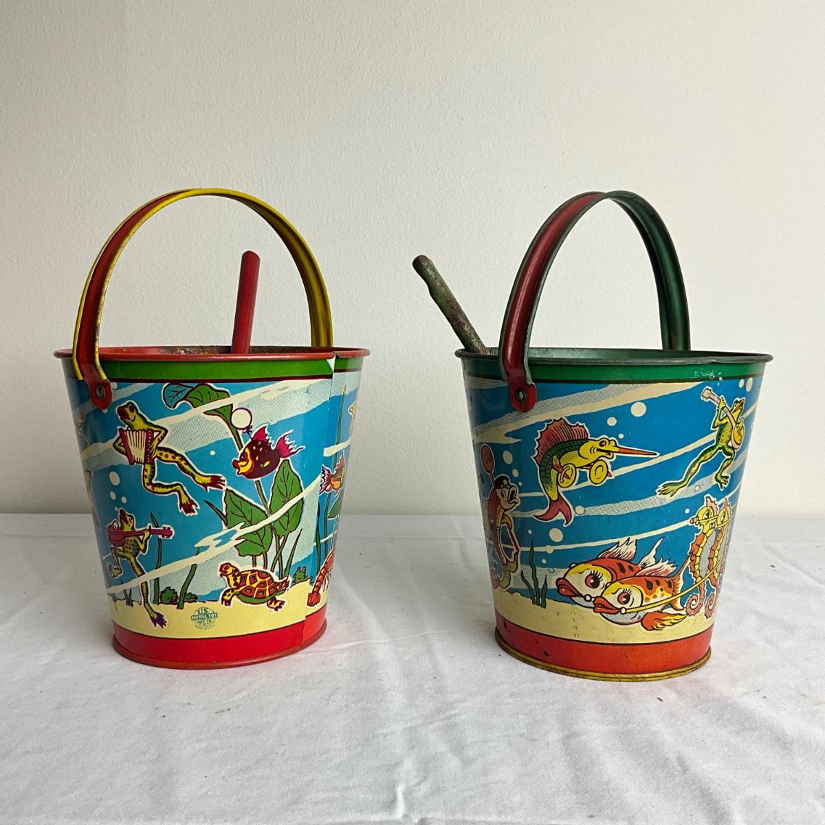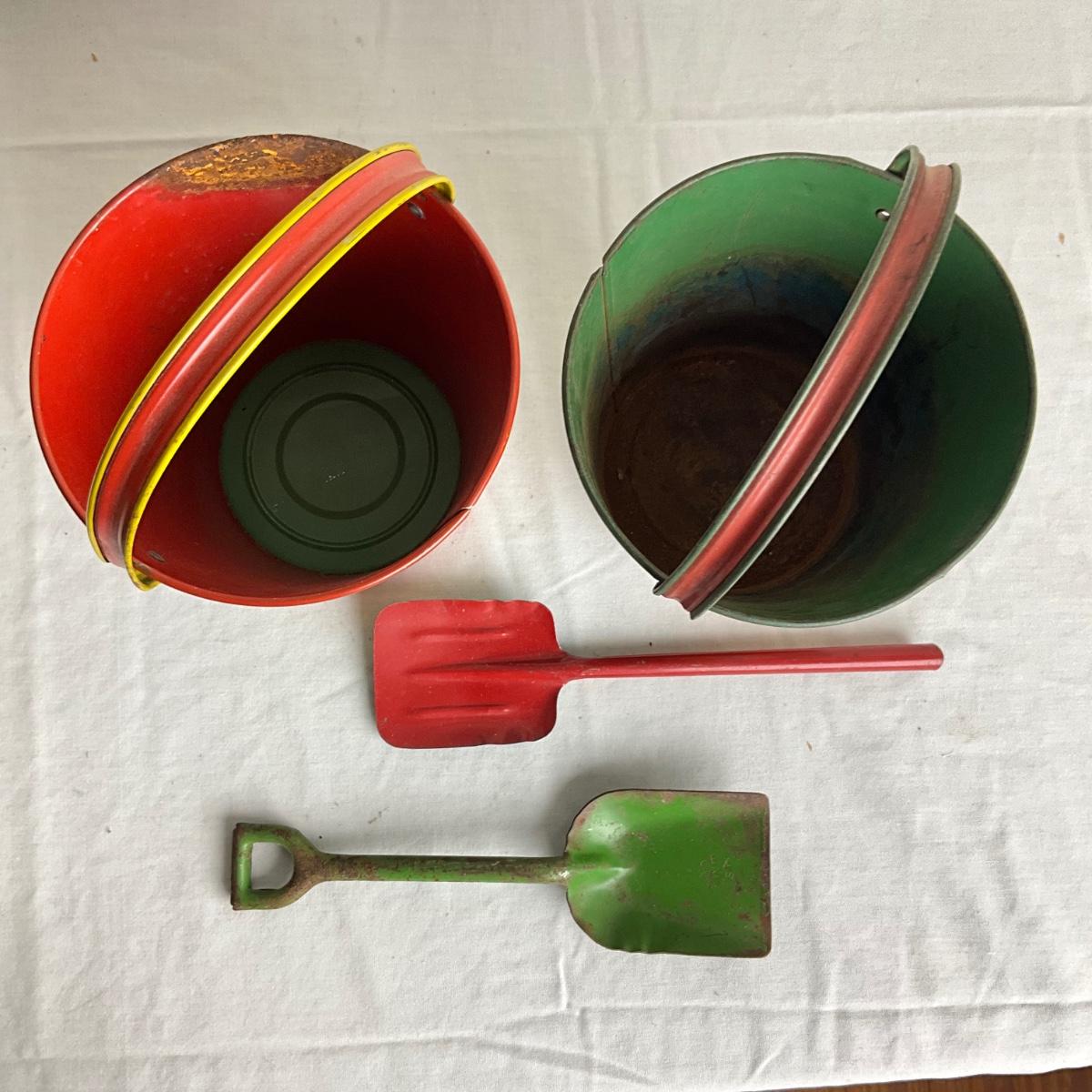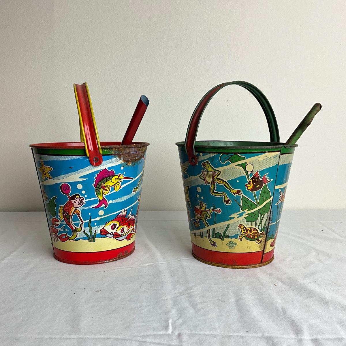 D902 Antique US Metal Toy Sand Pails with Shovels