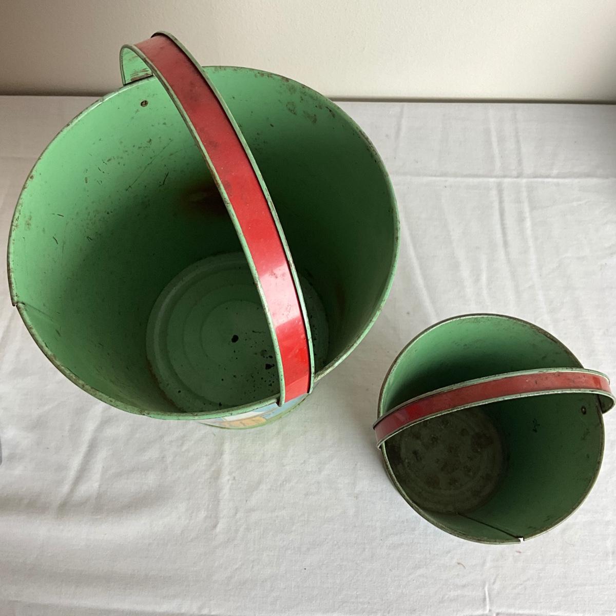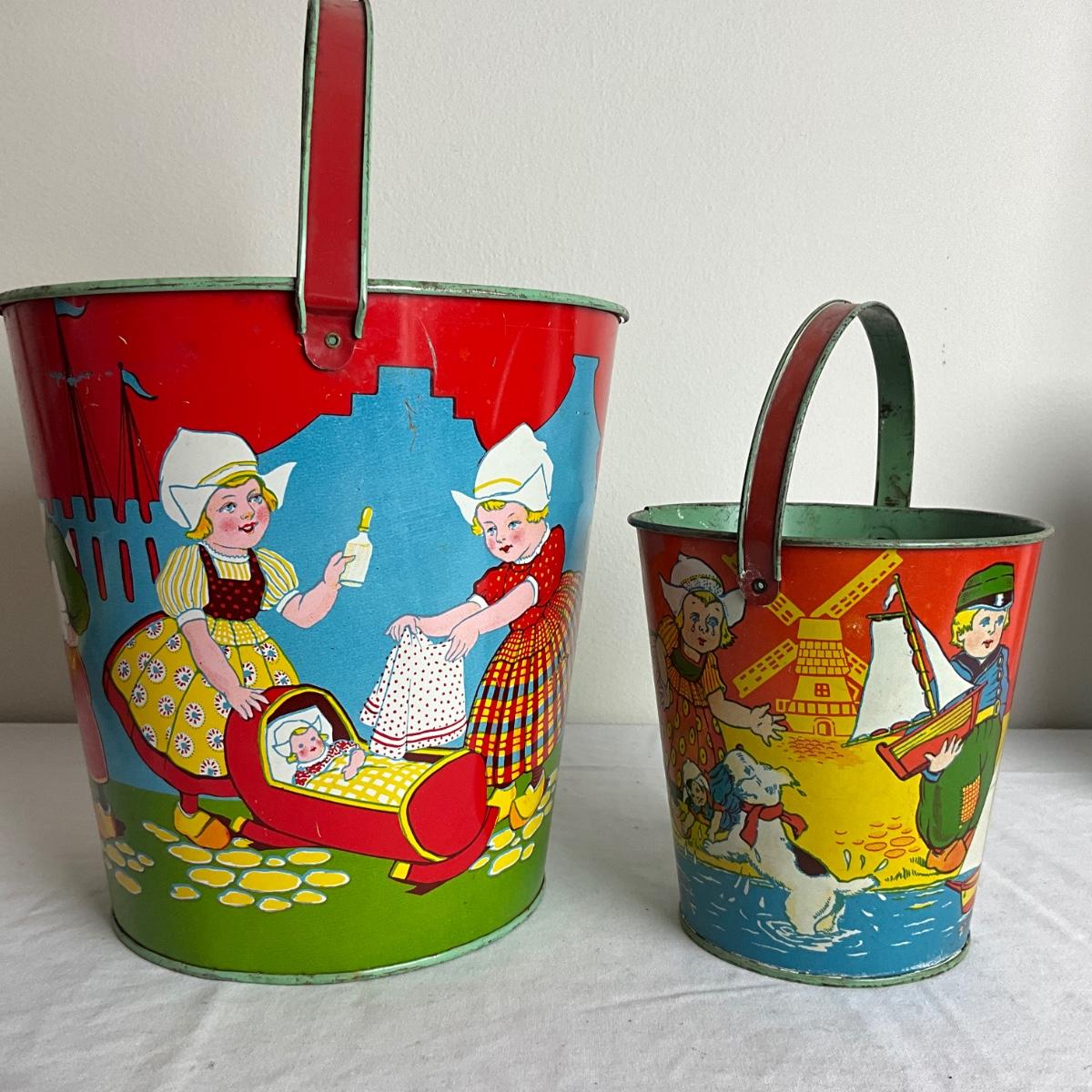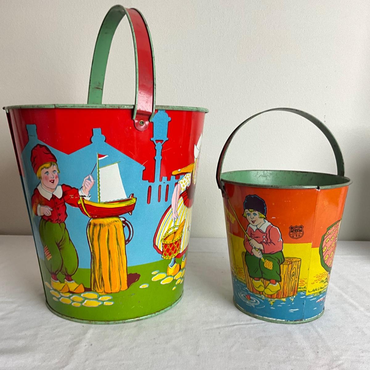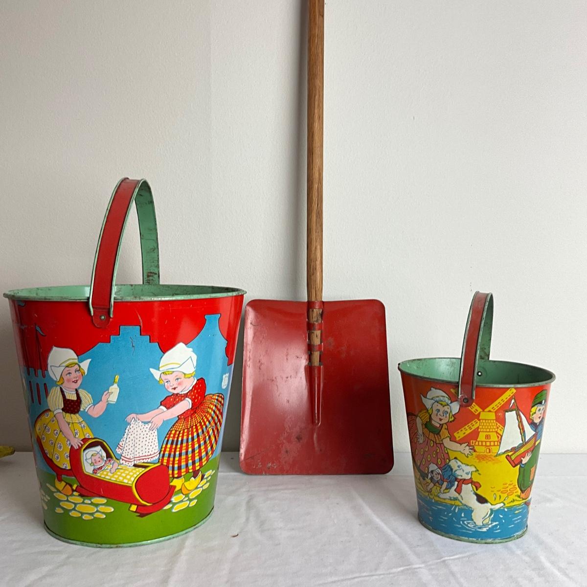 D913 Two Vintage Dutch J. Chein Lithograph Sand Pails with Large Shovel