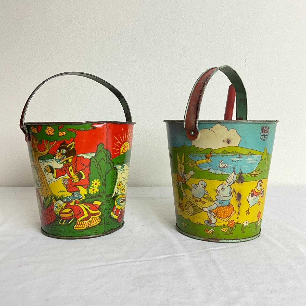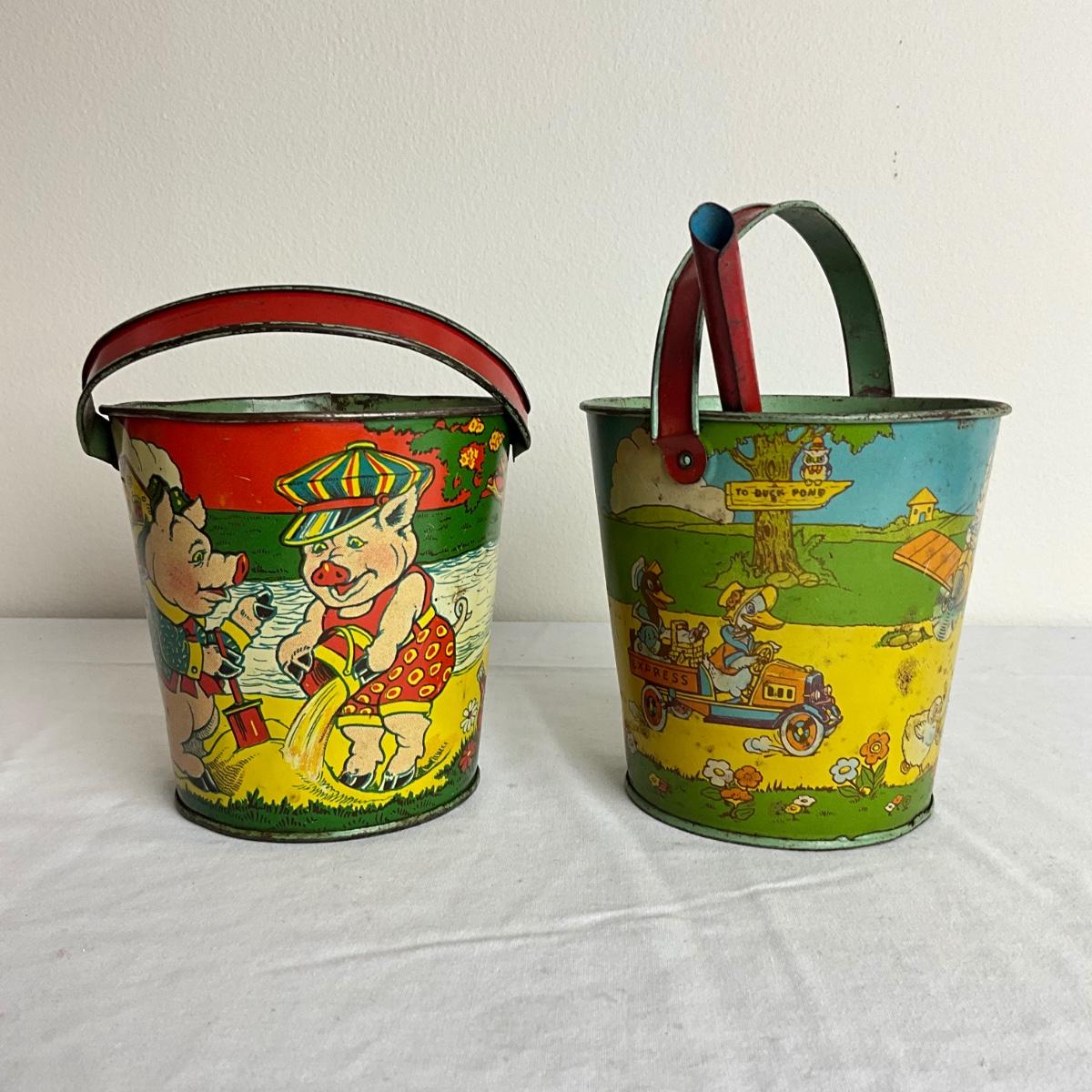 D916 Antique Tin Litho print Sand Pails - Three Little Pigs and Animals playing in Pond