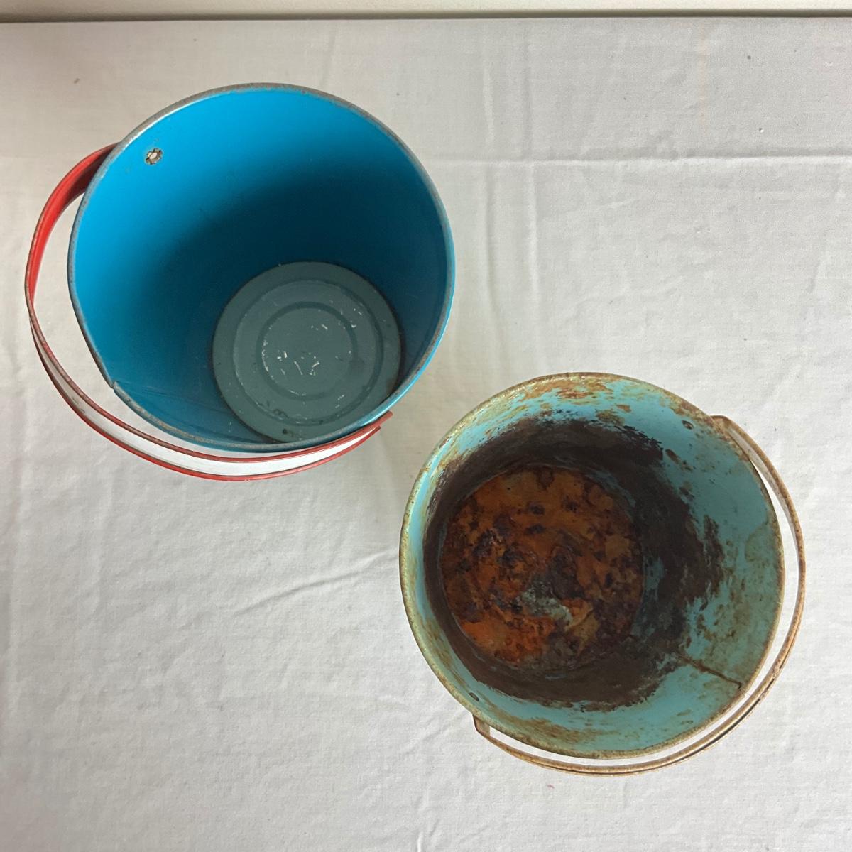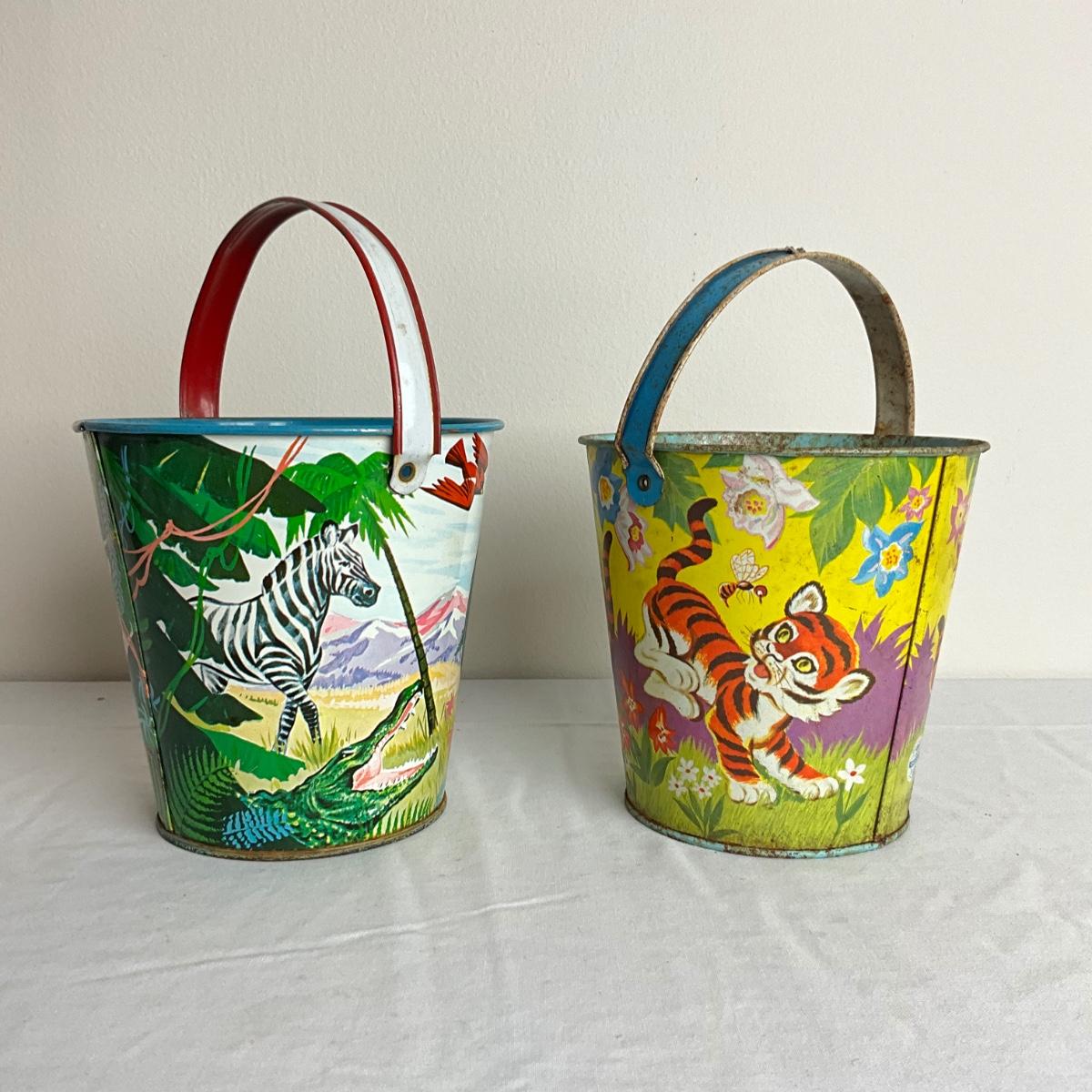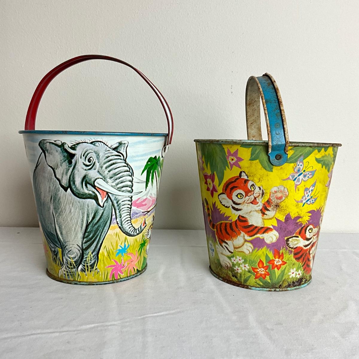 D919 Two Vintage Jungle Safari Themed Tin Sand Pails