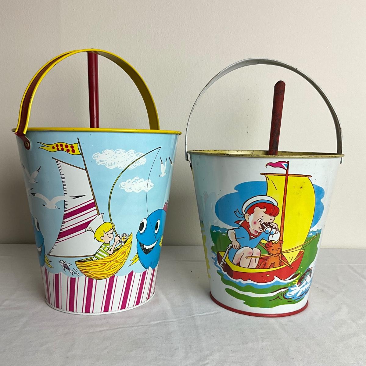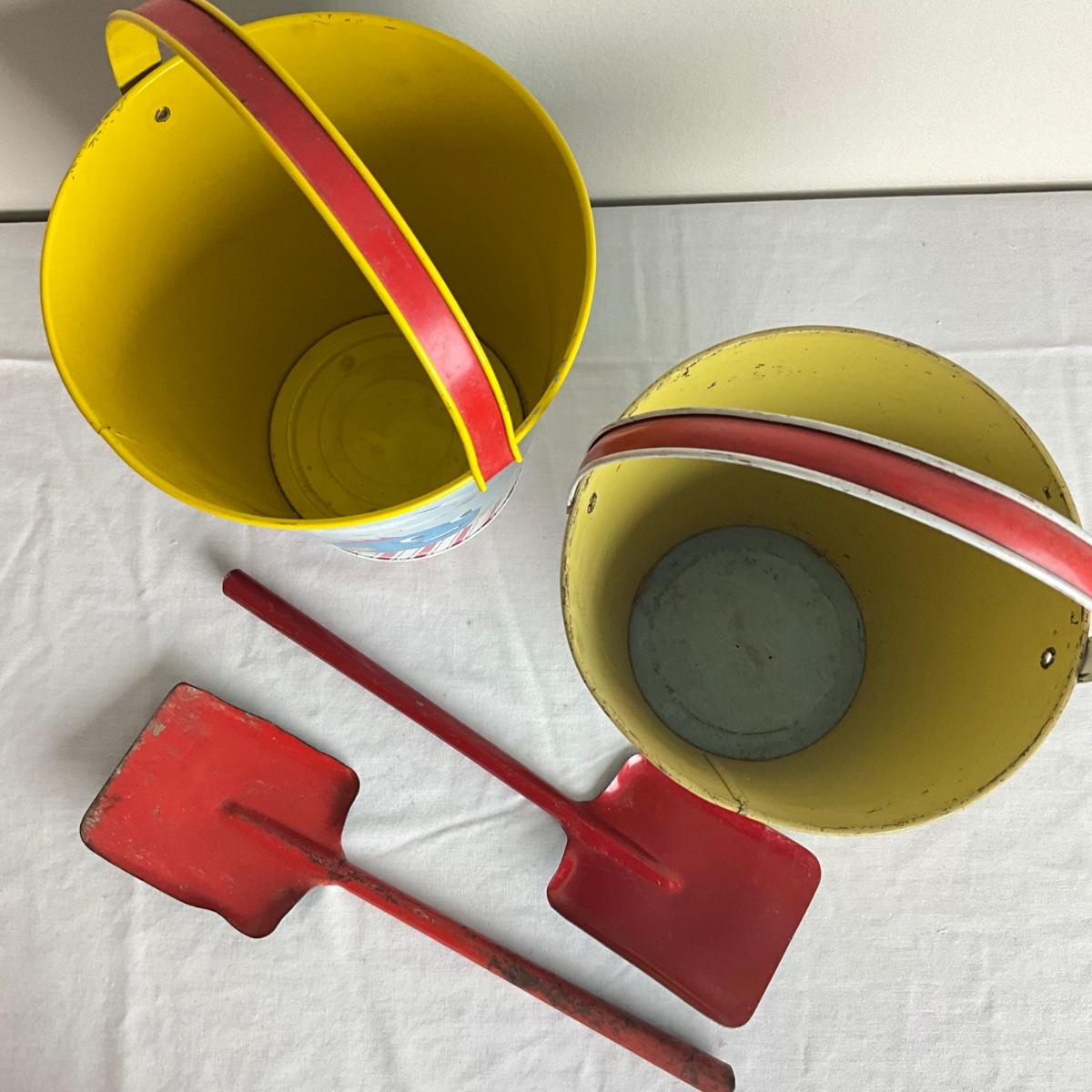 D924 US Metal Toy Co. & J. Chein Sand pails and 2 red shovels