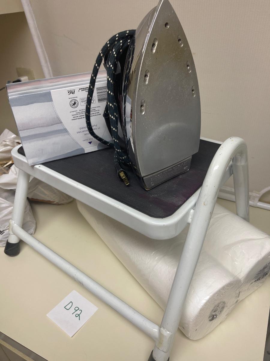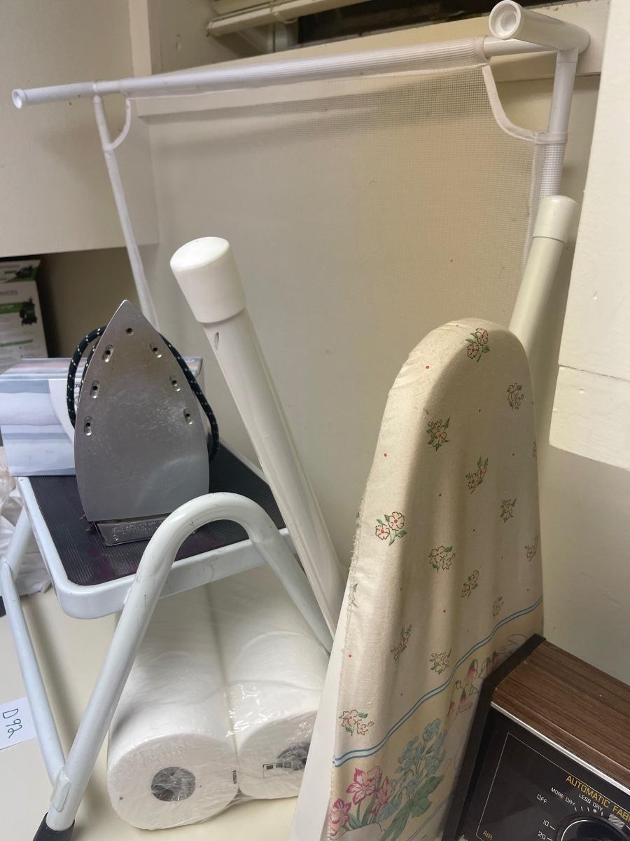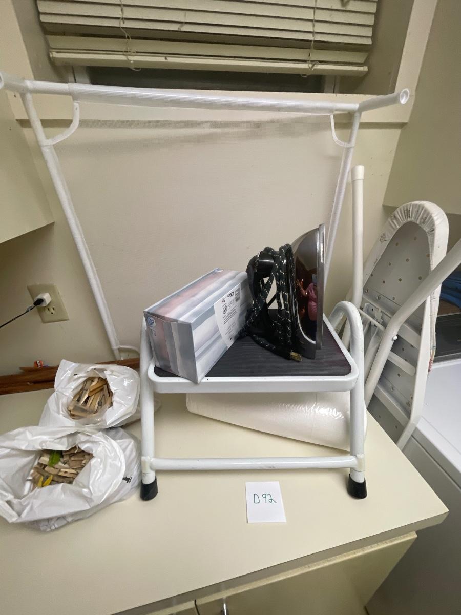 D92-clothes, pins, stepstool, Kleenex, and toilet tissue, iron, drying rack, and ironing board