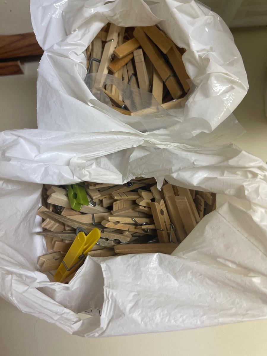 D92-clothes pins, stepstool, Kleenex, and toilet tissue, iron, drying rack, and ironing board