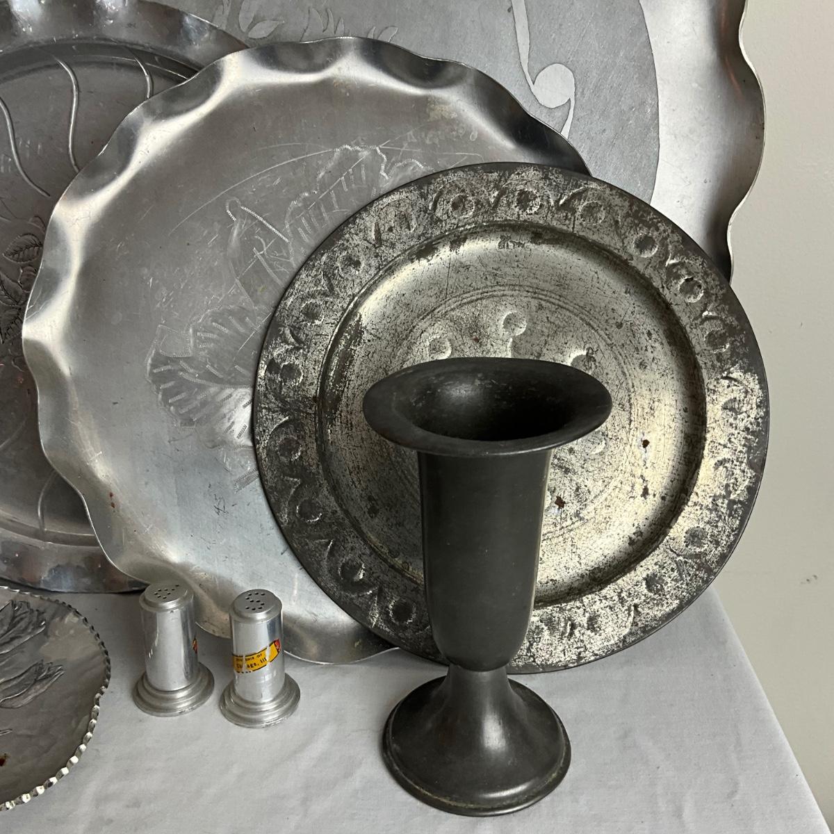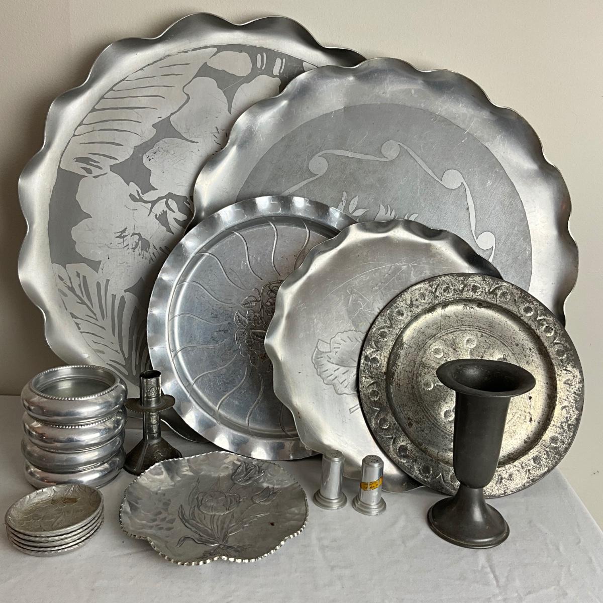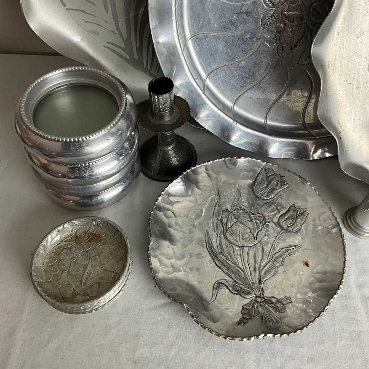 D959 Lot of Aluminum Platters, Coasters, Vase