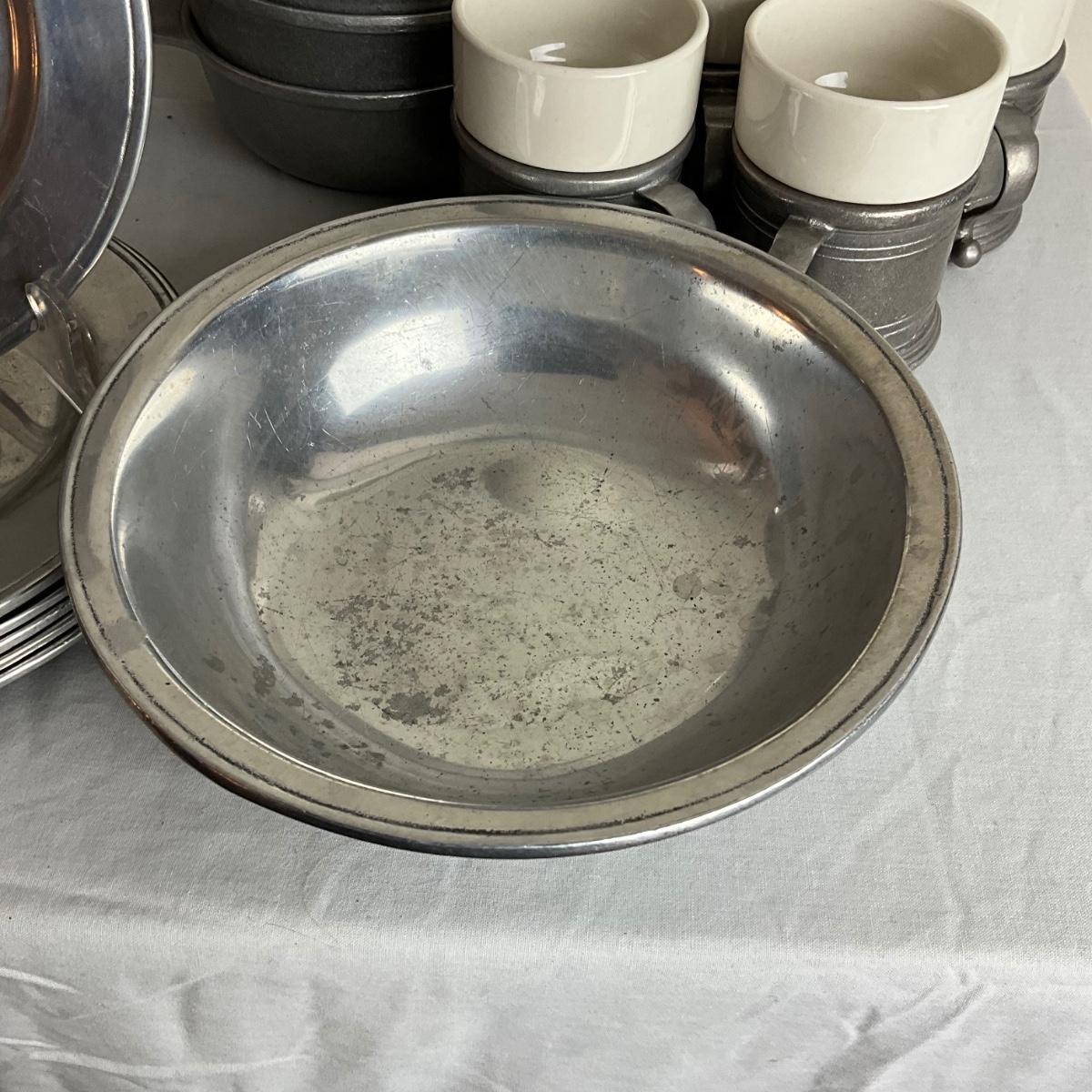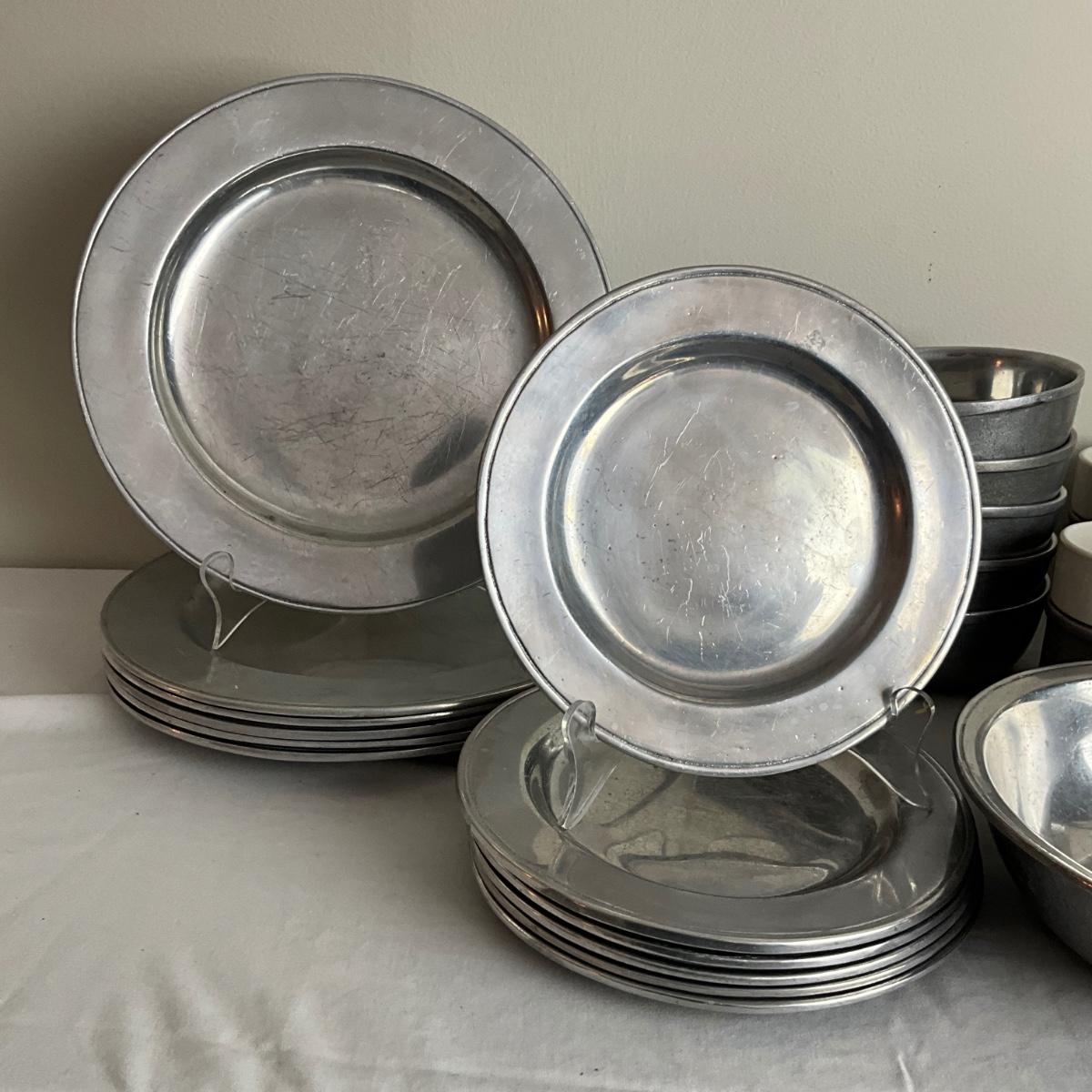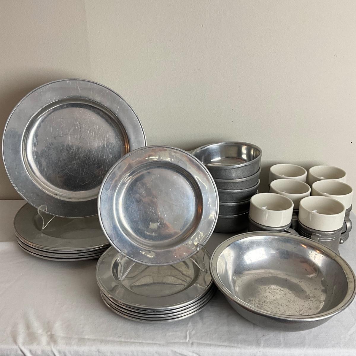 6 dinner plates, 6 salads, 5 bowls, one large vegetable bowl, 6 coffee mugs, with ironstone inserts