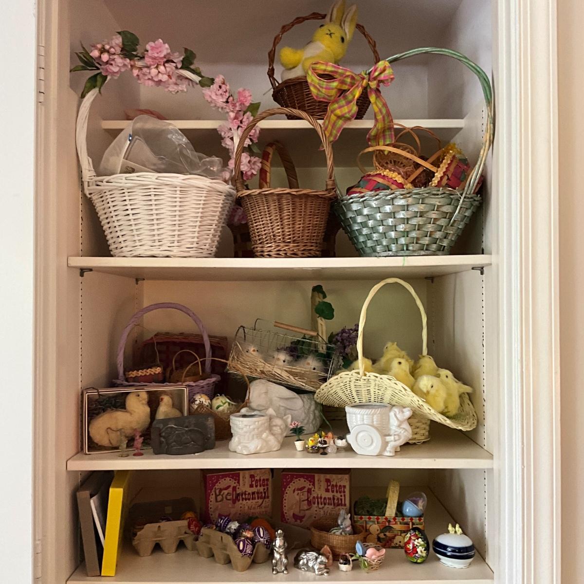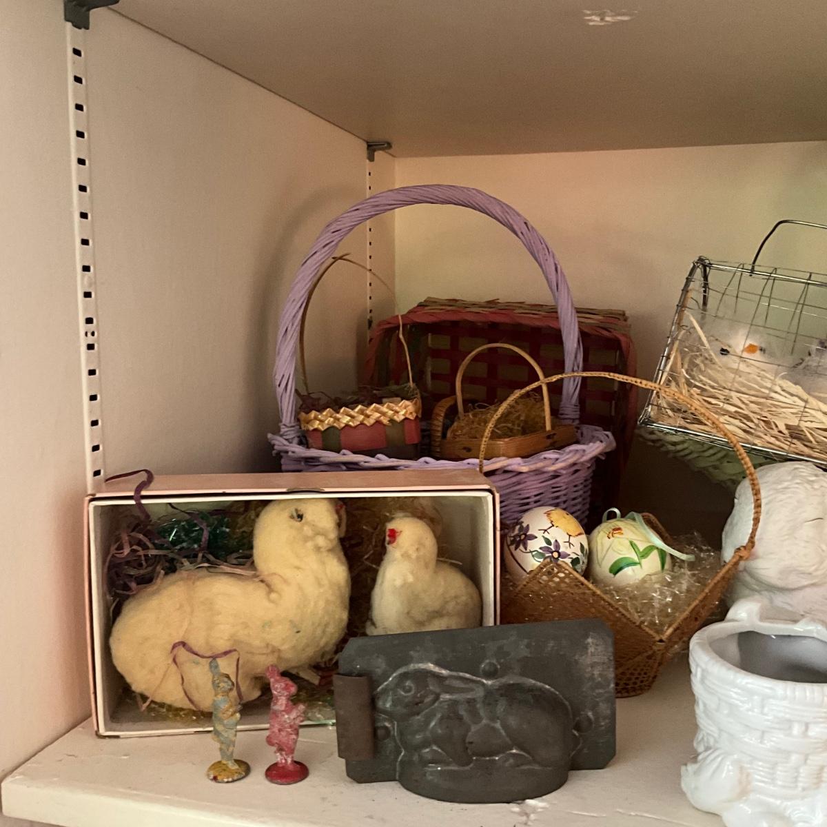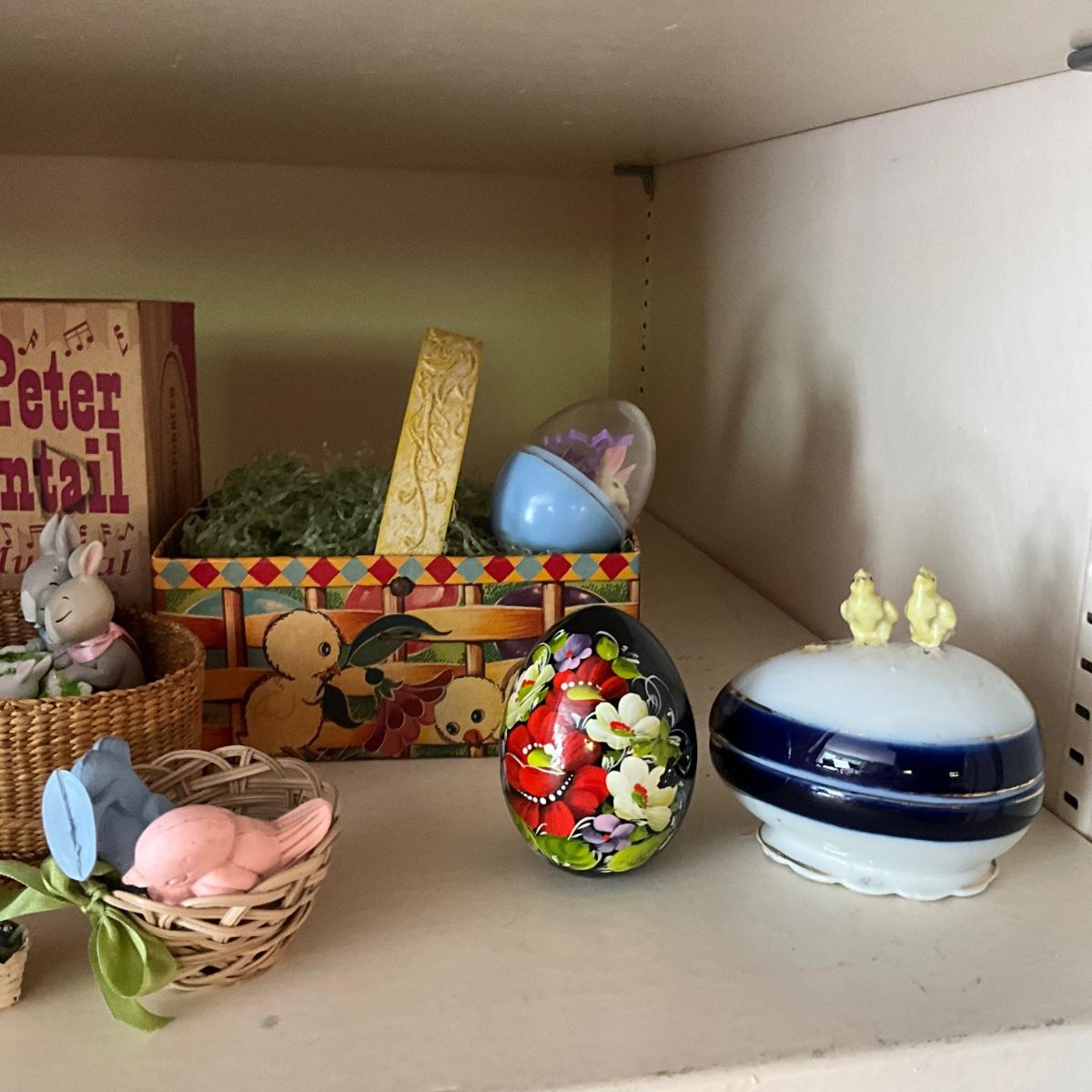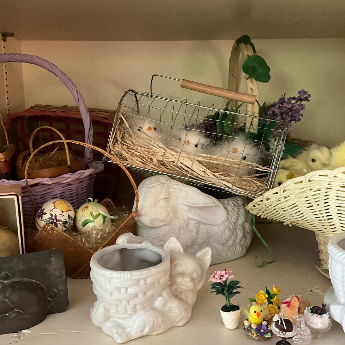Several baskets, vintage hand made eggs, and porcelain planters and so much more