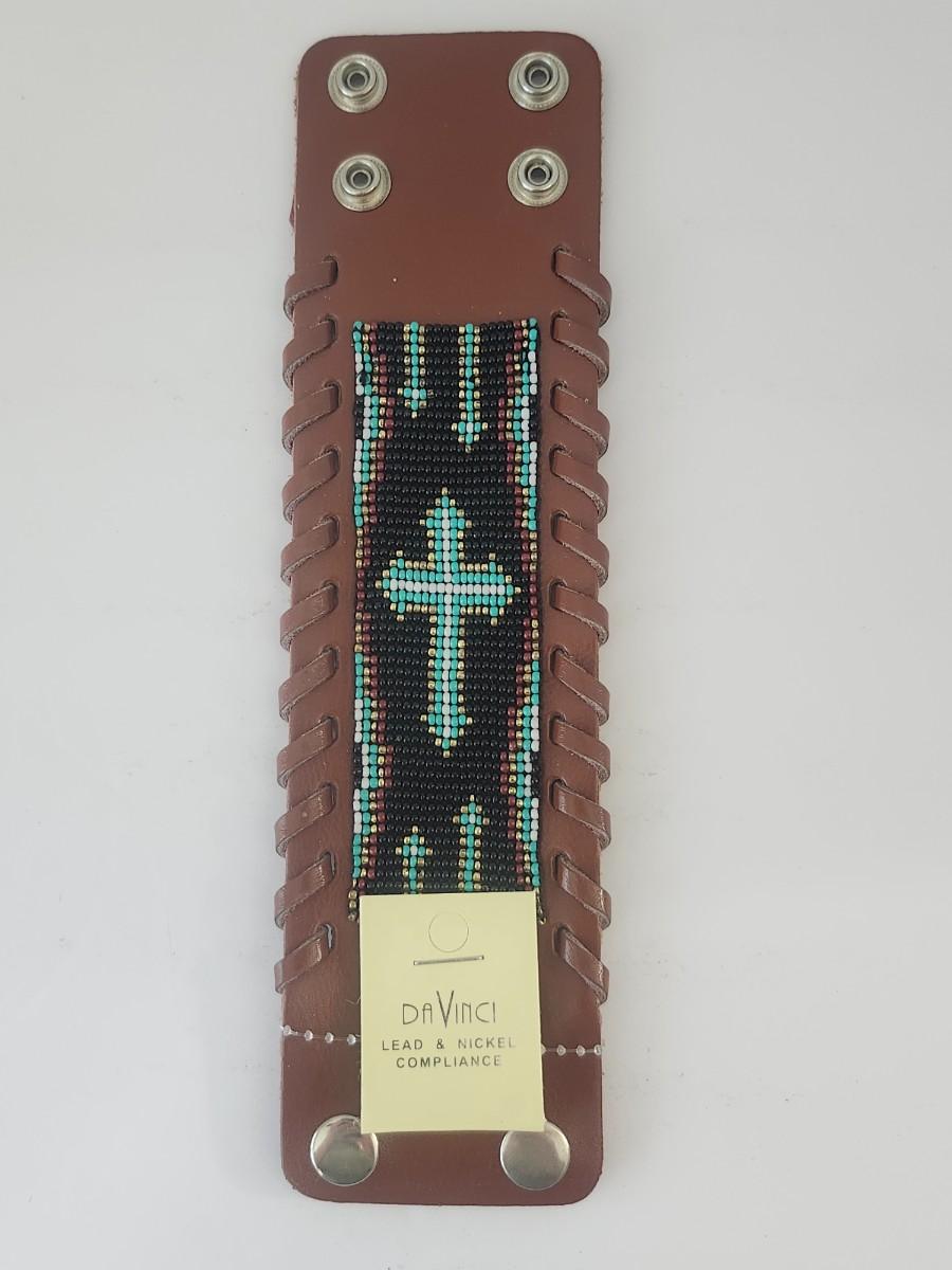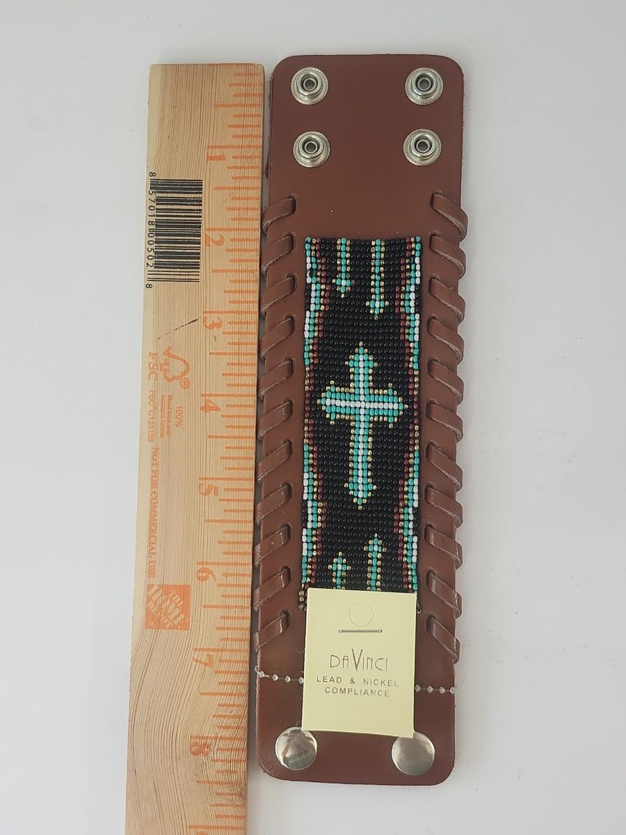 Da Vinci Beaded Leather Cuff Bracelet Cross Motif Southwestern Style Lead and Nickel Compliance