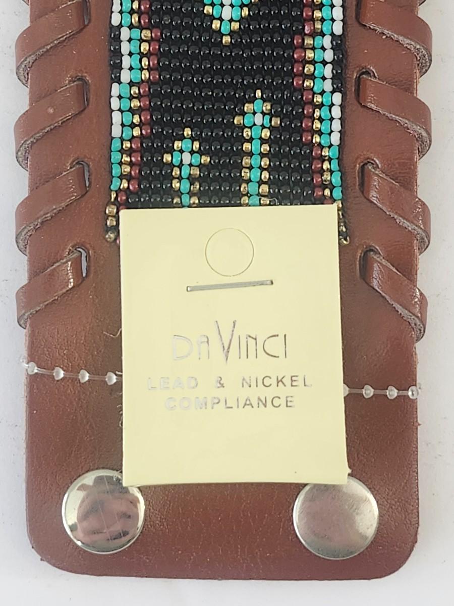 Da Vinci wide leather cuff bracelet featuring a central seed bead panel with a turquoise color cross motif and arrow style accents on a black background. Brown leather base with whipstitch style side lacing and snap closure. Original Da Vinci hang tag present noting lead and nickel compliance. Design, materials, and construction described strictly from visible details.