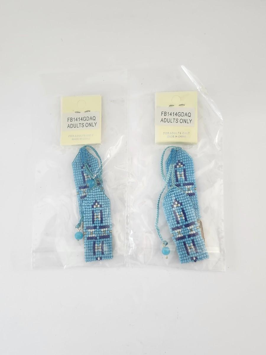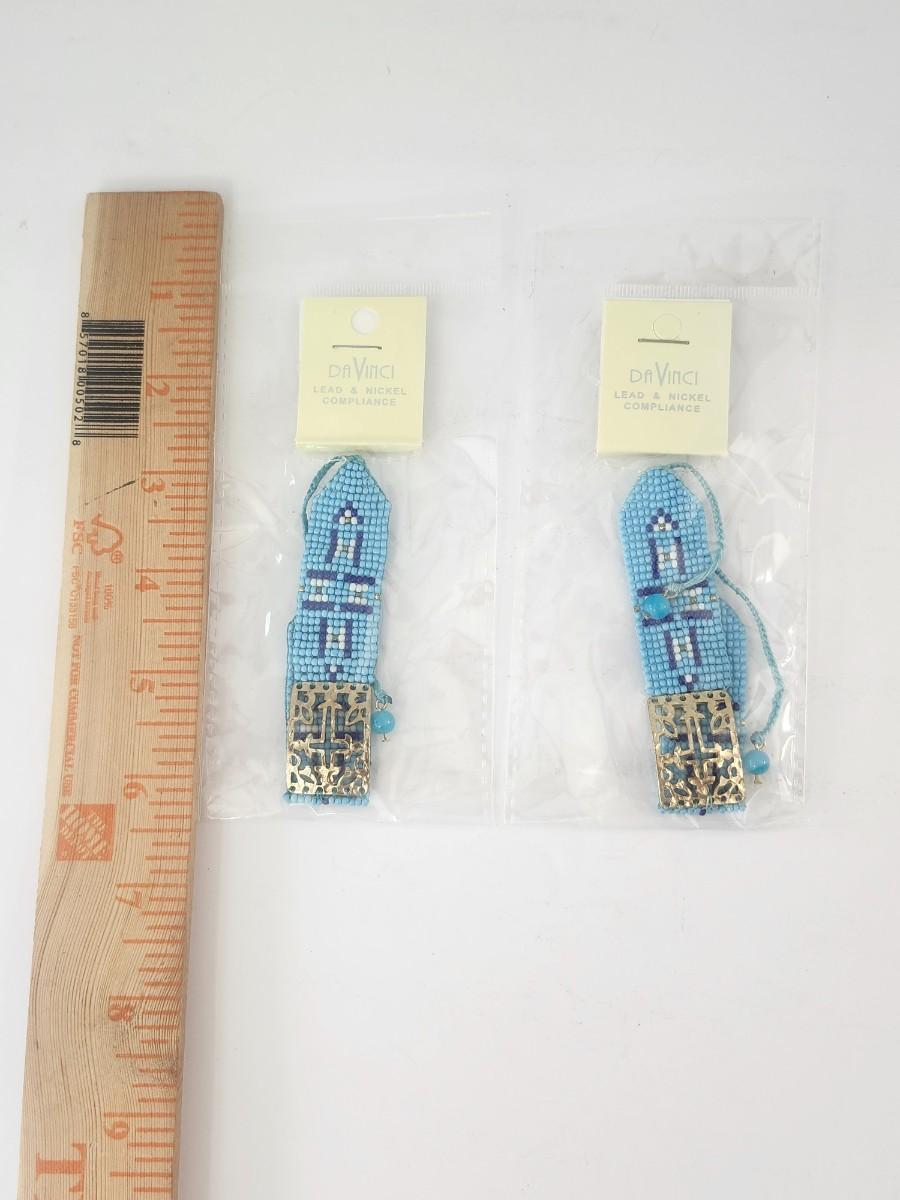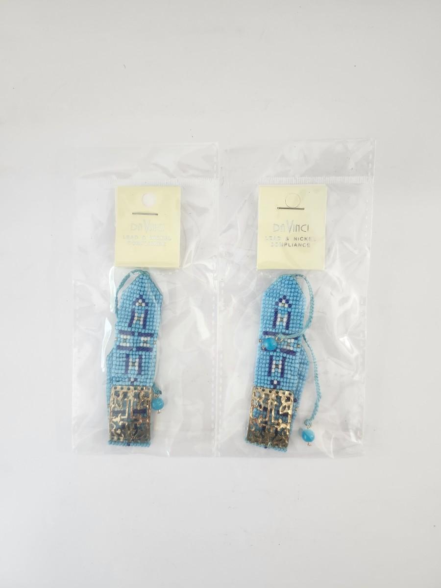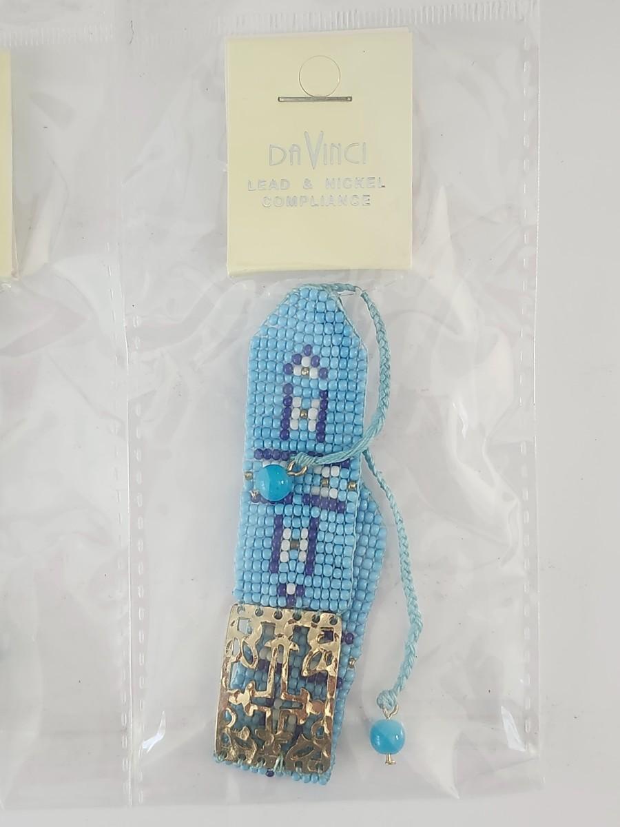 Beaded bracelet mounted on original Da Vinci card and sealed in protective packaging. Woven blue seed bead design with geometric patterning in lighter and darker blue tones. Features a gold tone openwork rectangular clasp with decorative cutout design and an adjustable tie closure finished with small blue bead accents. Marked lead and nickel compliance on card. All materials and details described strictly from visible characteristics only.