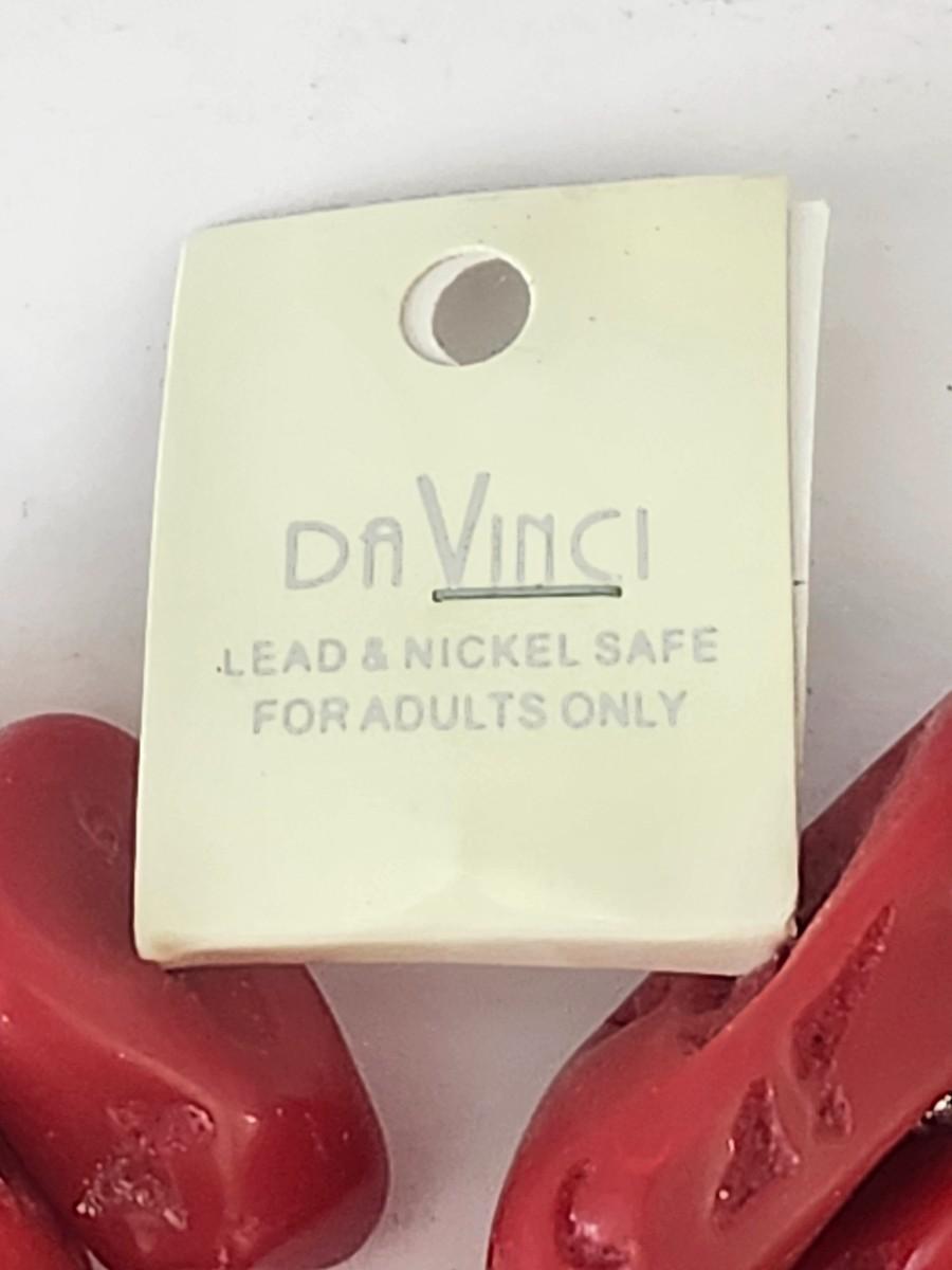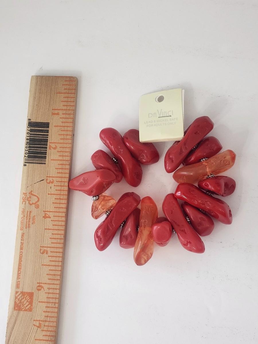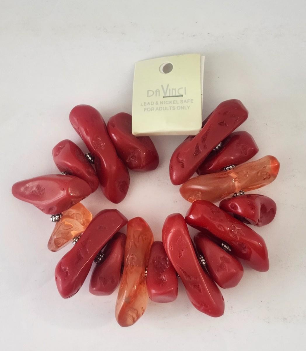 Vibrant stretch bracelet by Da Vinci featuring oversized sculpted resin stones in deep red and warm amber tones. Each piece has an organic, carved look with natural variations that give the bracelet strong visual texture and depth. Accented with small silver tone spacer details between stones for contrast and balance. Finished with original Da Vinci tag noting lead and nickel safe materials for adults only. A bold, fun statement bracelet designed to stand out on its own or stack beautifully with other pieces.
