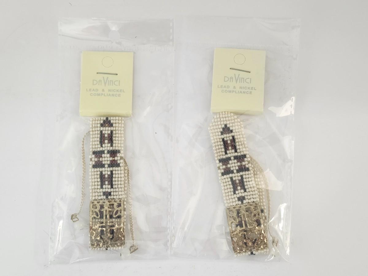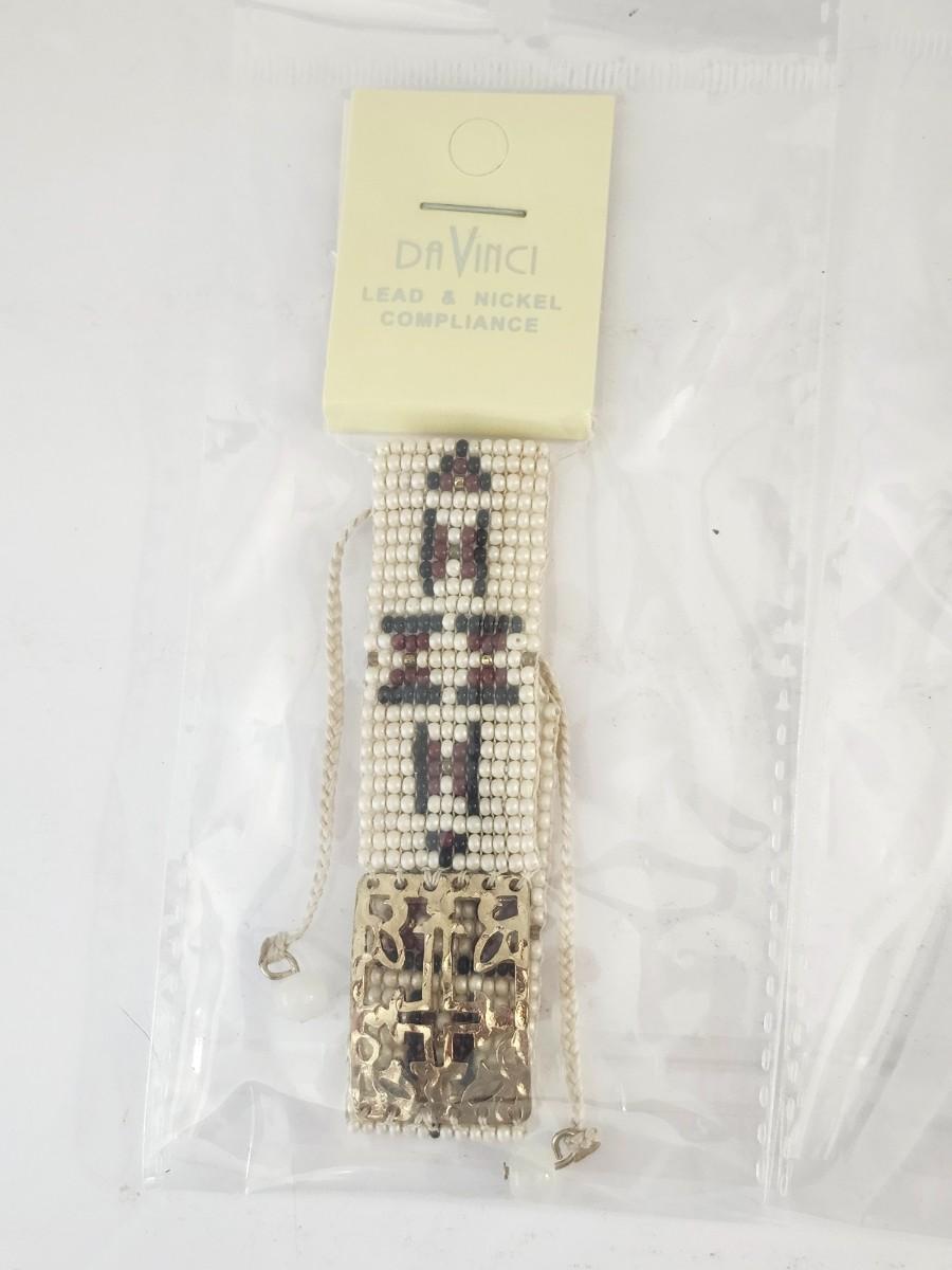 Beaded bracelet mounted on original Da Vinci card and sealed in protective packaging. Woven white seed bead design with a repeating geometric pattern in black and muted brown tones. Features a gold tone rectangular openwork clasp with decorative cutout detailing and an adjustable chain style closure. Marked lead and nickel compliance on card. Description based strictly on visible details only.