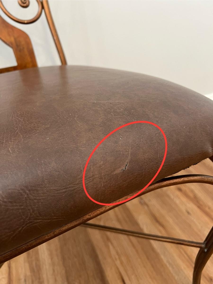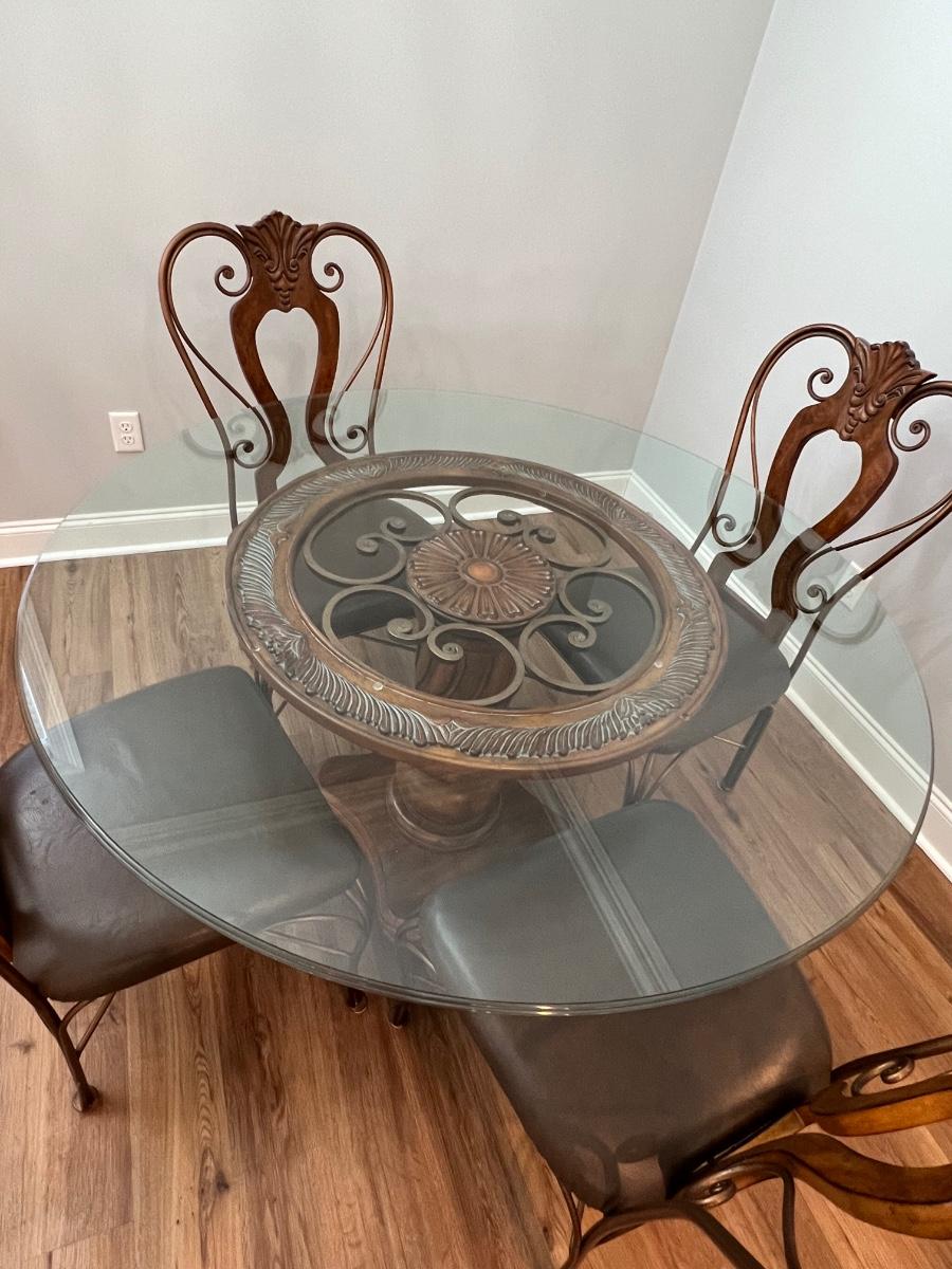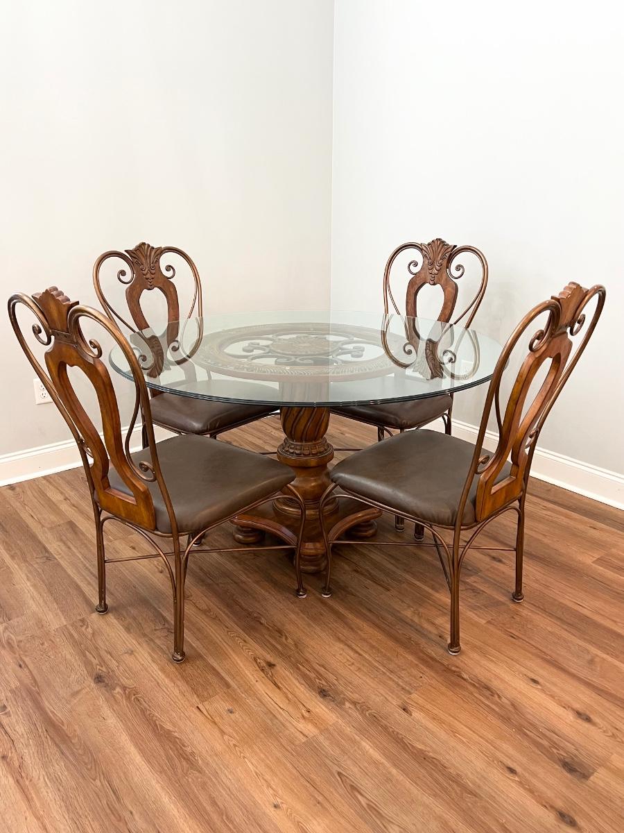Glass top has minor scratches from use ~ Seats on chairs are vinyl ~ 1 chair has minor rip on the seat & needs repair, as the back of the chair at the bottom is coming apart and needs repair, see photos ~ Table = 30.6” H x 53.5” Round ~ Chairs = 42.5” H x 22” W x 22.5” D