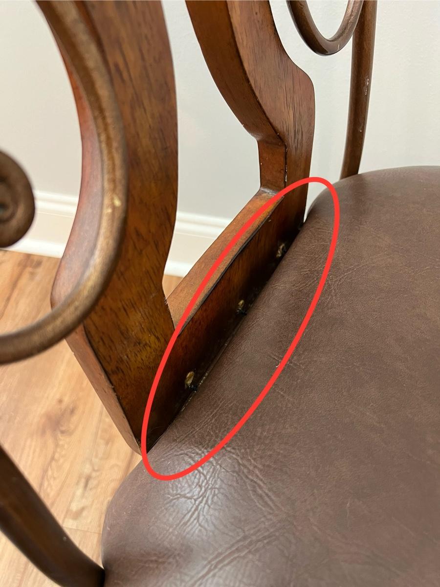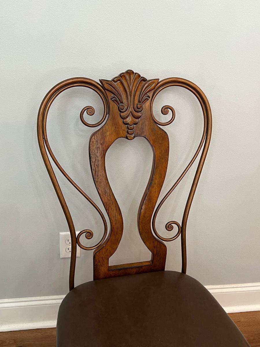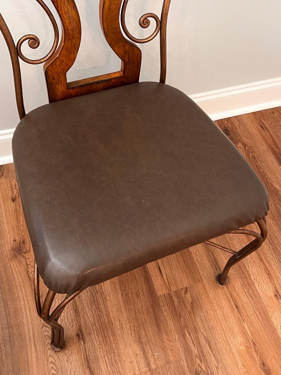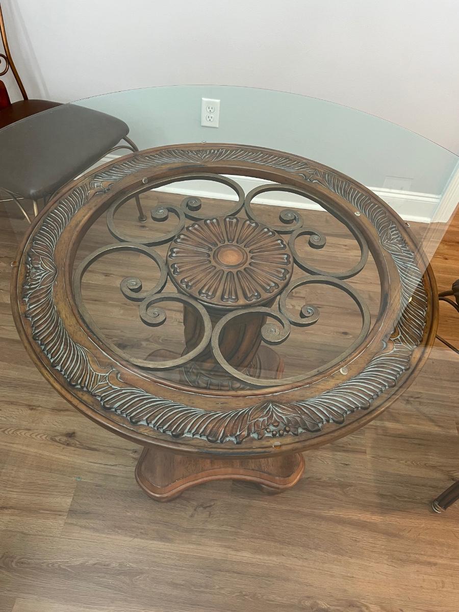 Glass top has minor scratches from use ~ Seats on chairs are vinyl ~ 1 chair has minor rip on the seat & needs repair, as the back of the chair at the bottom is coming apart and needs repair, see photos ~ Table = 30.6” H x 53.5” Round ~ Chairs = 42.5” H x 22” W x 22.5” D