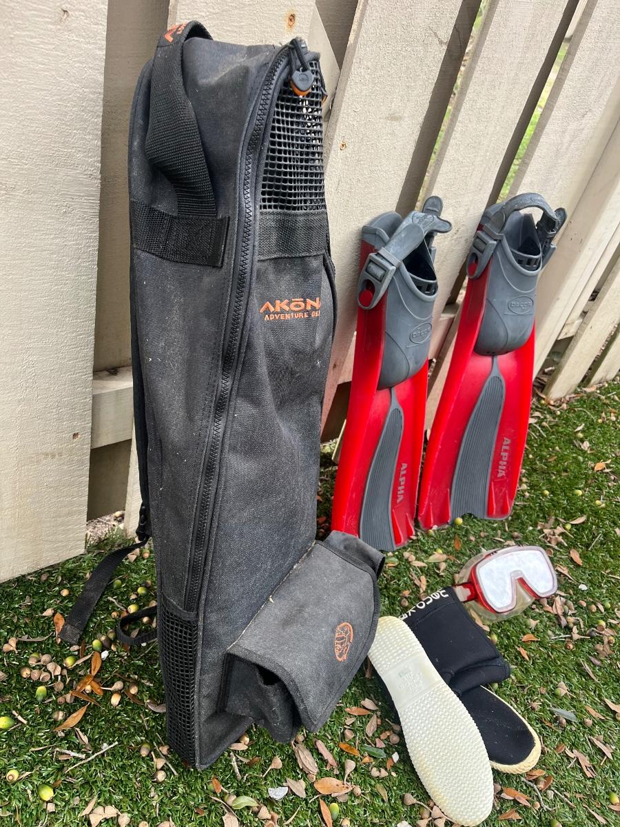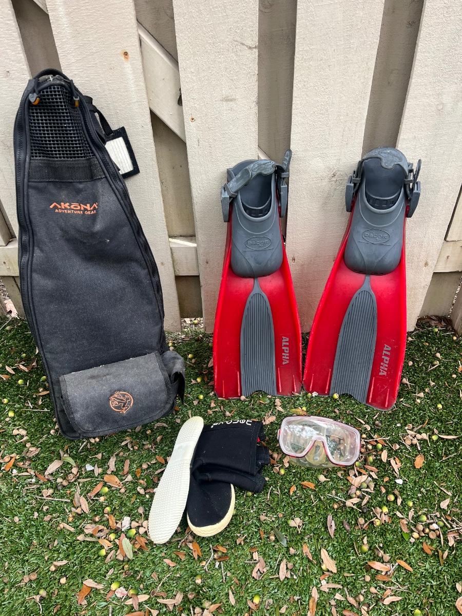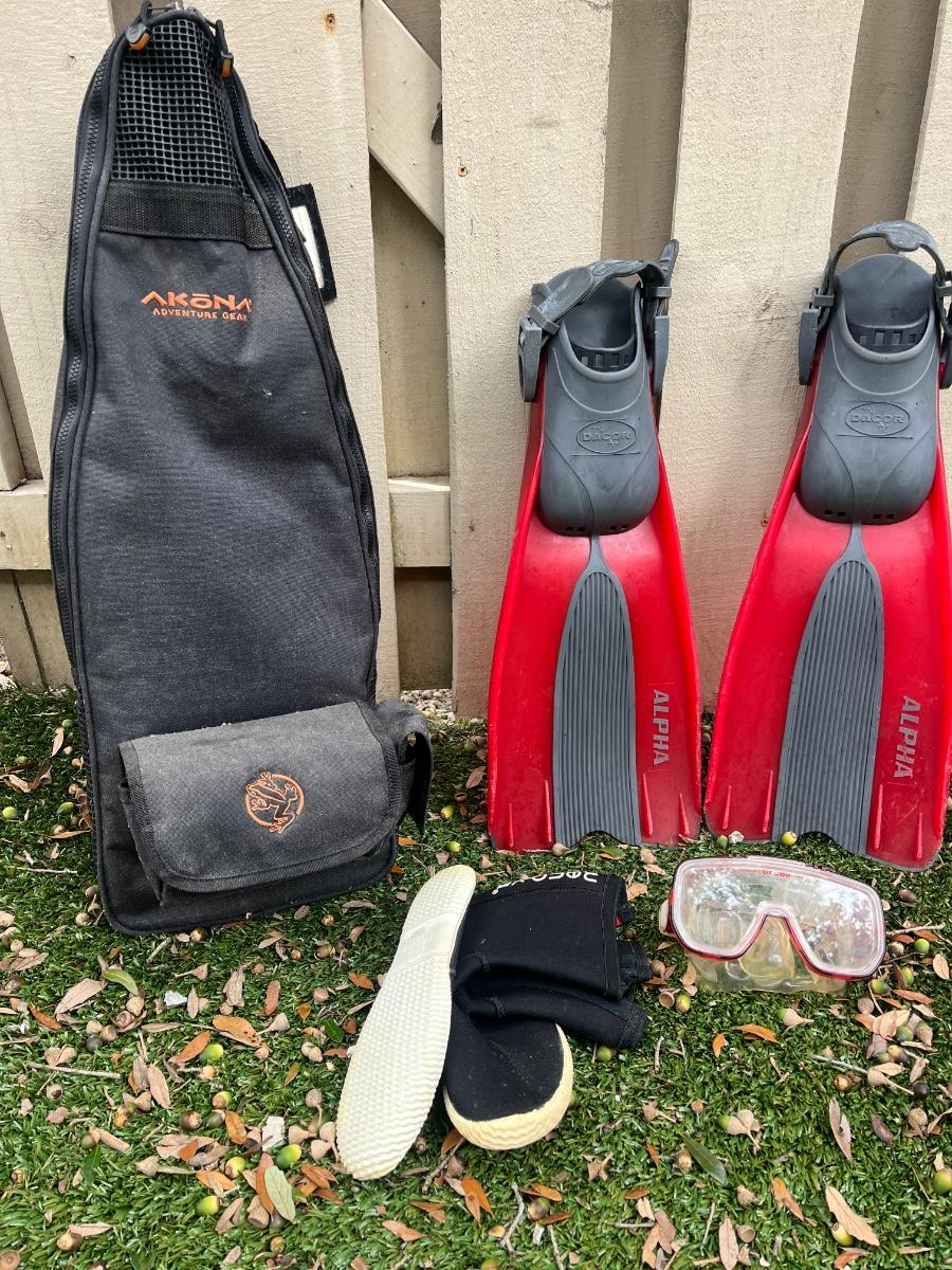 Dacor fins, goggles, Akona snorkel/scuba carry case for fins, goggles, boots, defogger spray and more