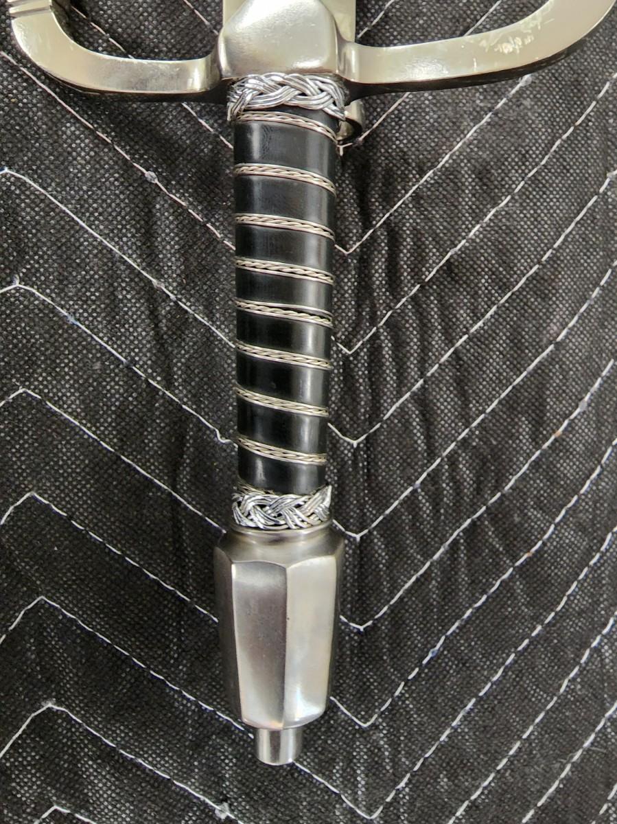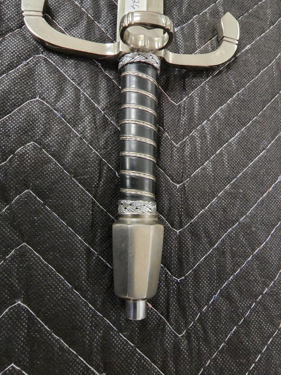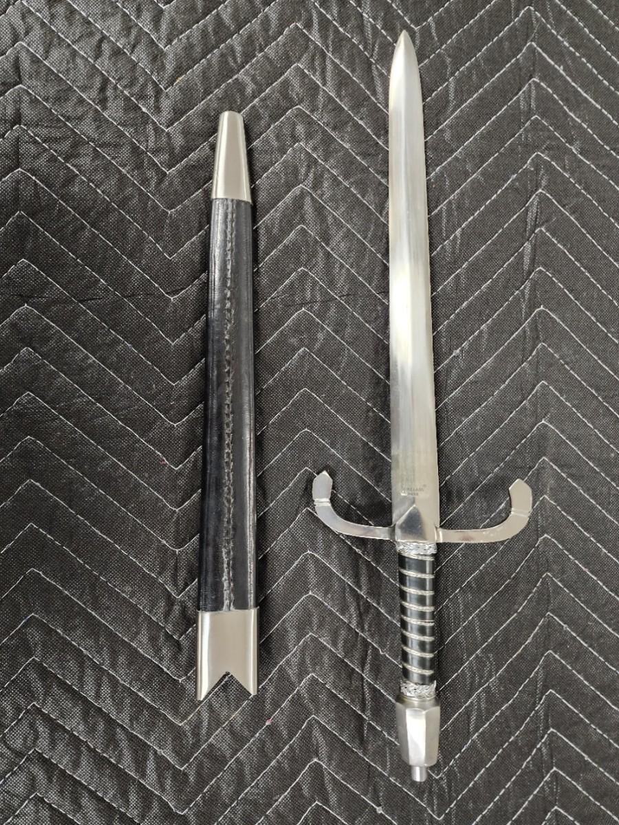 Spanish Dagger. Left Hand Companion Renaissance. Blade is short and straight and 12 1/2" long, 1 1/8" wide, and narrows down to 7/8" at the tip. The bone handle is 5 3/8" and wire wrapped with a small knuckle guard, quillon, and a single ring. The scabbard is wood wrapped with leather, a silver tip on the end and silver on the top. Excellent condition. Replica.