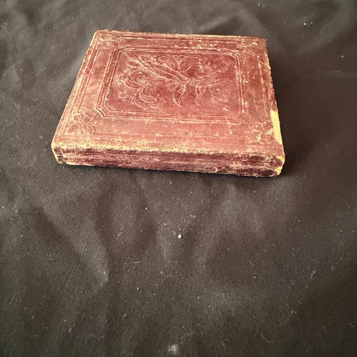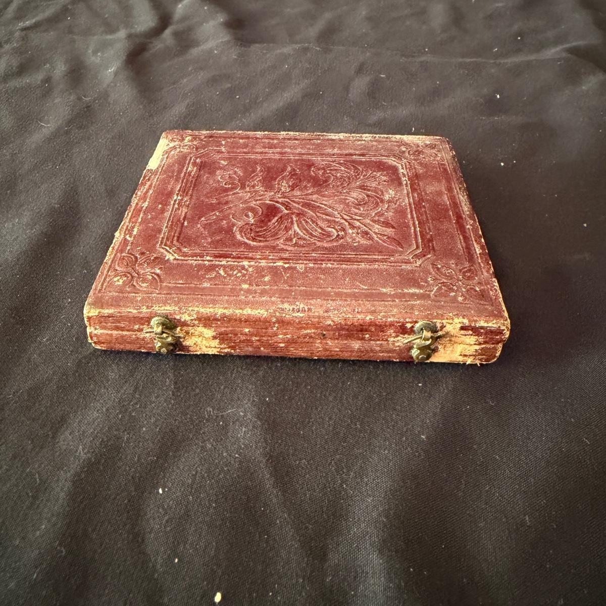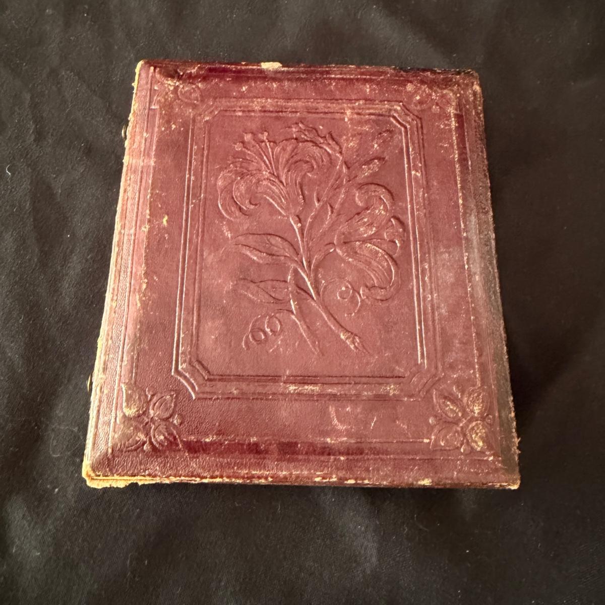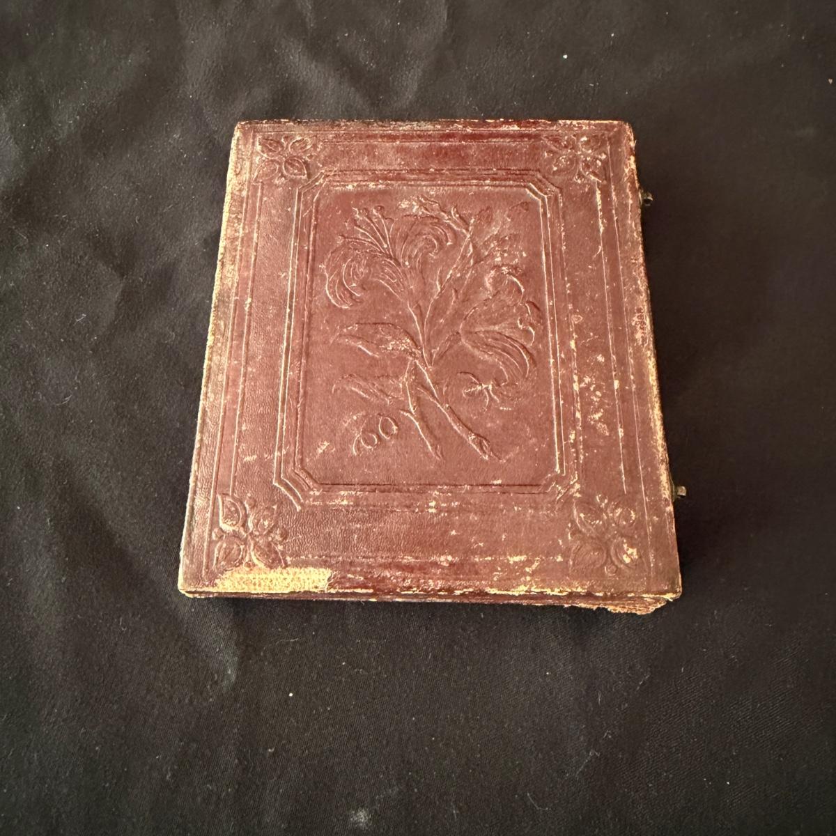 Lot includes what appears to be a Daguerreotype of a young woman in an embossed leather book type case. Piece measures 3.25” x .50” x 3.75”H when closed.