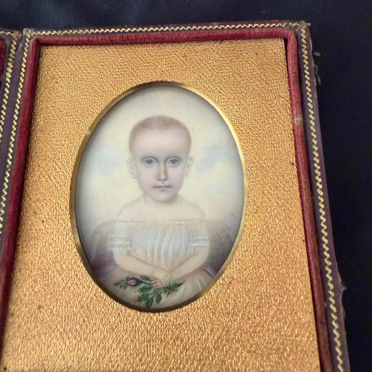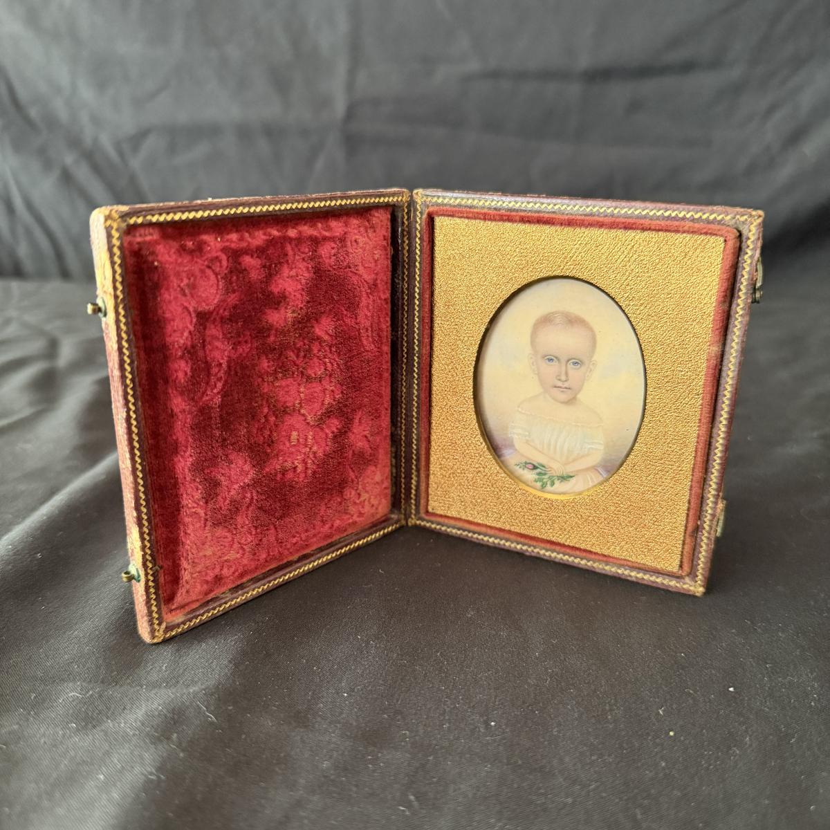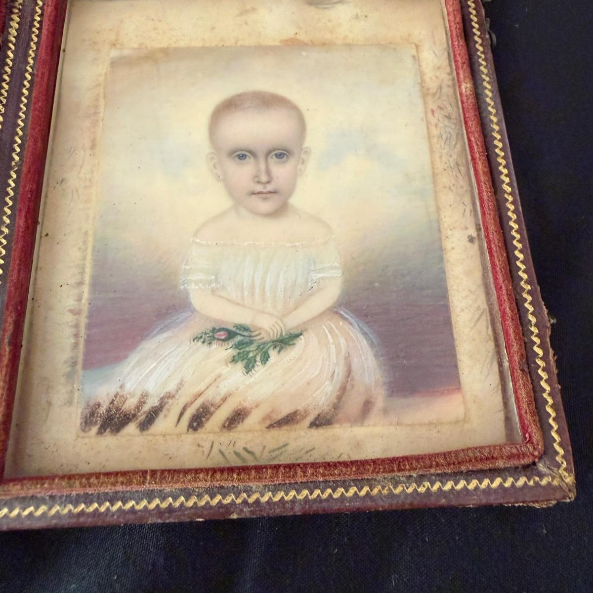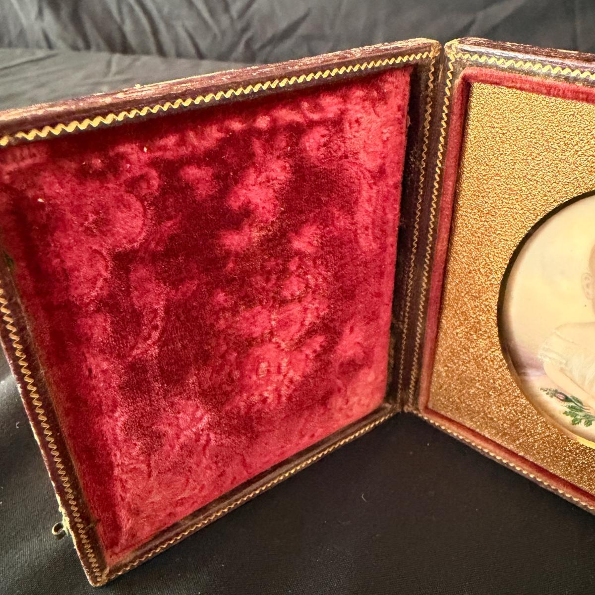 Lot includes what appears to be a Daguerreotype of a young woman in an embossed leather book type case. Piece measures 3.25” x .50” x 3.75”H when closed.