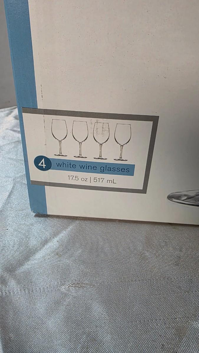 This is a boxed set of four Dailyware stemmed white wine glasses, presented in the original retail packaging. The glasses feature a clean, modern profile with a gently rounded bowl and slender stem, designed for everyday use while still offering an elegant table presentation. The packaging indicates a 17.5 ounce (517 mL) capacity per glass, making them well-suited for white wine, spritzers, or light red pours where aroma and clarity are appreciated.