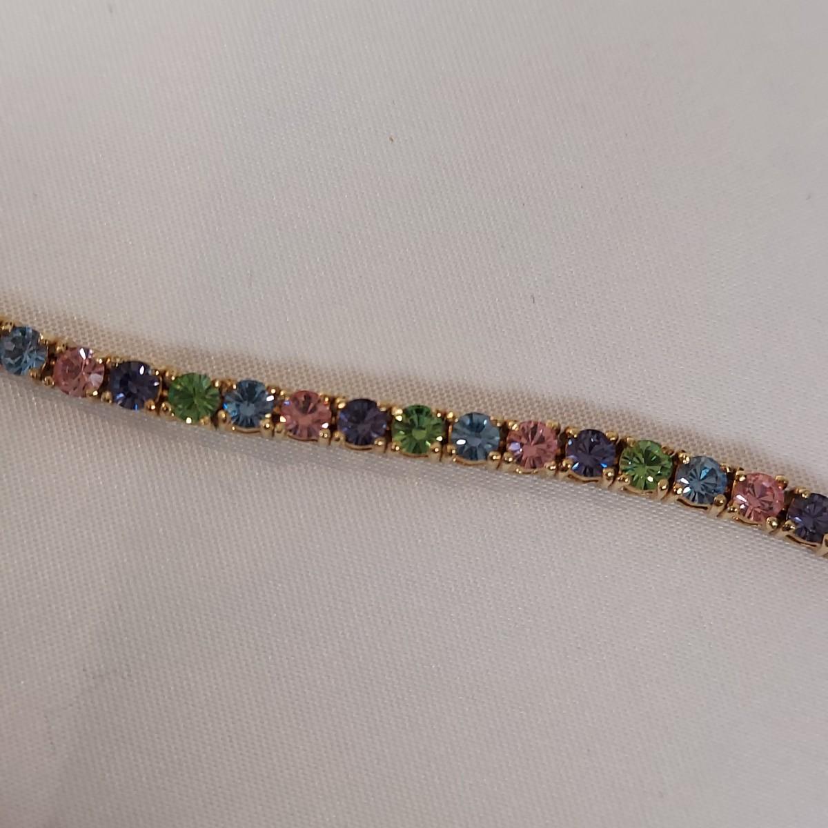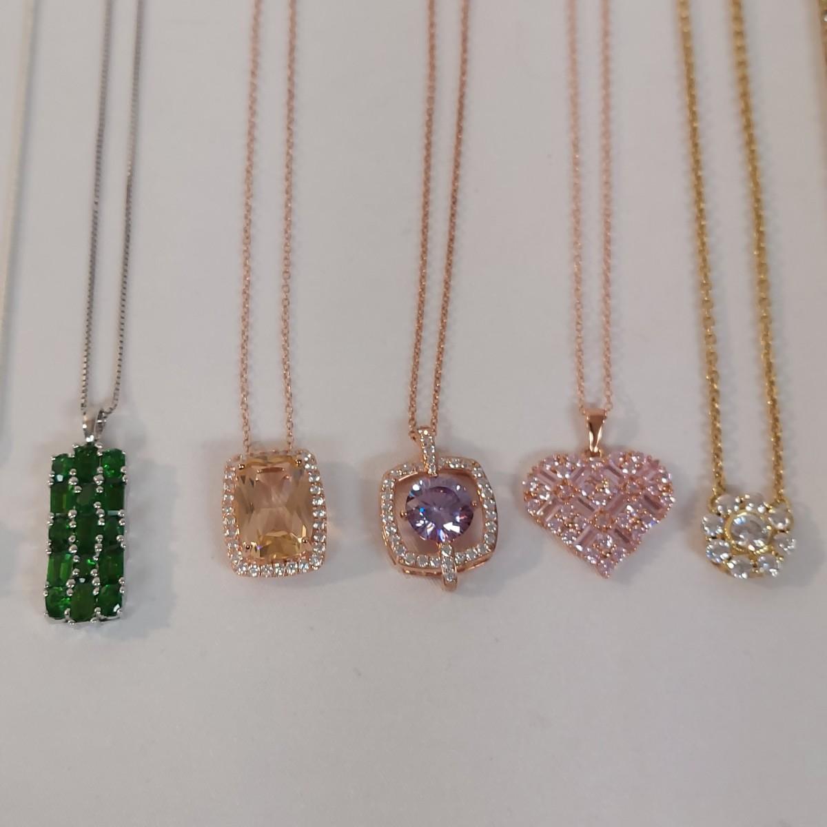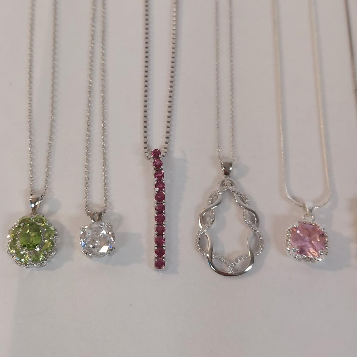 Several pieces of delicate jewelry with colored stones. Lot includes 10 necklaces, one bracelet and three stackable rings. The necklaces range from 16-18" long. The rings and bracelet appear to be a set. Some items are stamped .925. Some stones appear to be glass simulants while others may be semi precious stones. Please see photos for all markings found. We cannot guarantee the authenticity of the gemstones. All sales are final. No returns or refunds. Please bid accordingly.