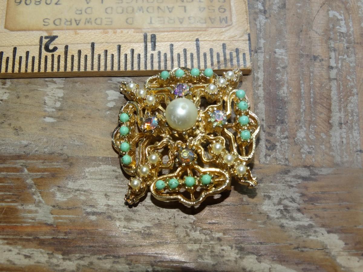 Dainty Gold Tone Pearls & Rhinestone Brooch