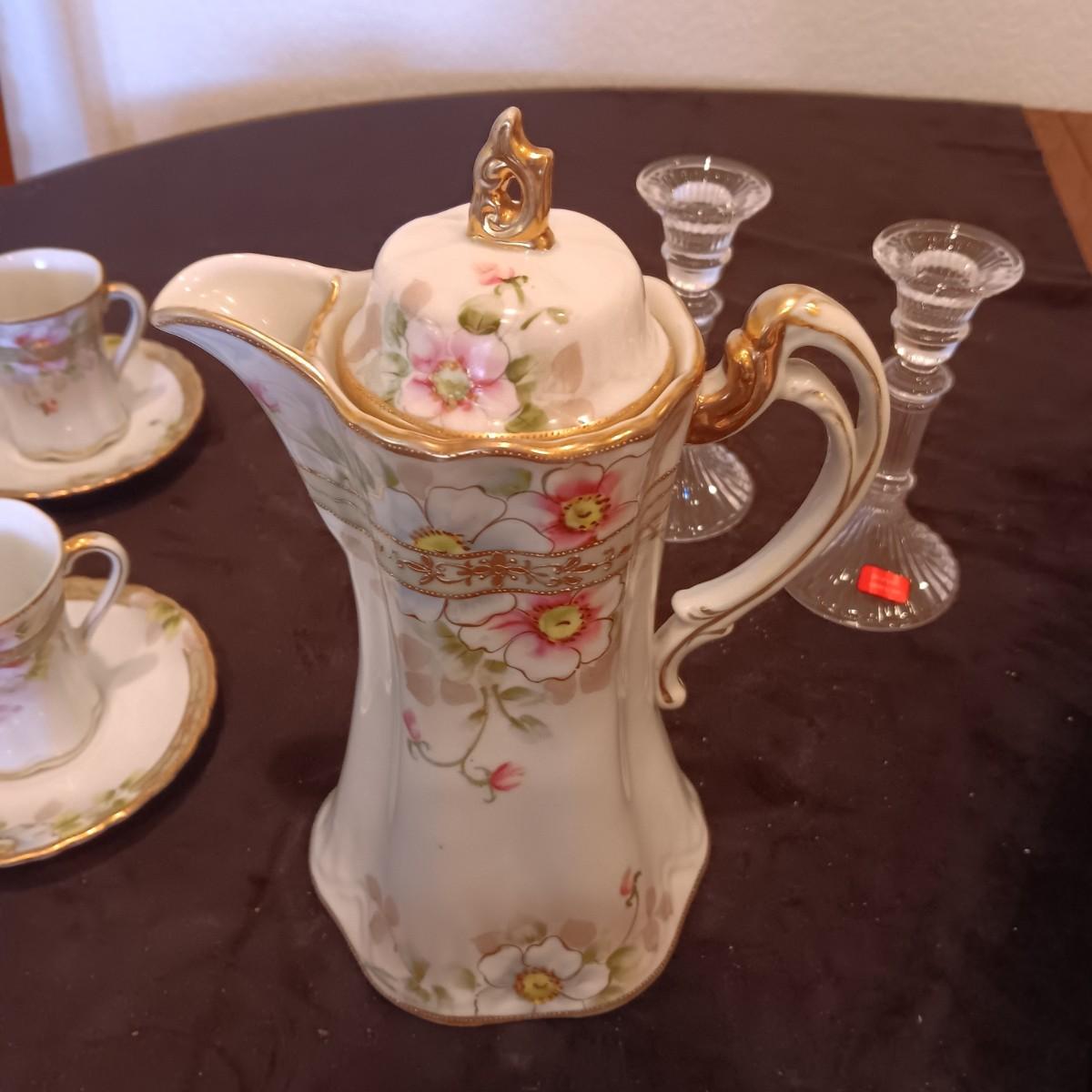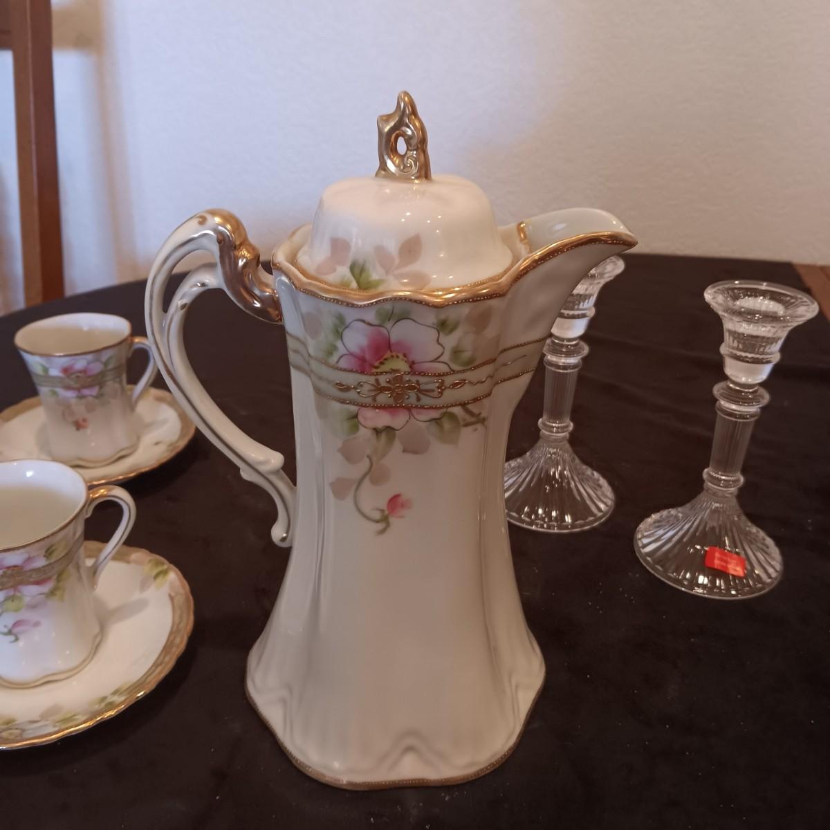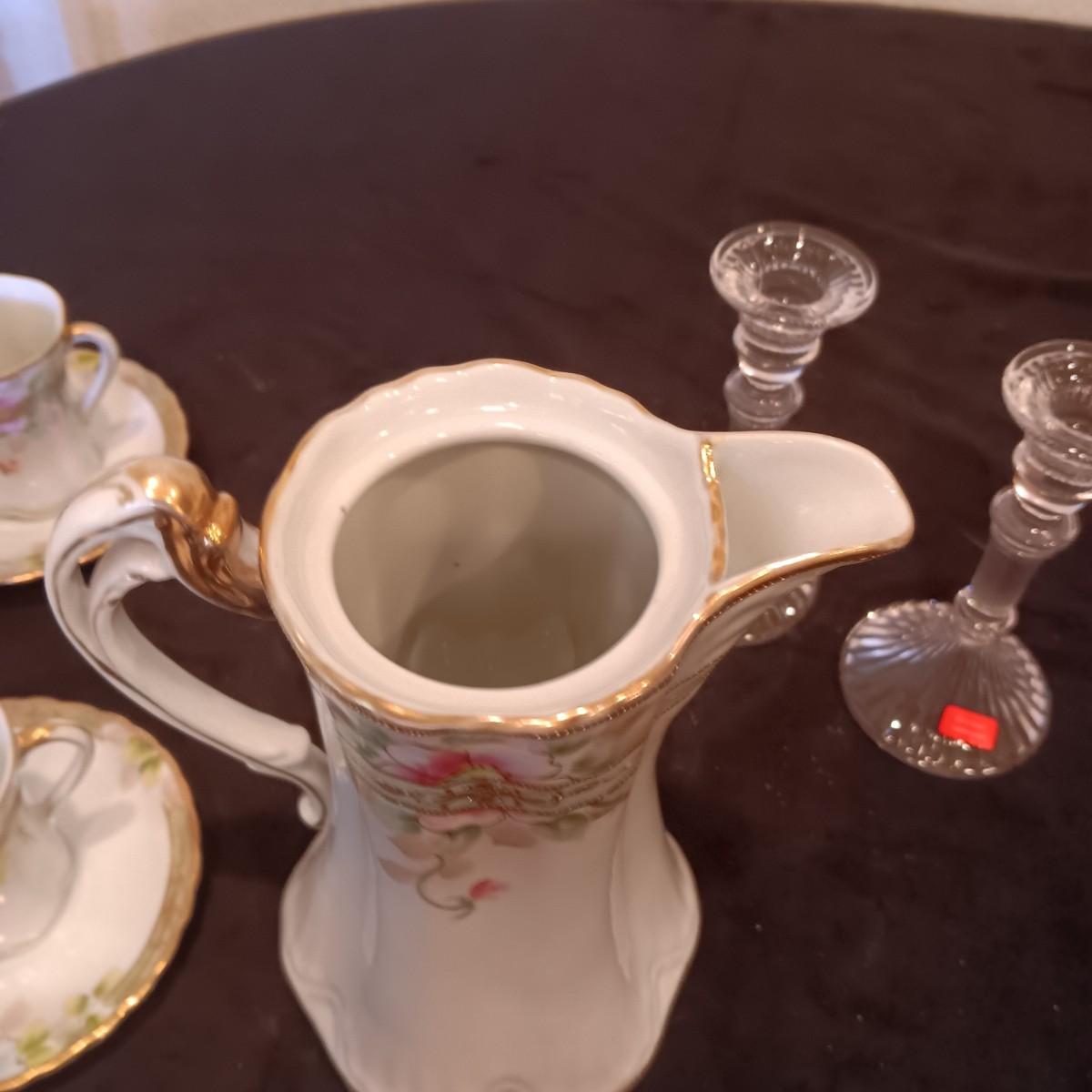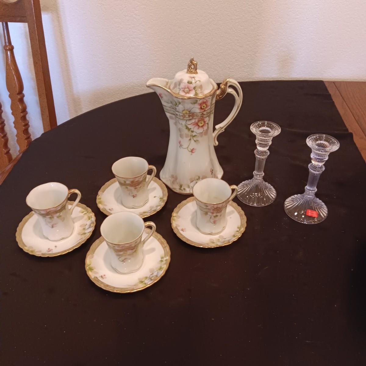 DAINTY HAND PAINTED NIPPON TEAPOT W/CUPS AND SAUCERS PLUS GLASS CANDLESTICKS