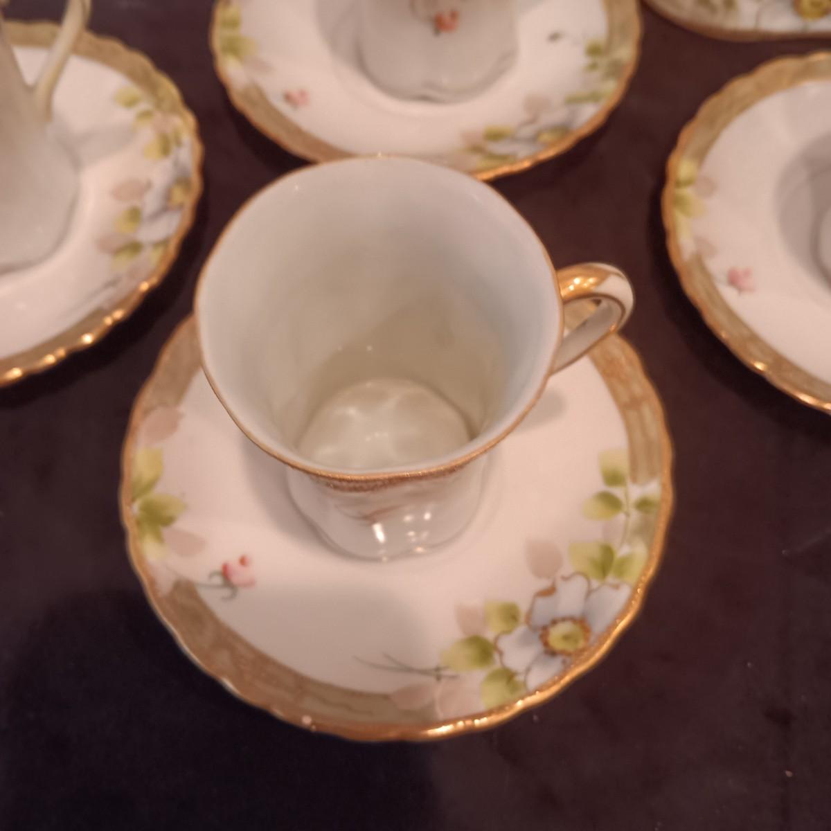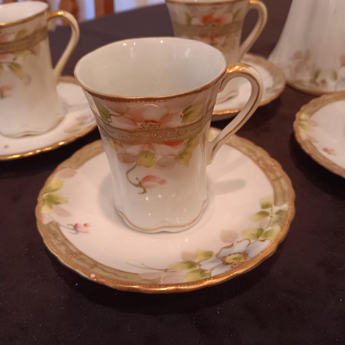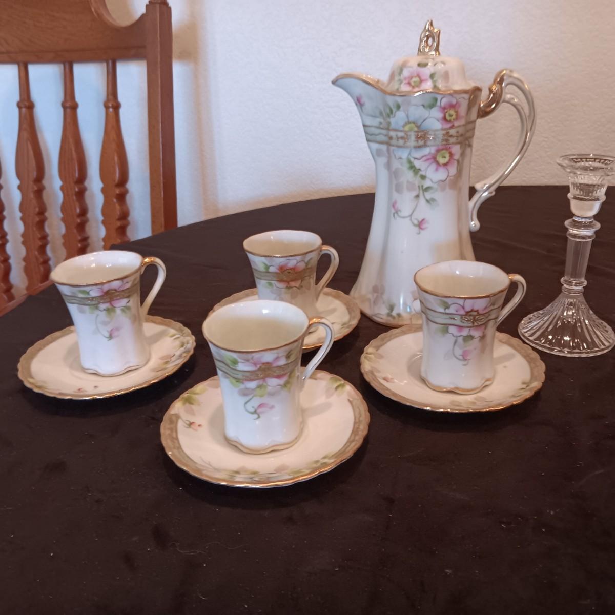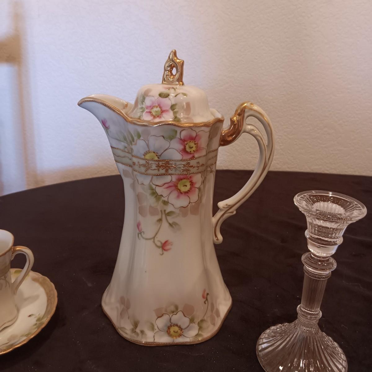 DAINTY HAND PAINTED NIPPON TEAPOT W/CUPS AND SAUCERS PLUS GLASS CANDLESTICKS