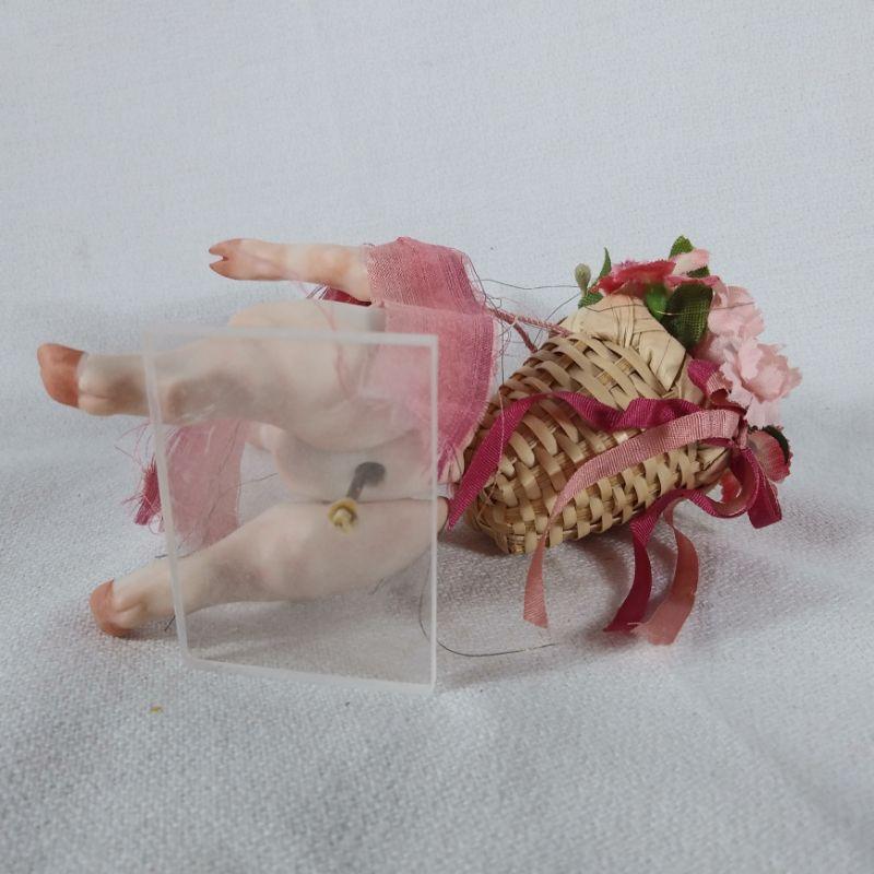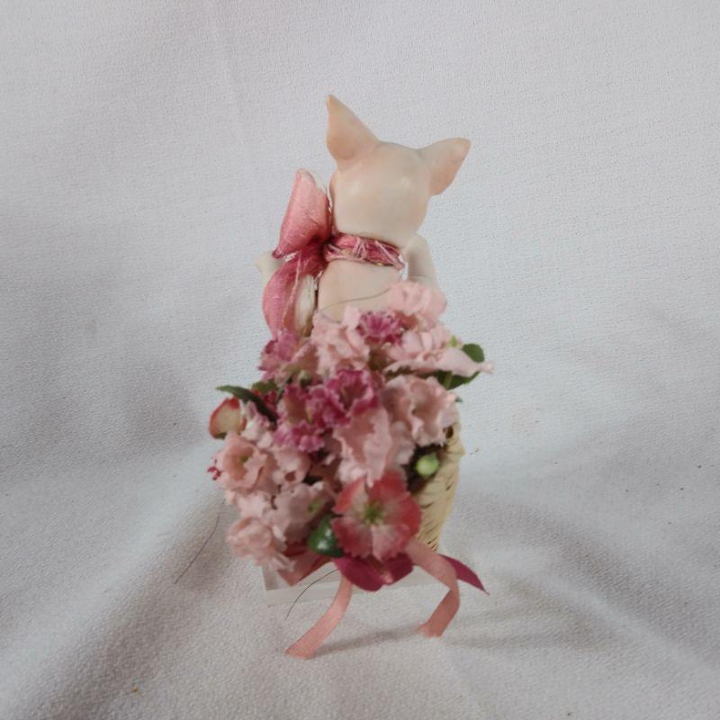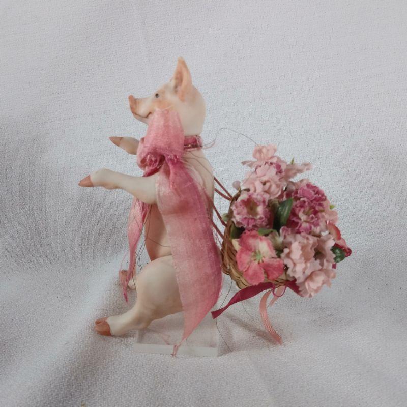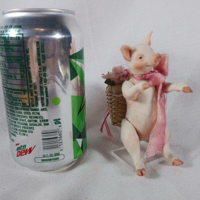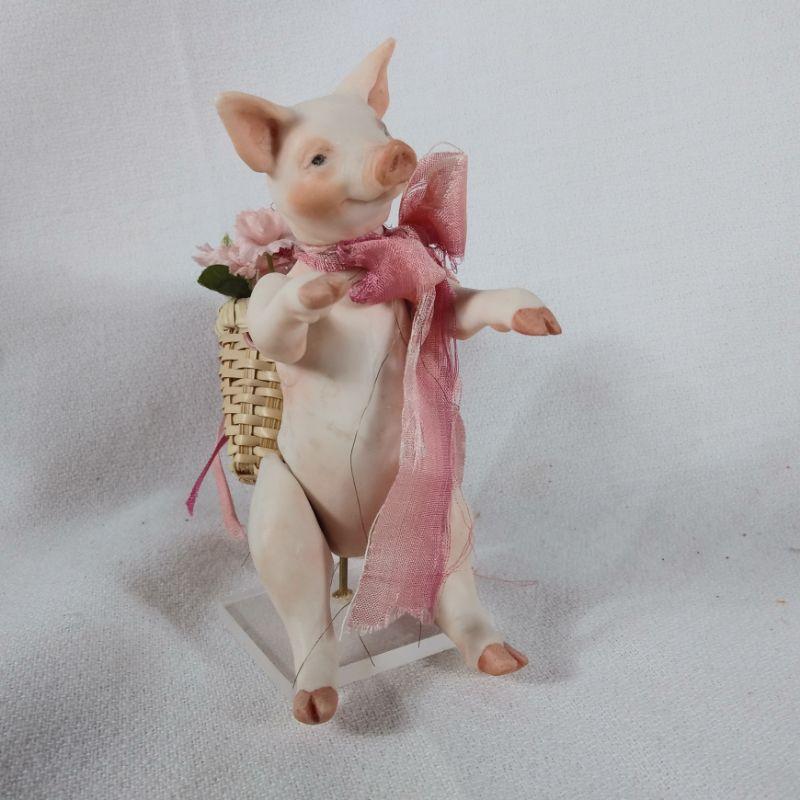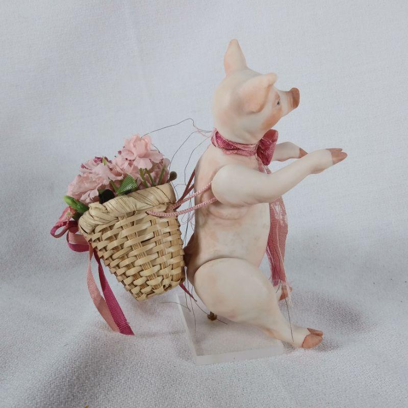 This is a very sweet, ceramic "Dainty Little Pig" secured on an acrylic stand. Ribbon around her neck is starting to shred from age (those are threads you see NOT cracks). She is carrying a basket of flowers on her back. Arms and legs are jointed and move. She is 4 1/2-inches tall X 2-inches wide and about 2-inches deep. How can you resist that face? Sooo Precious!