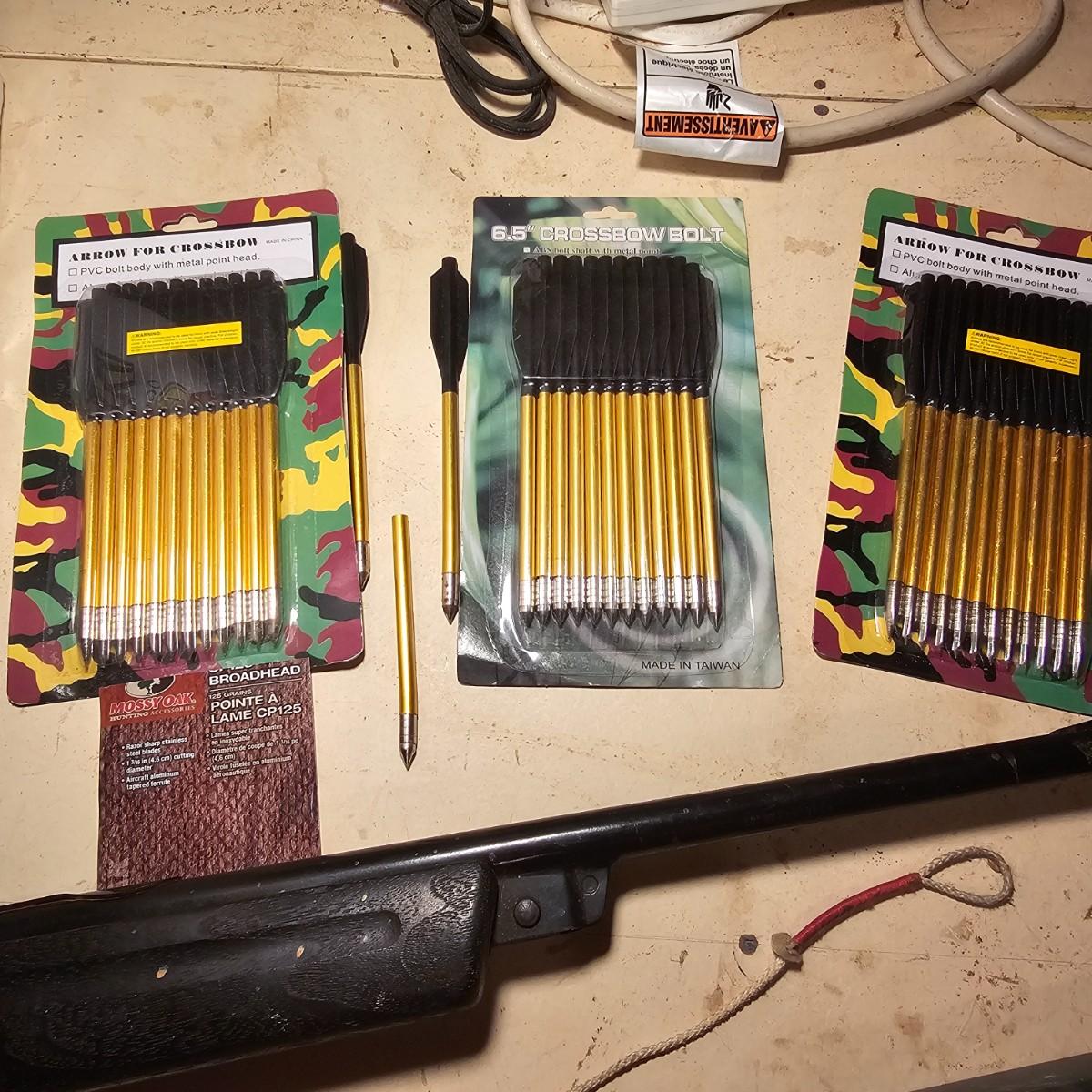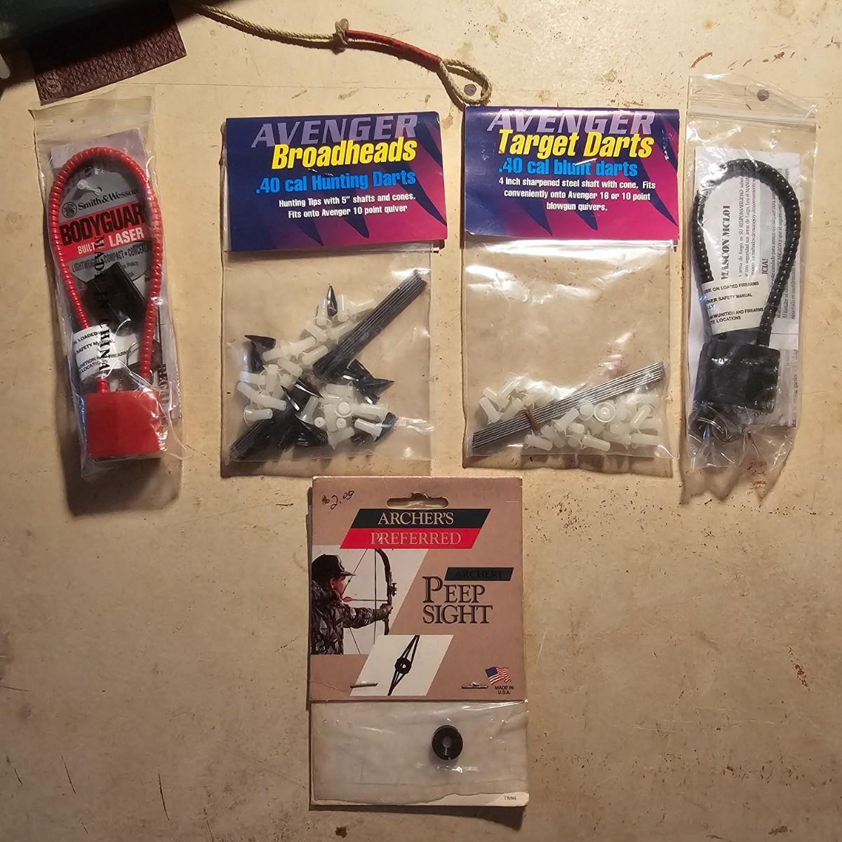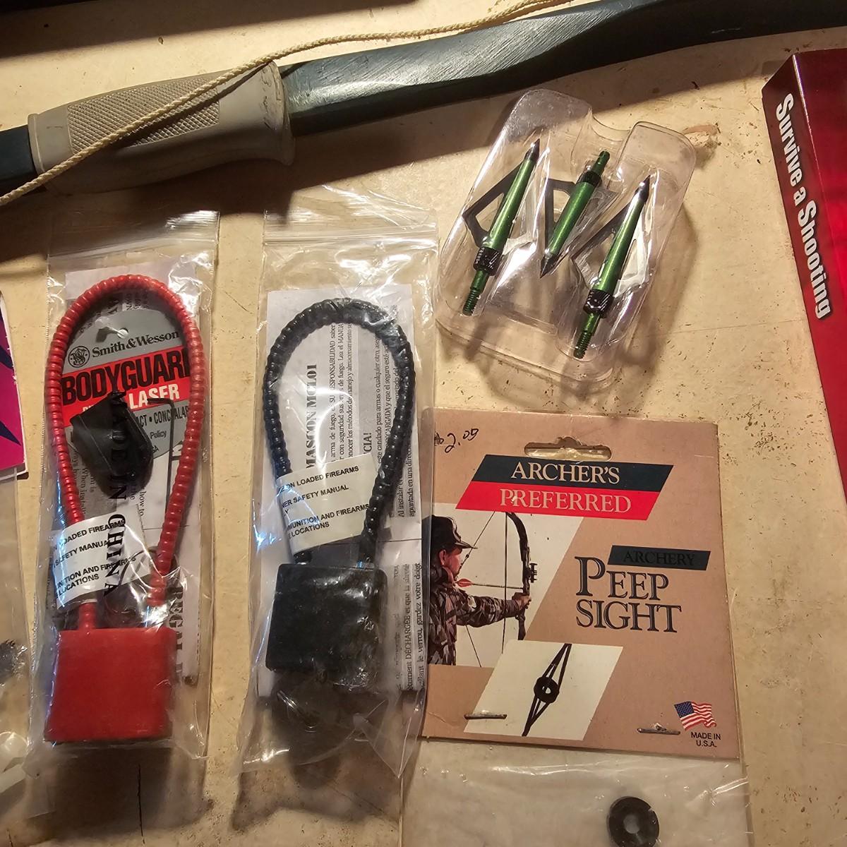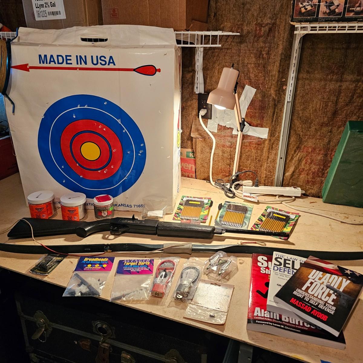 One Daisy Powerline 856 pump pellet gun, .177 caliber. Plastic stock, some discoloring on barrel. Safety button is missing. Shoots pellets and BBs. No ammo included. Also, one 35# pull fiberglass recurve bow w/string and some other archery accessories. Small bolts for a crossbow, some broadhead hunting points and target points. No arrows included. Two pistol locks with keys, three books on self-defense and also three containers to make exploding targets. One 24" x 12" x 24"H foam archery target. See photos for details. Local pickup only.