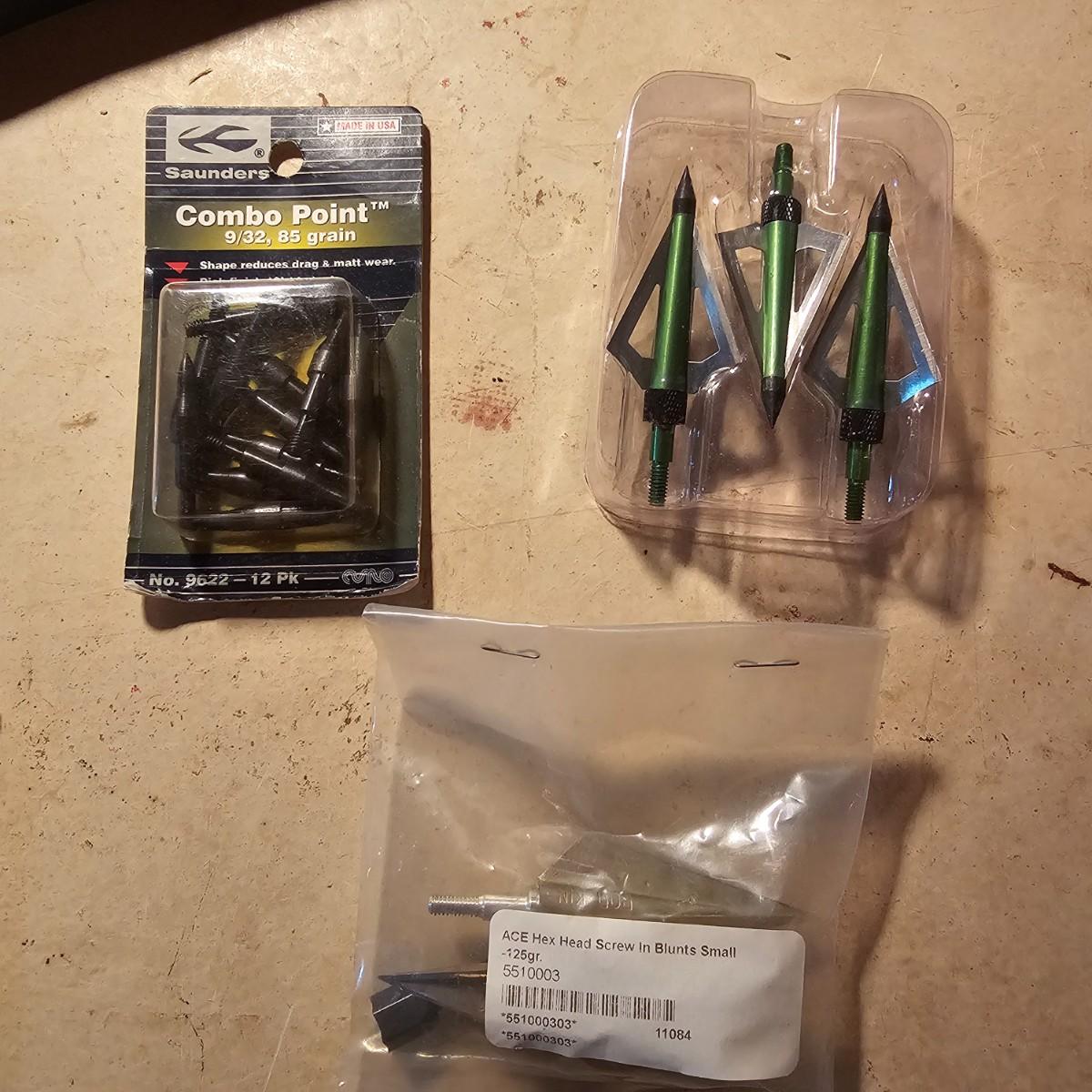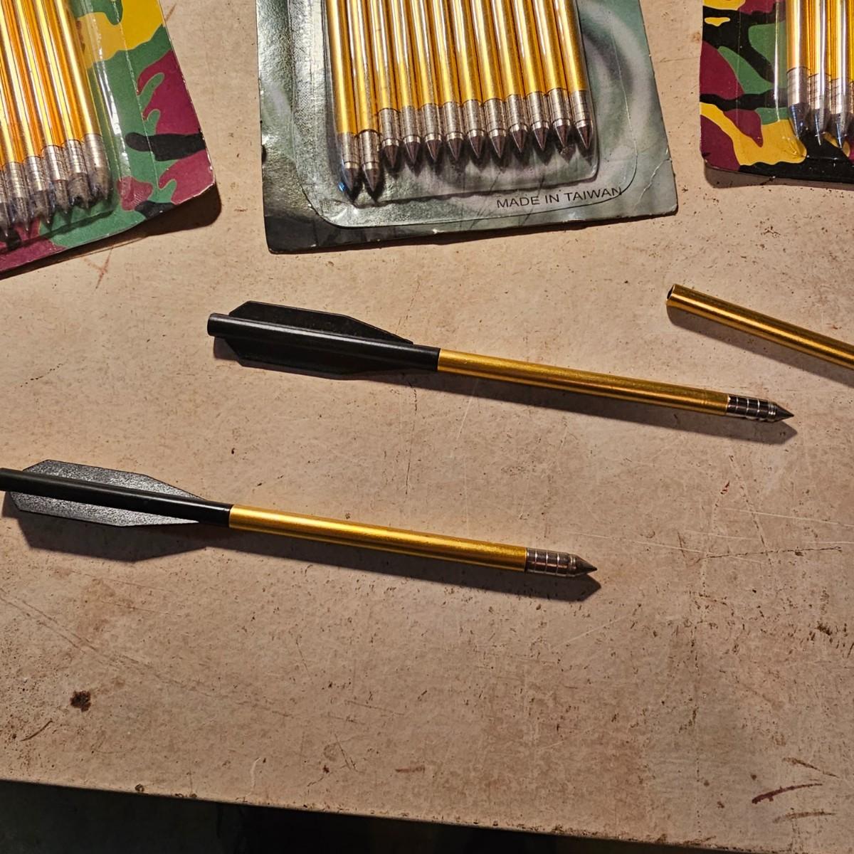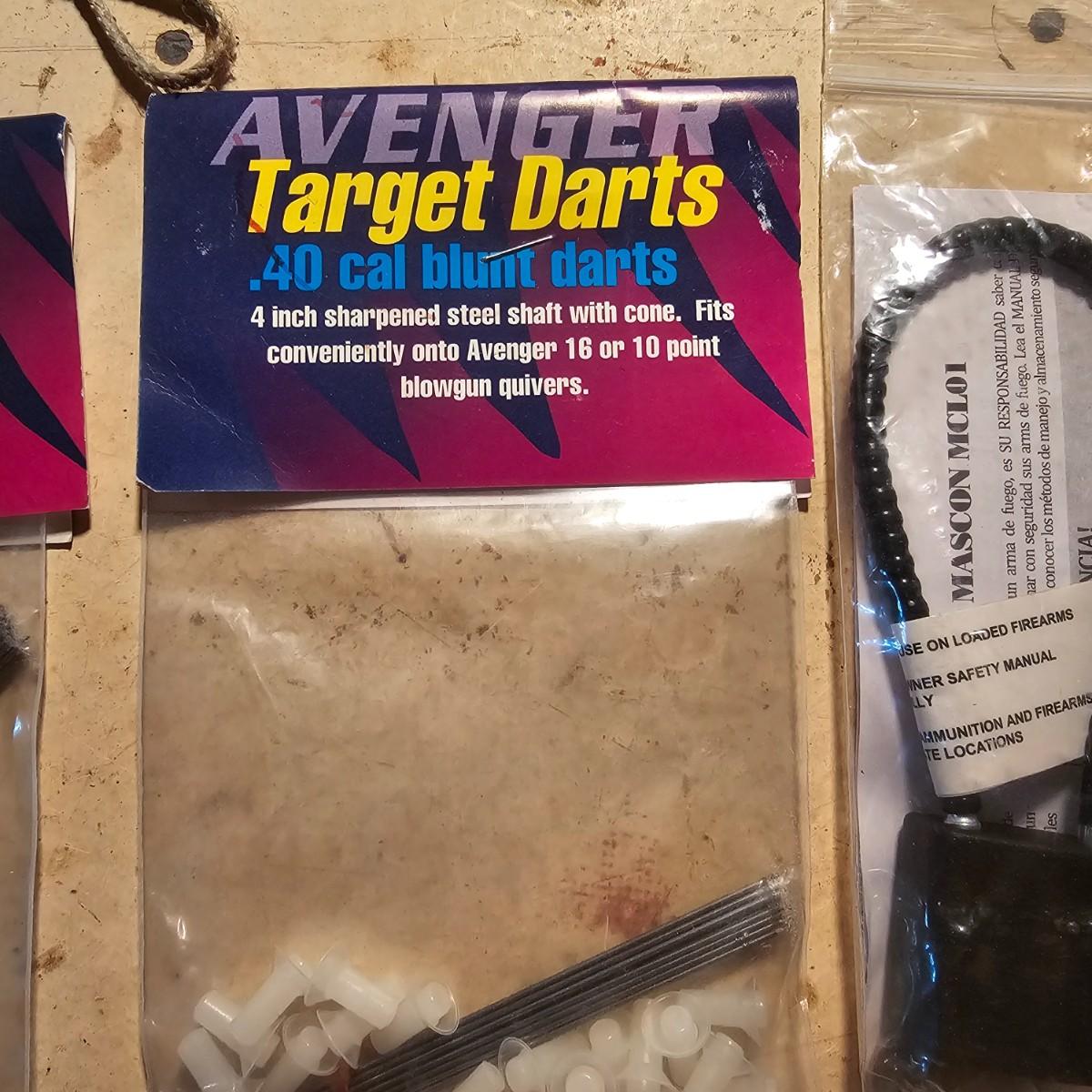 One Daisy Powerline 856 pump pellet gun, .177 caliber. Plastic stock, some discoloring on barrel. Safety button is missing. Shoots pellets and BBs. No ammo included. Also, one 35# pull fiberglass recurve bow w/string and some other archery accessories. Small bolts for a crossbow, some broadhead hunting points and target points. No arrows included. Two pistol locks with keys, three books on self-defense and also three containers to make exploding targets. One 24" x 12" x 24"H foam archery target. See photos for details. Local pickup only.